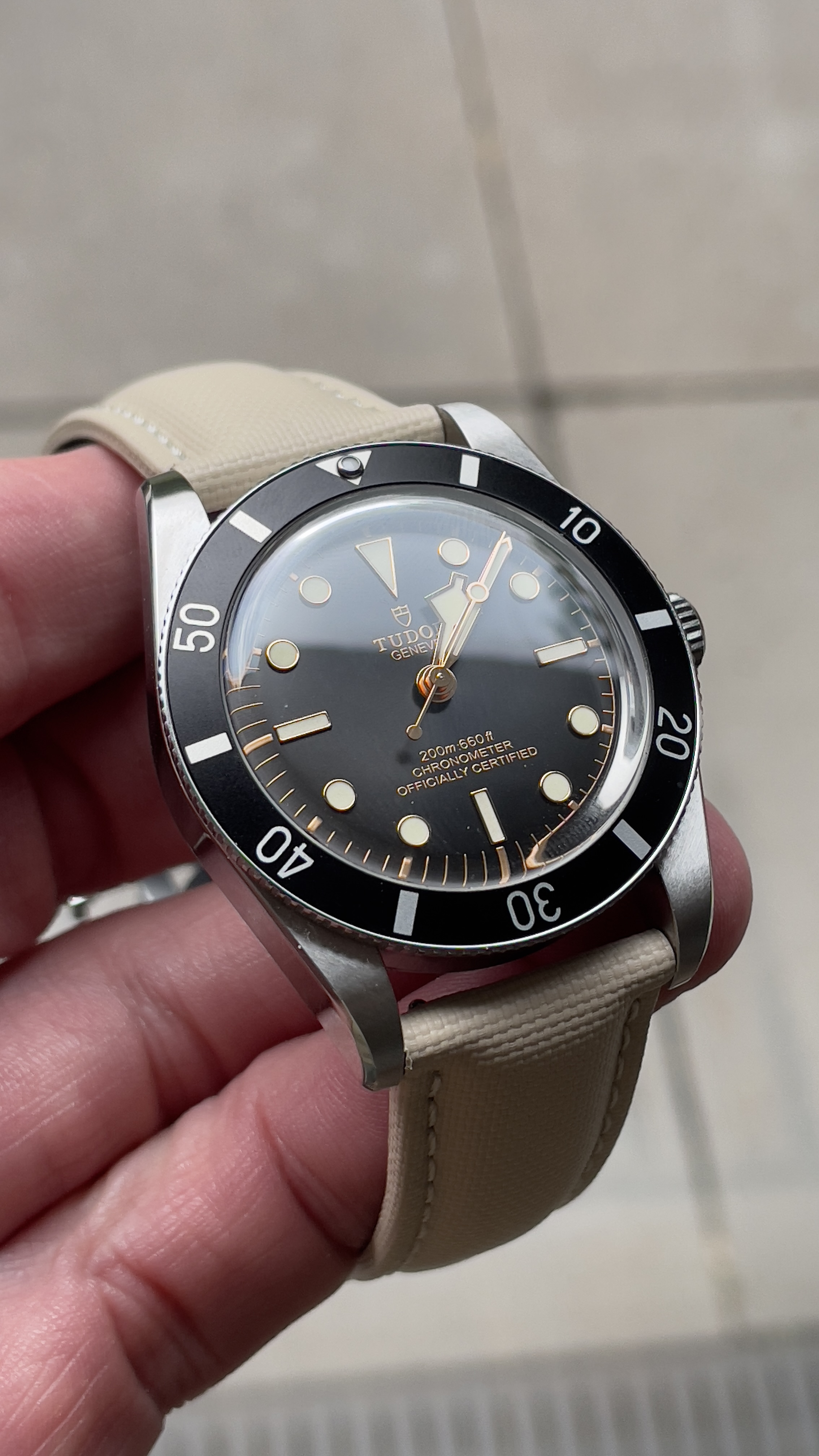 Ik had mijn 54 op tropic, maar ik moet zeggen dat ik OEM rubber bij Tudor/ rolex icm een mooie sluiting met snelverstelling en endlinks een heel stuk luxer vind uitzien.