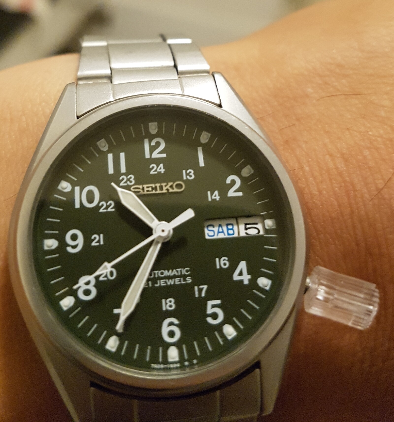 Beschadigde Seiko logo vervangen en upgrade van 7s26 naar NH36. Moet nog een passend kroontje scoren. De stem met plastic kroon die bij NH36 zit is eventueel te gebruiken