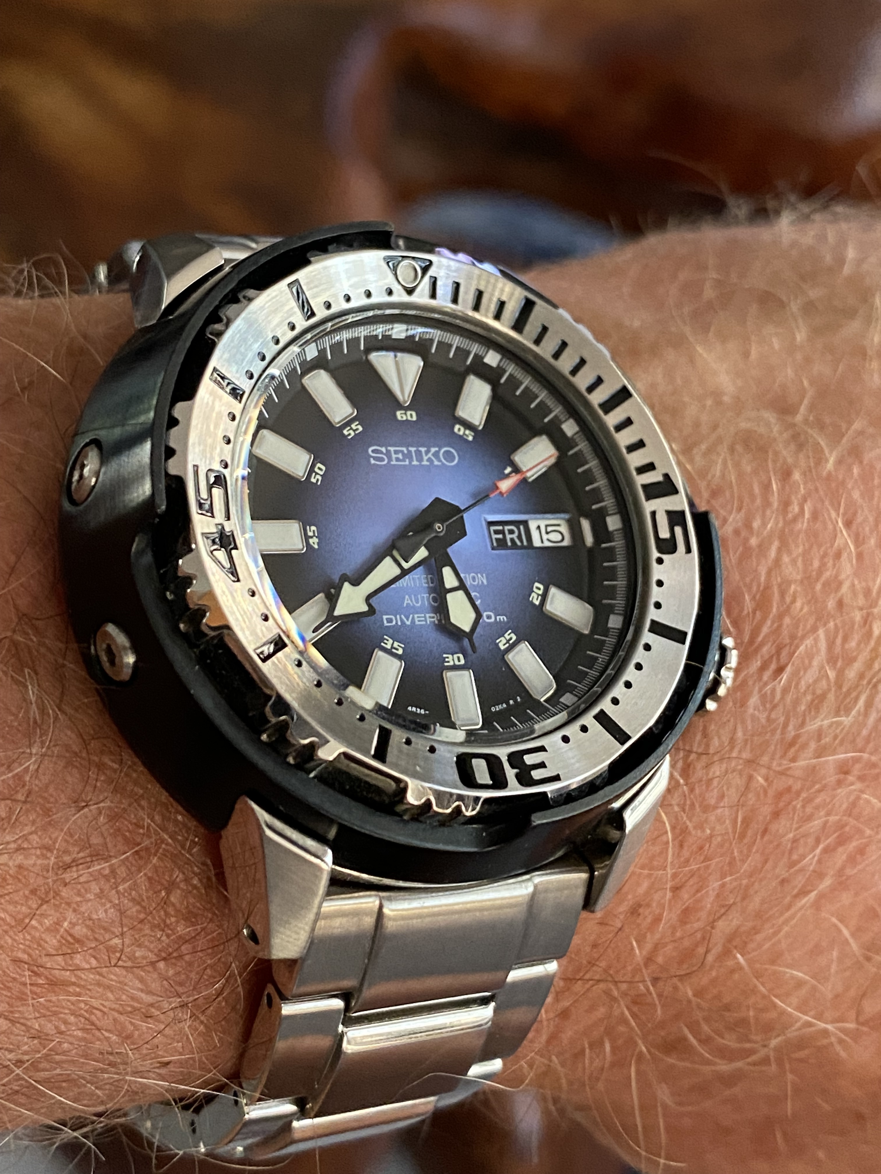 Een skx171, want die heeft zo’n mooie dial, met de 007 bezel en nato strap. Deze heb ik al zo’n 20 jaar en draag ik nog altijd veel. En als tweede een mod waar ik zelf het bandje bij bedacht heb. Hij kwam op een metalen band. Ben even het type Seiko kwijt. Ook alweer zeker zo’n 5 jaar geleden aangeschaft.