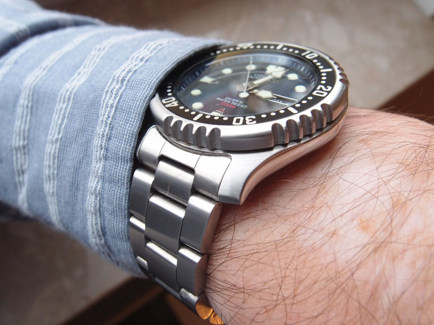 Dat is precies hetgeen wat maakt dat een groot horloge comfortabel kan dragen. Deze Fiffer was fors, maar droeg best prima door de aflopende zijden. (De Citizen NY reeks en Seiko mini turtle dragen ook erg goed om dezelfde reden)