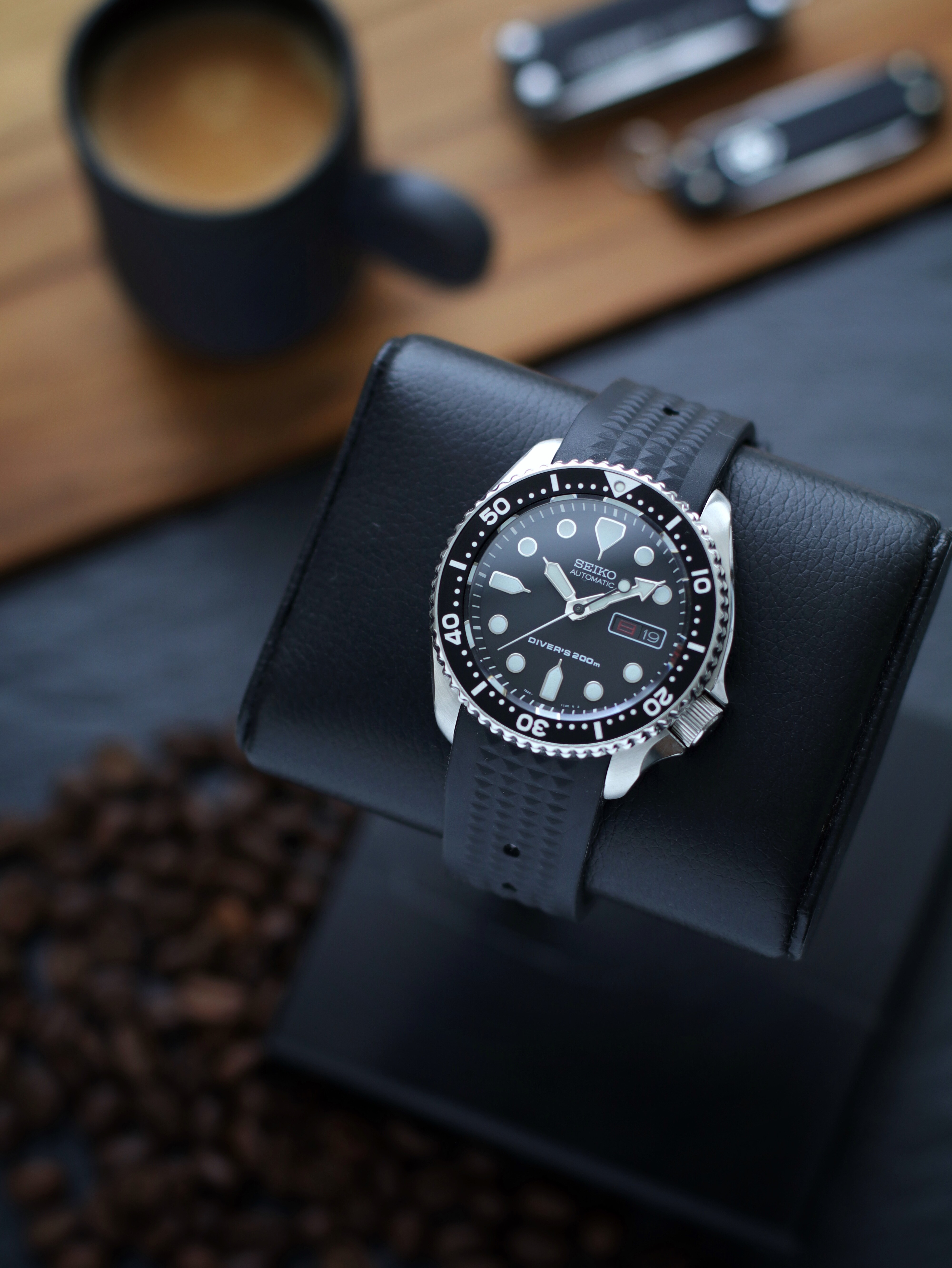 Basis is de zwarte SNZH59 met blauwe bezel en wijzerplaat van de 53. De HM wijzers zijn van de 51.