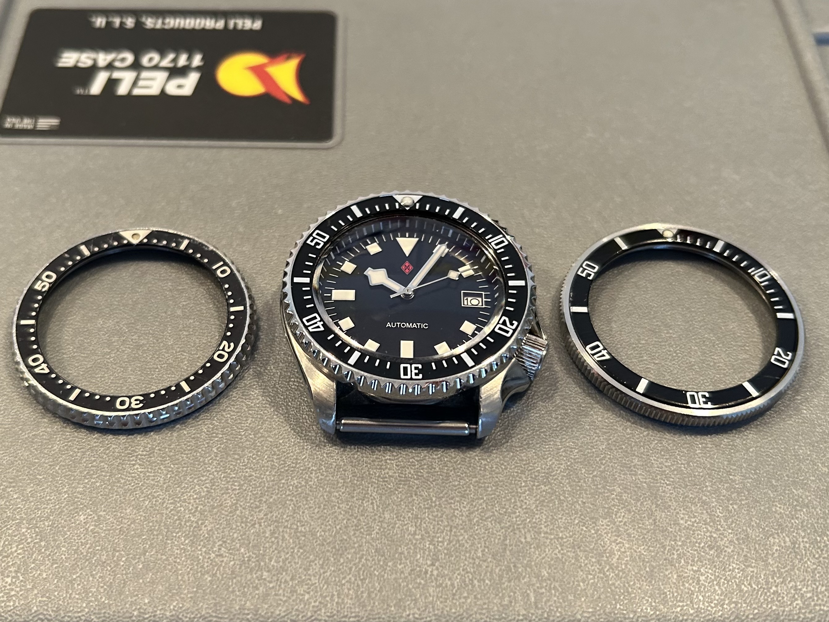 Toen besloot ik een mooie aftermarket wijzerplaat en wijzers te laten monteren, plus een gebold saffierglas. Met de originele bezel (links op de foto) zou hij nog grotendeels origineel zijn; met een van de andere twee resteren enkel de kast, de rehaut (die ik npg door een effen zwarte wil vervangen) en het uurwerk van de originele Seiko.