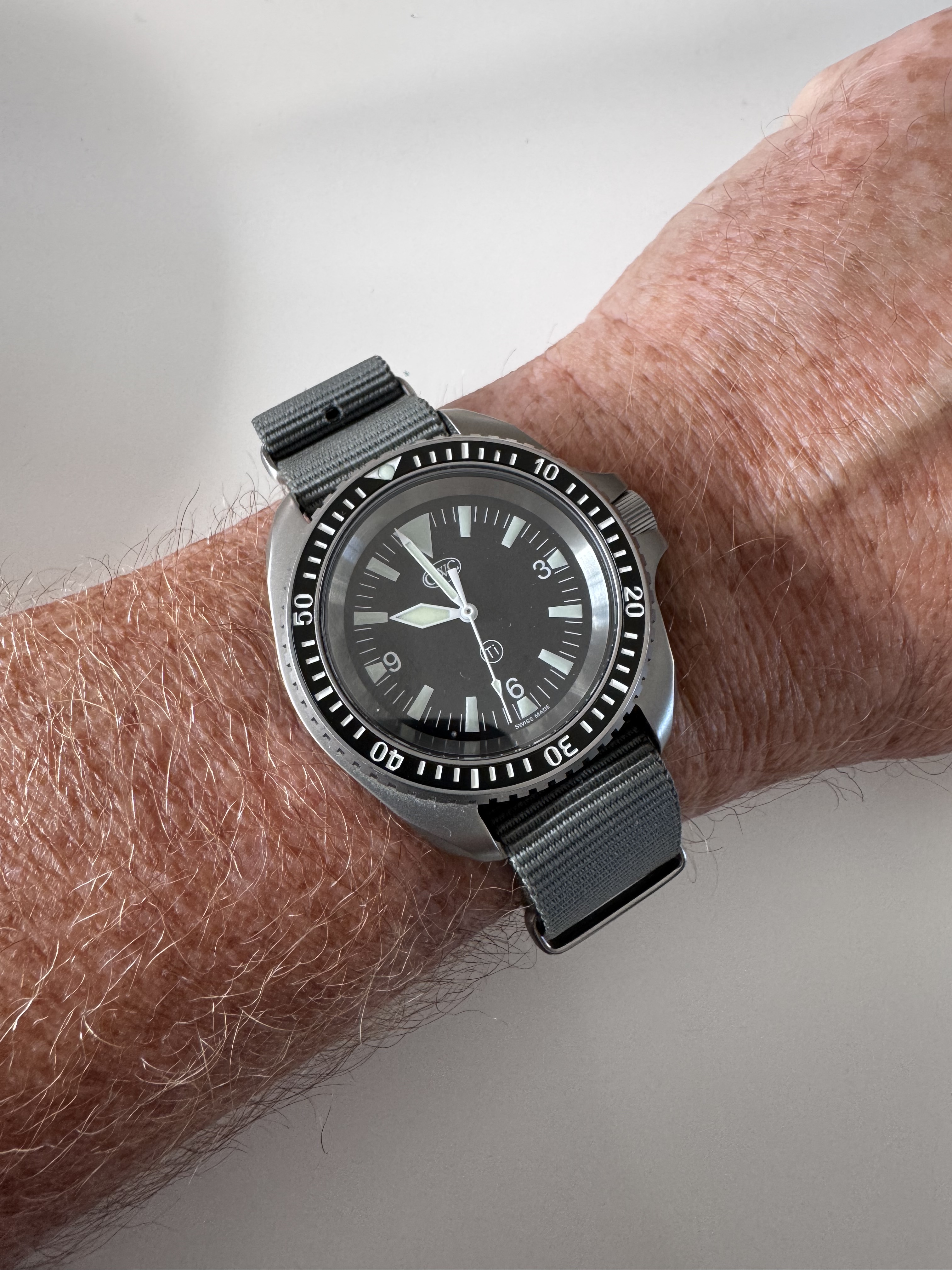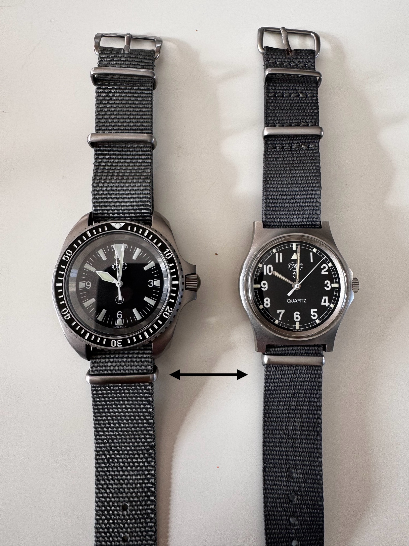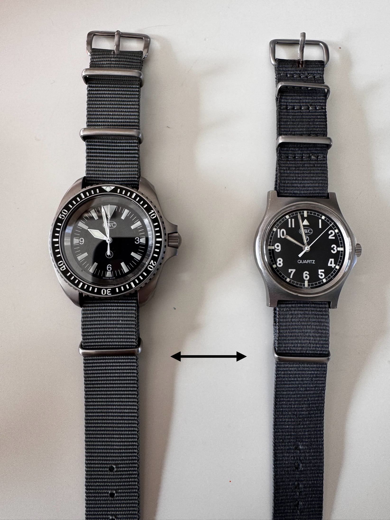 Even een vergelijking met de positie van het horloge op de nato. Ik zie dat @Jooost ook de onderste lug vrijwel tegen de onderste metalen band van de nato draagt. Resultaat is dat het horloge iets minder lomp om de pols draagt ![]()