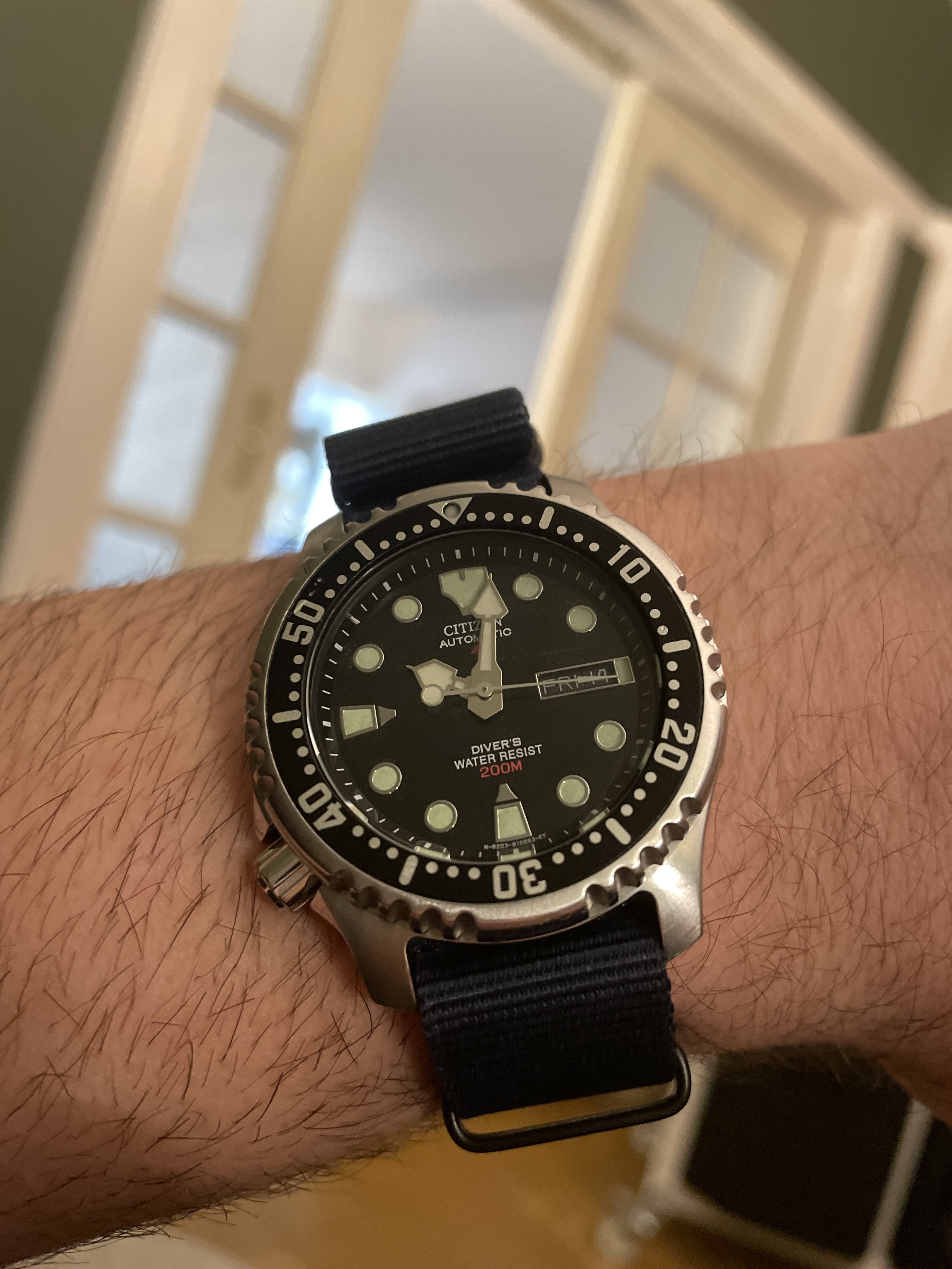 Of je komt in deze vervelende hobby via een Seiko5, of via deze citizen. Na enkele jaren toch maar deze aangekocht. Had lang een probleem met de bezelrand. Maar ik kan hieraan wennen.
