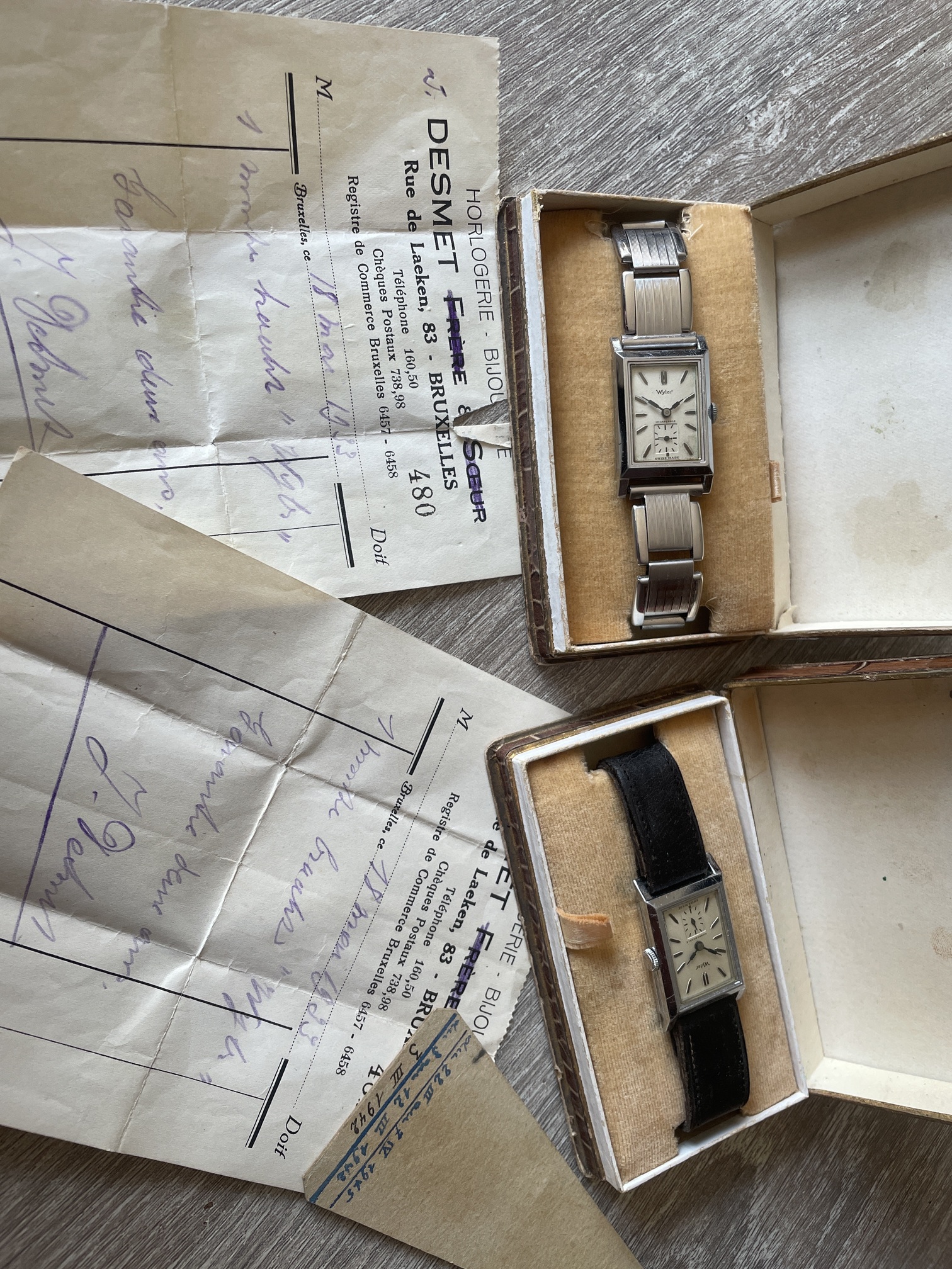 Twee ongedragen Wyler polshorloges welke zijn gekocht op 18 maart 1933. Inclusief de originele doosjes en aankoopbewijzen