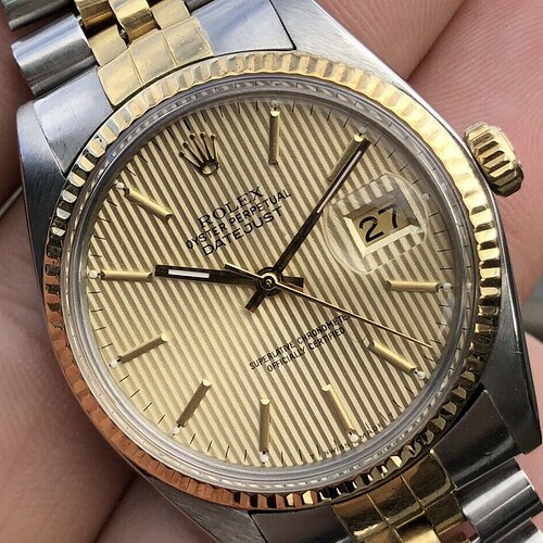 Deze komt - uit m’n hoofd - uit '74 of '75. Het glaasje is inderdaad facet geslepen, al heeft de wijzerplaat inderdaad een verticale ‘brush’ over het midden lopen. Het glas speelt hierdoor heel mooi met de wijzerplaat. Hier misschien iets beter te zien. ![]()