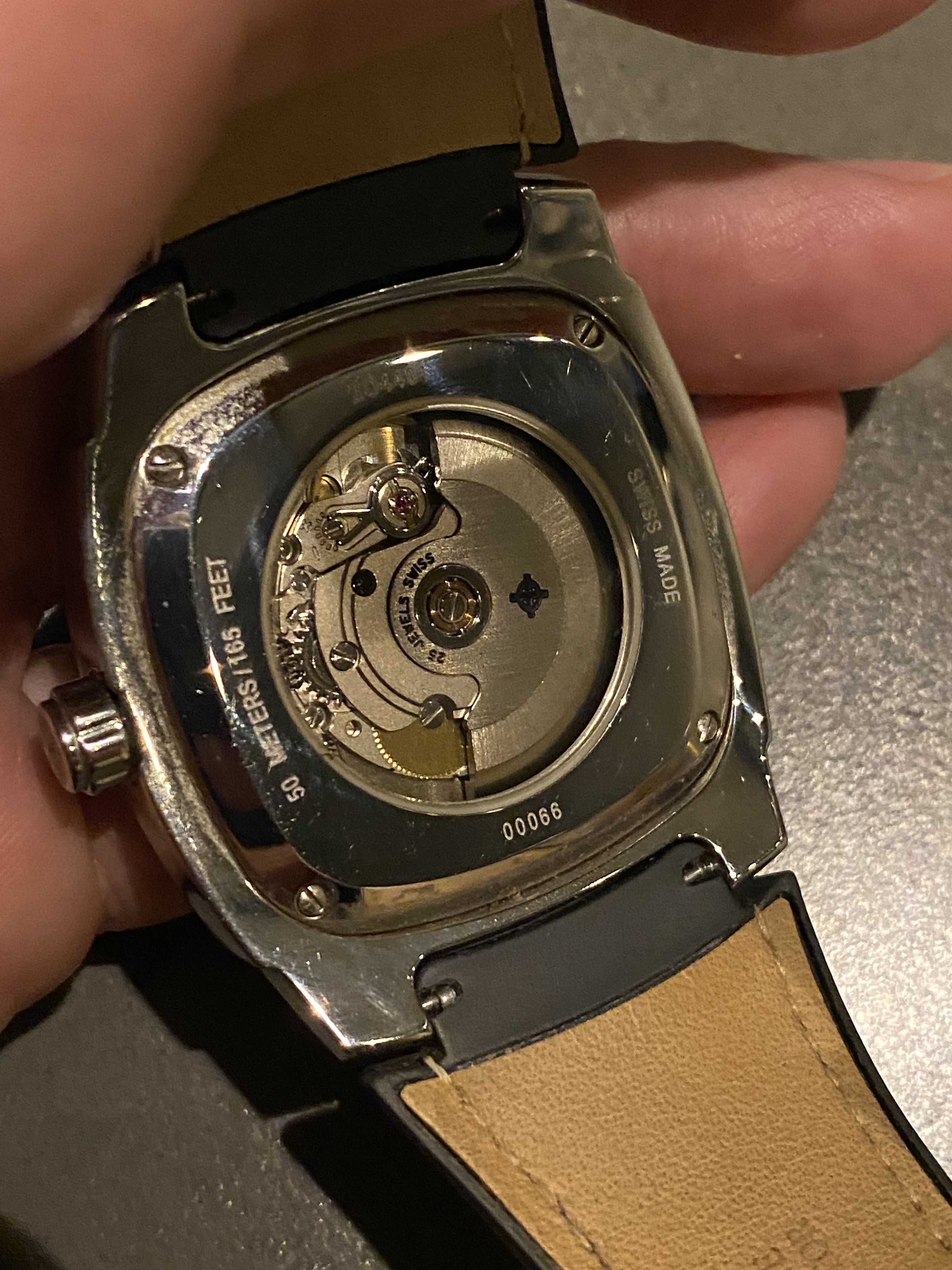 Terug na reparatie. Het horloge stopte ineens tijdens het dragen 20-120 min., om vervolgens weer ‘normaal’ te gaan lopen. Ergens was iets goed mis, gelukkig binnen 2 jaar en onder garantie gerepareerd. De kwaliteit van het uurwerk lijkt bedenkelijk, maar de service is goed.