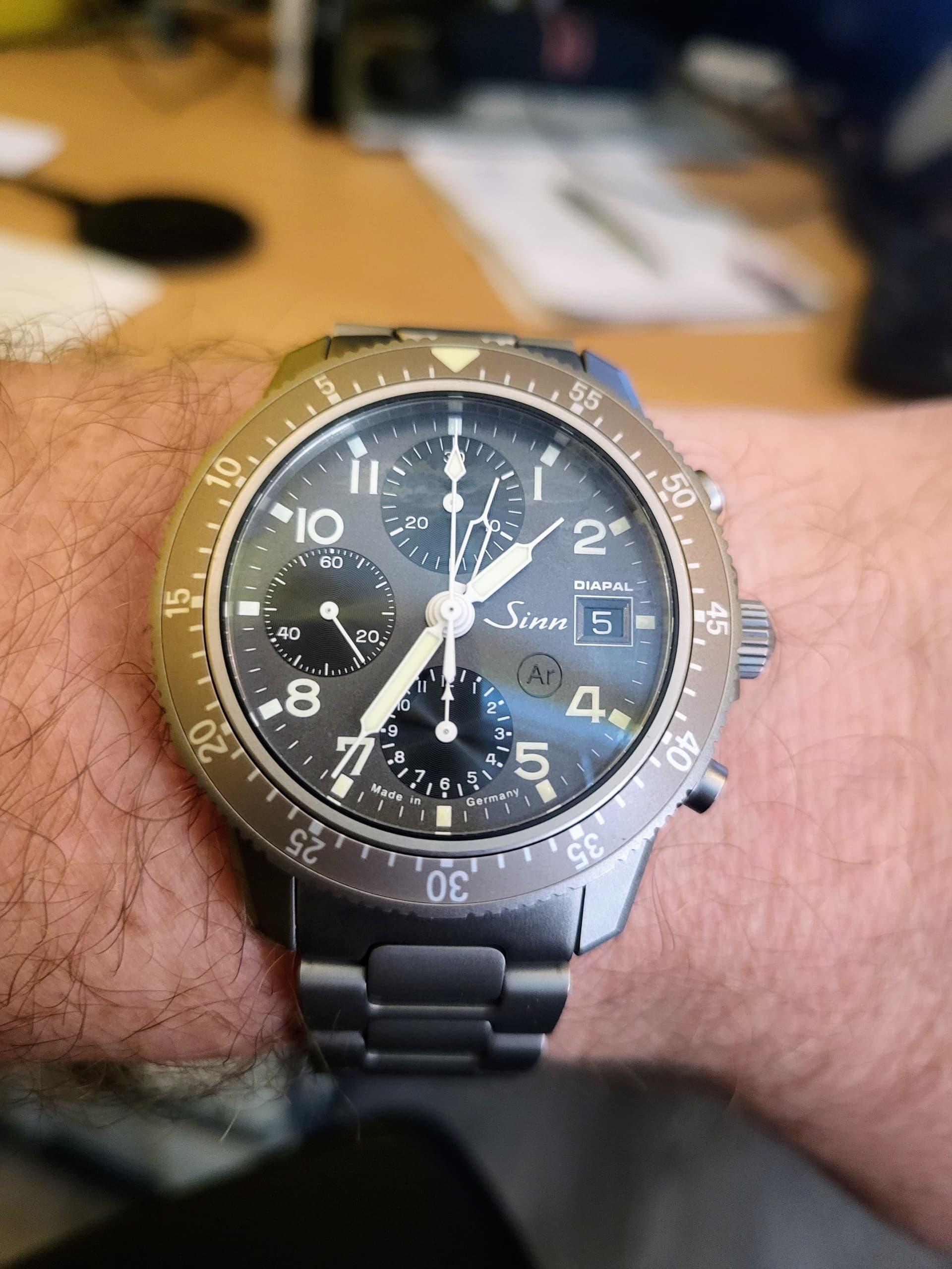 Helaas (zelf vind ik het namelijk niet zo mooi) heeft Sinn nu sinds een paar jaar “made in Germany” onderaan gezet. “Swiss Made” is veel meer in balans (5 letters vs 4 letters” dan “Made in Germany”. Ik had veel liever gezien, als je er toch wat op wilt zetten, dat Sinn alleen “Germany” onder de 6 zou zetten - veel meer in balans en ook ruim voldoende letters imho.