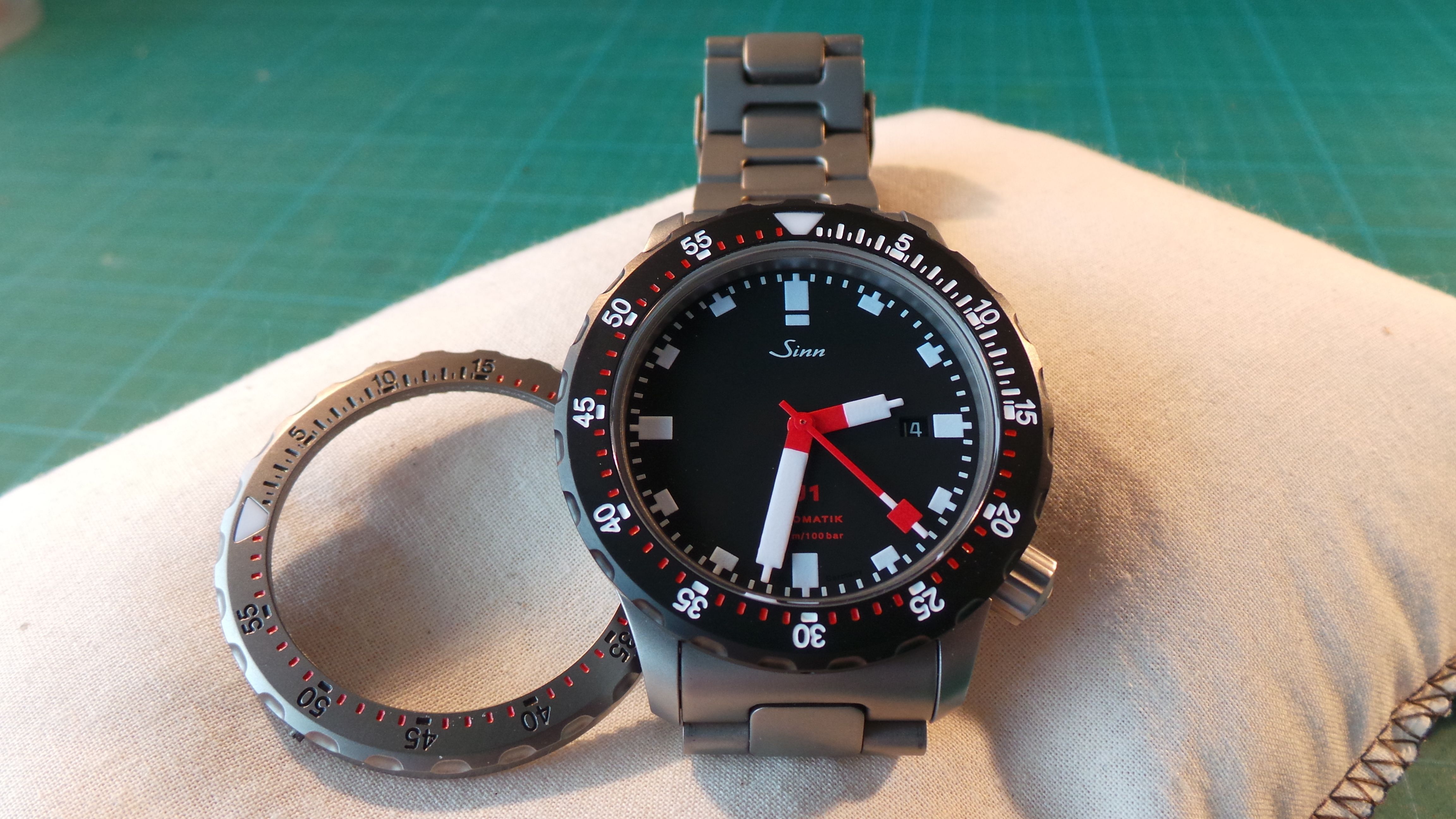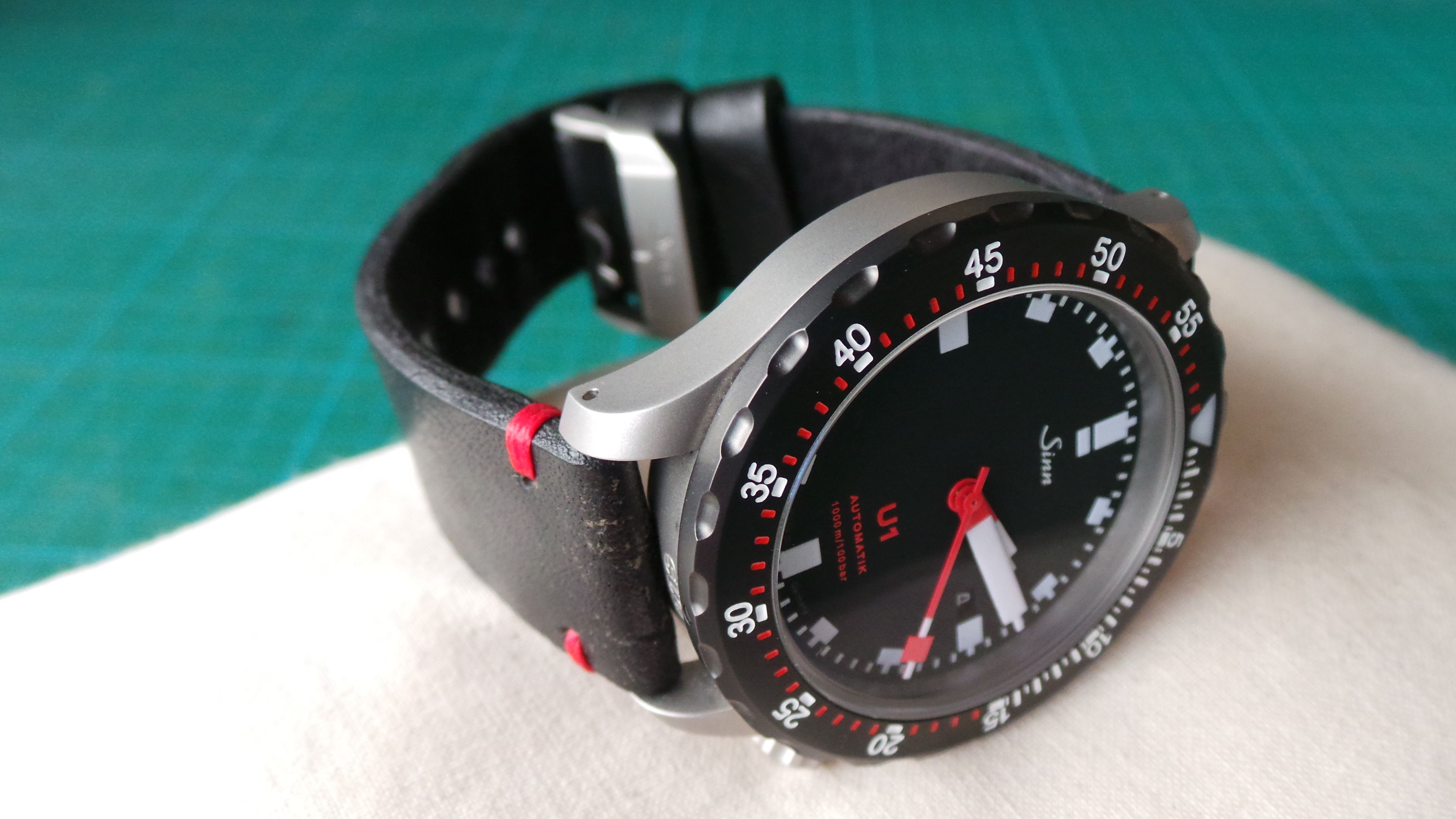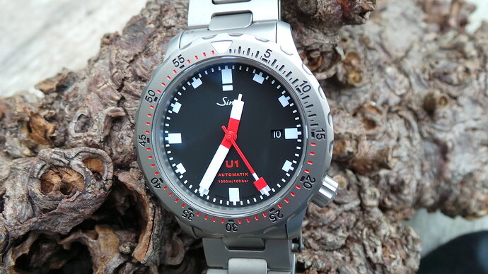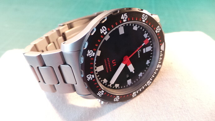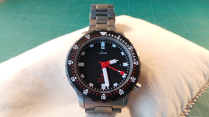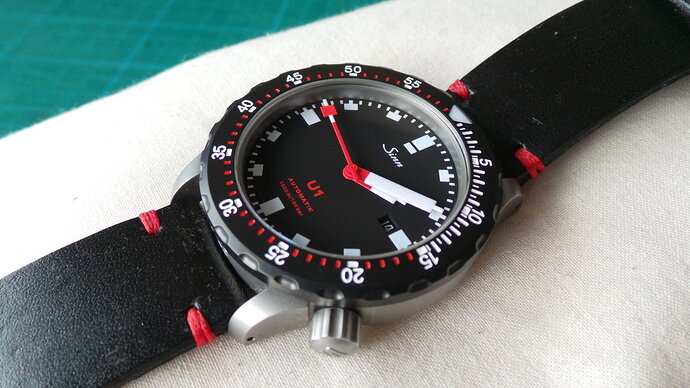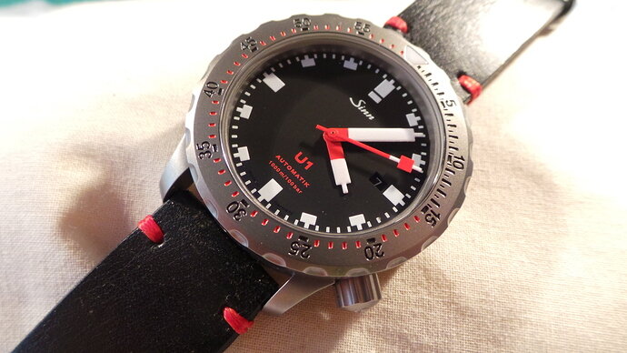 Net binnen de Schwartze Dreh Ring (SDR) voor mijn Sinn U1, direkt erop gezet en dit is het resultaat, nu kan ik en met banden en met een bezel wisselen! Waar gaat jullie voorkeur naar uit?, zwart of stalen bezel?