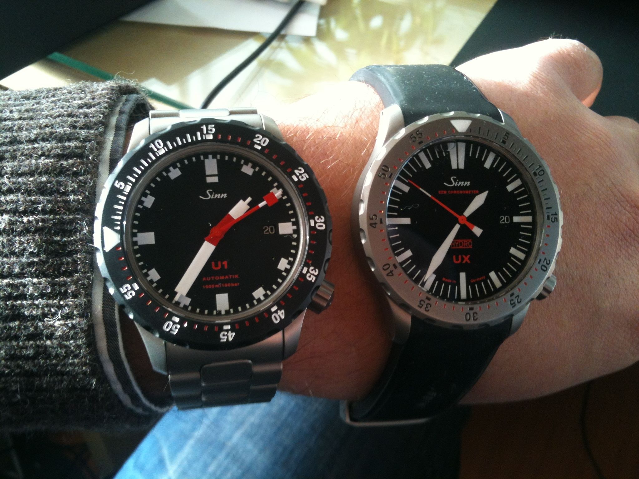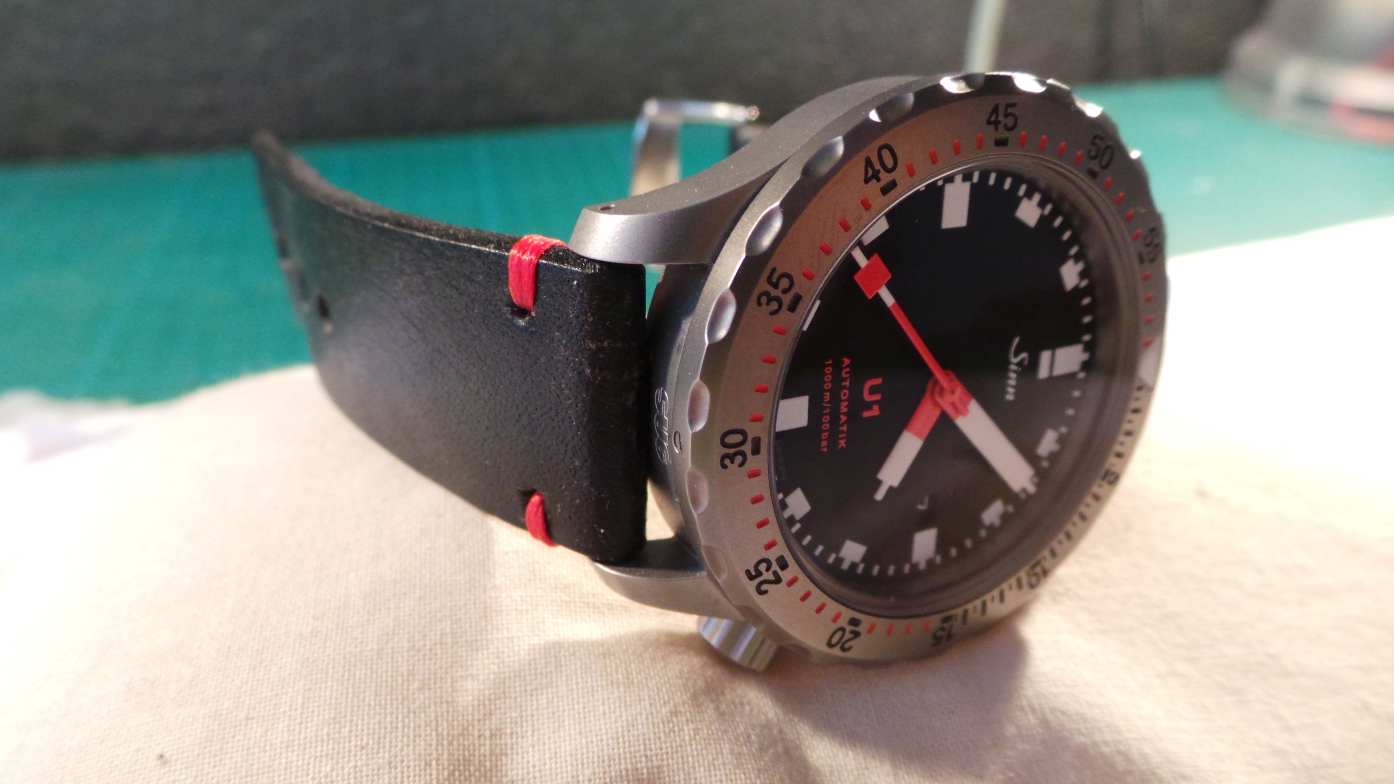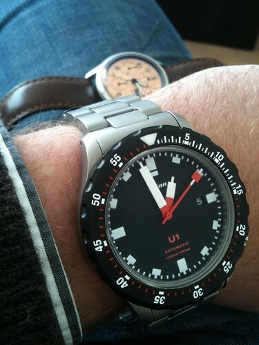 Net binnen de Schwartze Dreh Ring (SDR) voor mijn Sinn U1, direkt erop gezet en dit is het resultaat, nu kan ik en met banden en met een bezel wisselen! Waar gaat jullie voorkeur naar uit?, zwart of stalen bezel?