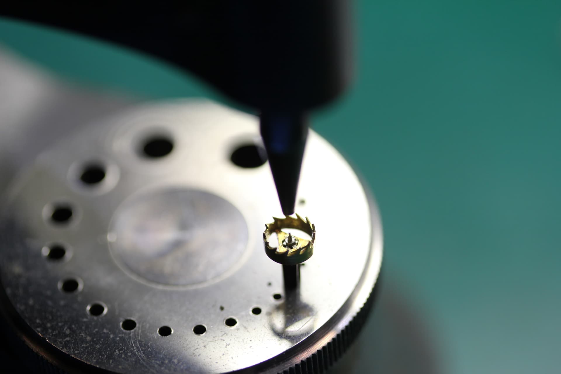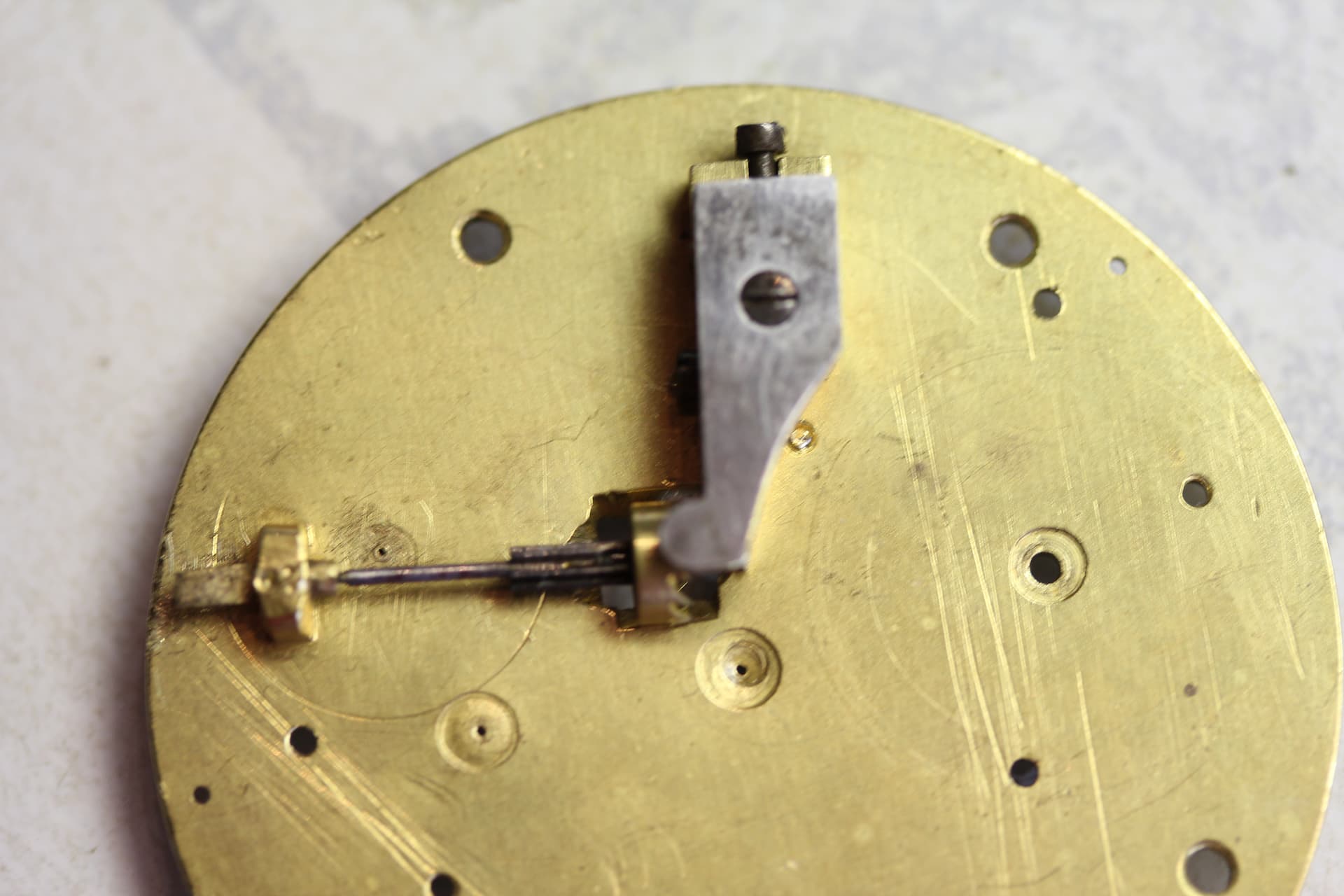 Nu is het stelblok aan de beurt. Gedemonteerd, nagekeken en overnieuw gemonteerd en na bewerking gekeken en gemeten of de afstand van het tapgat van de pinion goed correspondeert met de borgpin op de platine. Het rad moet niet te ver en ook niet te dichtbij het centrum komen van de balans as. Als het rad te ver van het centrum zit dan zal het uurwerk slippen, zit het te dichtbij, dan zal het uurwerk stagneren. Het moet dus exact op de juiste plek komen te zitten zodat de omwenteling van het rad een schoep wegduwt en de andere schoep het rad tegenhoud en zo verder om en om.
