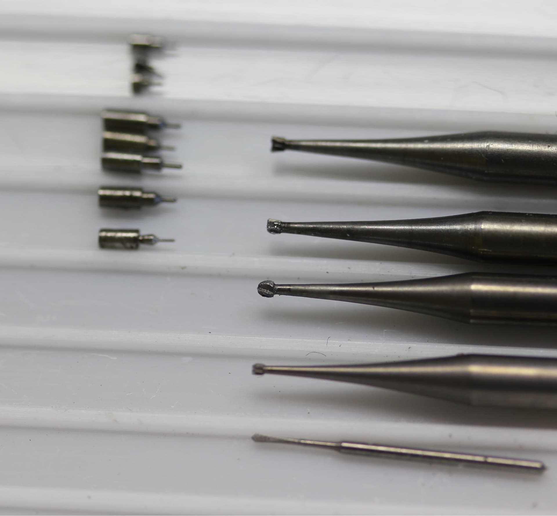 Het gat boren met een spiraalboor is niet verstandig, als de boor breekt, en de kans dat zoiets gebeurd is heel groot, dan is er een probleem om de resten uit het boorgat te krijgen, de flatboor zal ook geen oplossing zijn, wanneer de as wordt ingeboord komen de vertandingranden op de as vrij en zal de boor afbreken omdat het tegen de vertanding aan slaat bij het boren. Dus gebruik ik verschillende frezen. De eerste is een minifrees met een puntige bolle voorkant om het centrum van de as te bepalen en vervolgens telkens met een rechte frees oplopend in grootte het gat zodanig uitfrezen dat ik de bewerkte tampon erin kan persen.