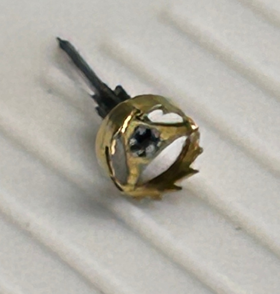 Wel, na dit probleem te hebben afgehandeld kon ik het uurwerk demonteren. Na montage kon ik de onderdelen beter bekijken en kwam het eerste probleem al naar voren. De pinion (het liggend ontsnappingsrad) was stuk, de tap was in het gedeelte bij het rad afgebroken. Dat de tap daar is afgebroken is ongebruikelijk, er moet heel wat zijn gebeurd als de tap op die plaats afbreekt. Vermoedelijk dat het bij het sleutelen door de horlogemaker afgebroken, maar dat soort euvels wordt er meestal niet bij verteld.