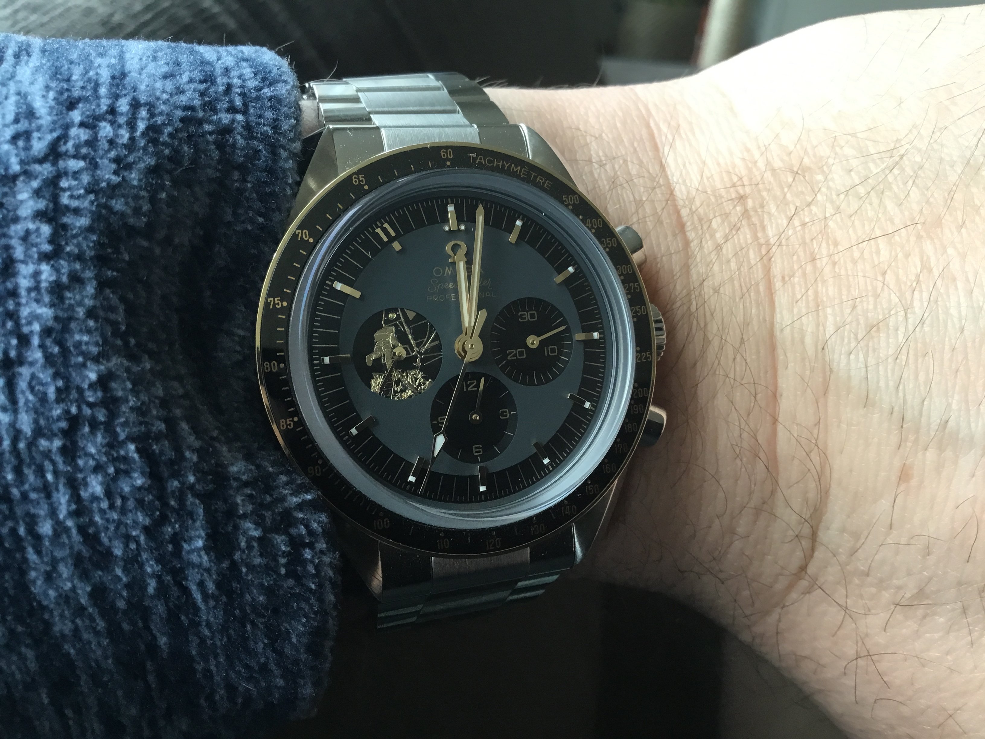 Al een tijdje aan het kijken voor mijn volgende aankoop en moet zeggen dat de Speedmaster steeds meer mijn aandacht krijgt met name de hesalite uitvoering. Helaas nog niet in het echt gezien/gepast en toch nog wel twijfels want lug to lug is deze 48mm wat misschien net iets te groot is voor mijn pols(je).
