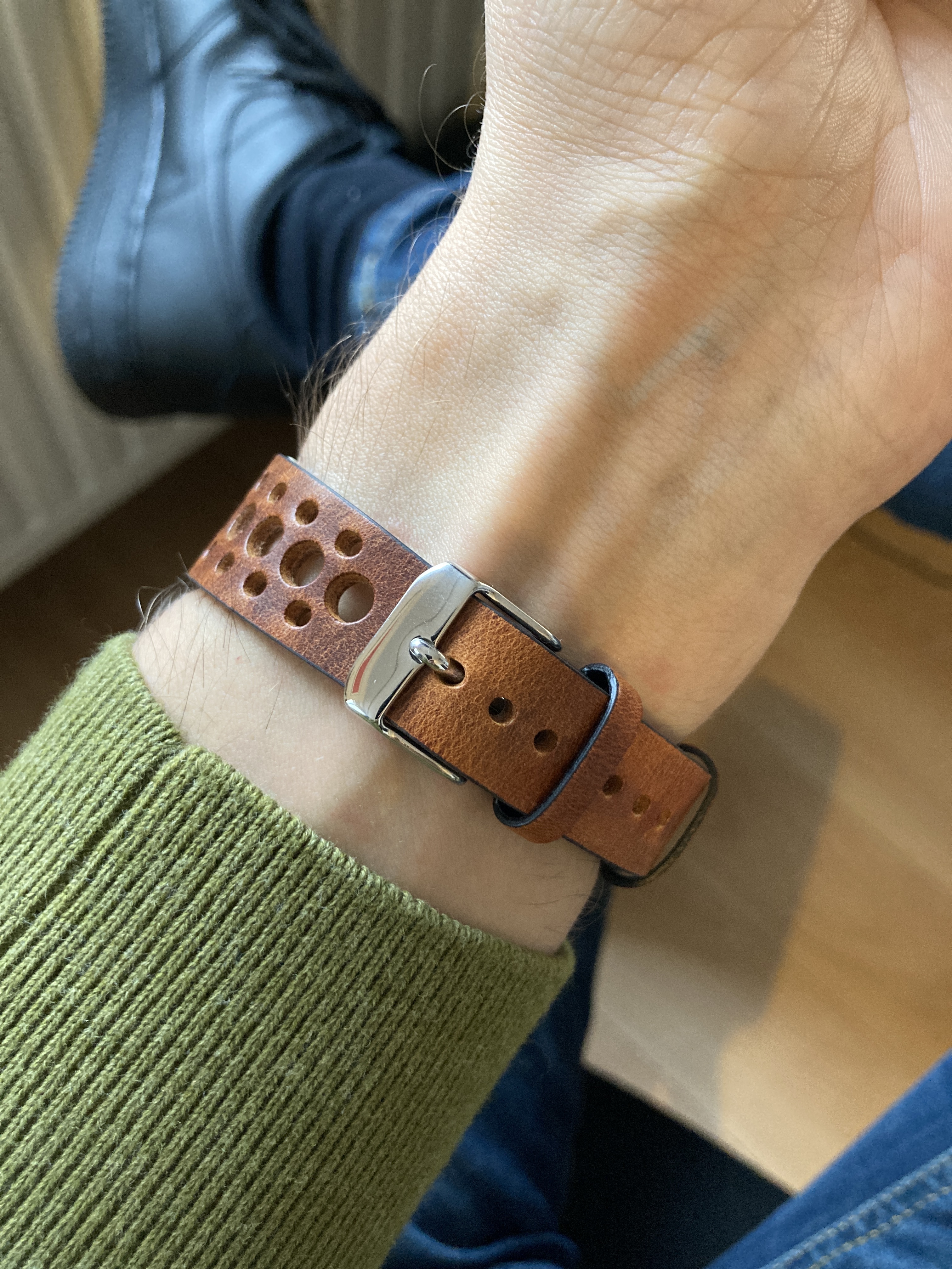 Thx, het is de Hunter green van Molequin. Grained calf, dun en ongevoerd. Vind het wel eens leuk om de lugs zo mooi vrij te zien aan een band zoals deze.
