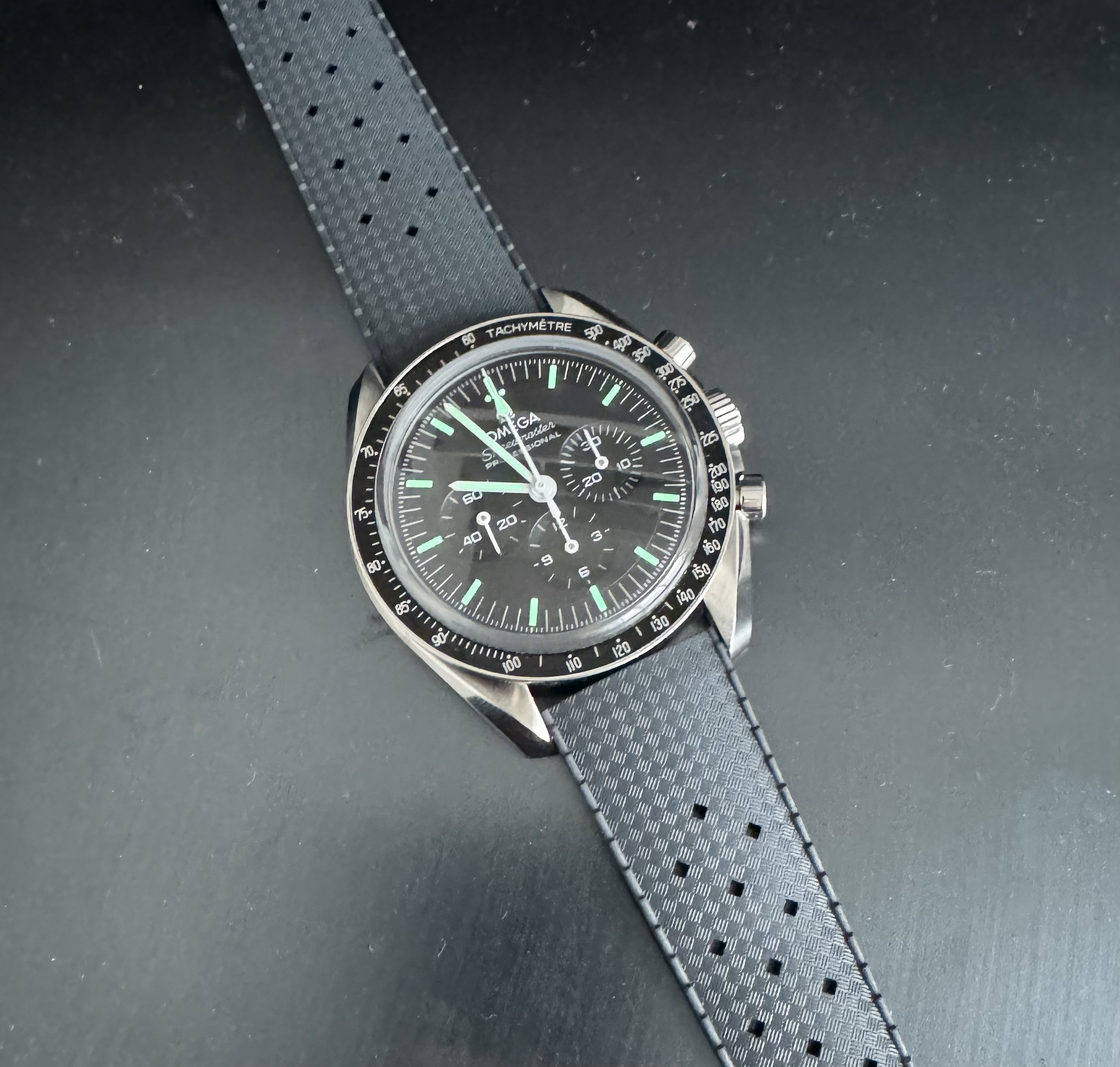 Een remake van een bezel die door Omega aan de NASA is voorgesteld in het Alaska project. Beter afleesbaar en je hebt niks aan een tachymeter als je met +20.000 Km/u rondzweeft daarboven😄 en er zijn geen kilometerpaaltjes om op te timen. Duidelijke minuten zijn dan handiger.