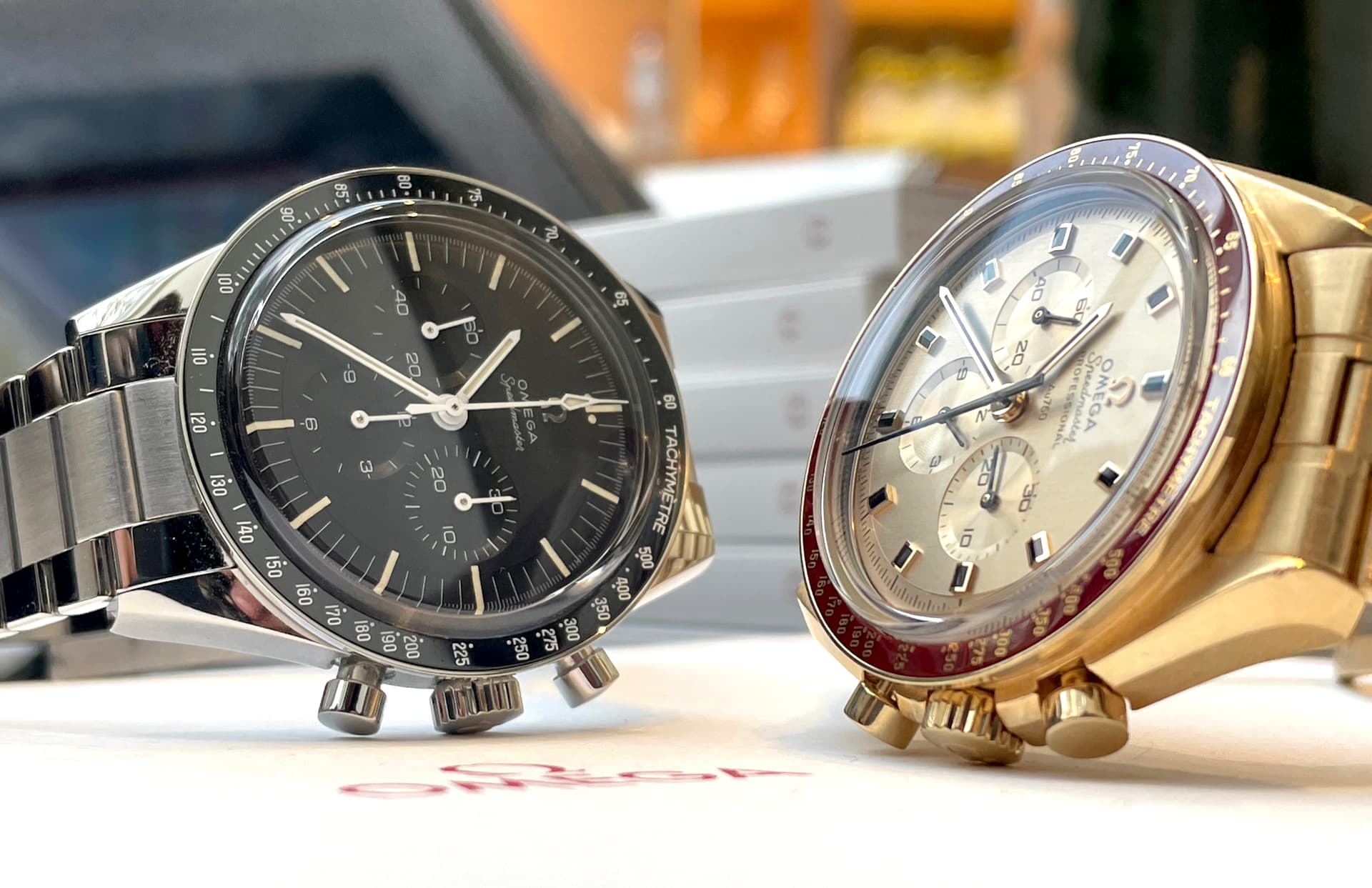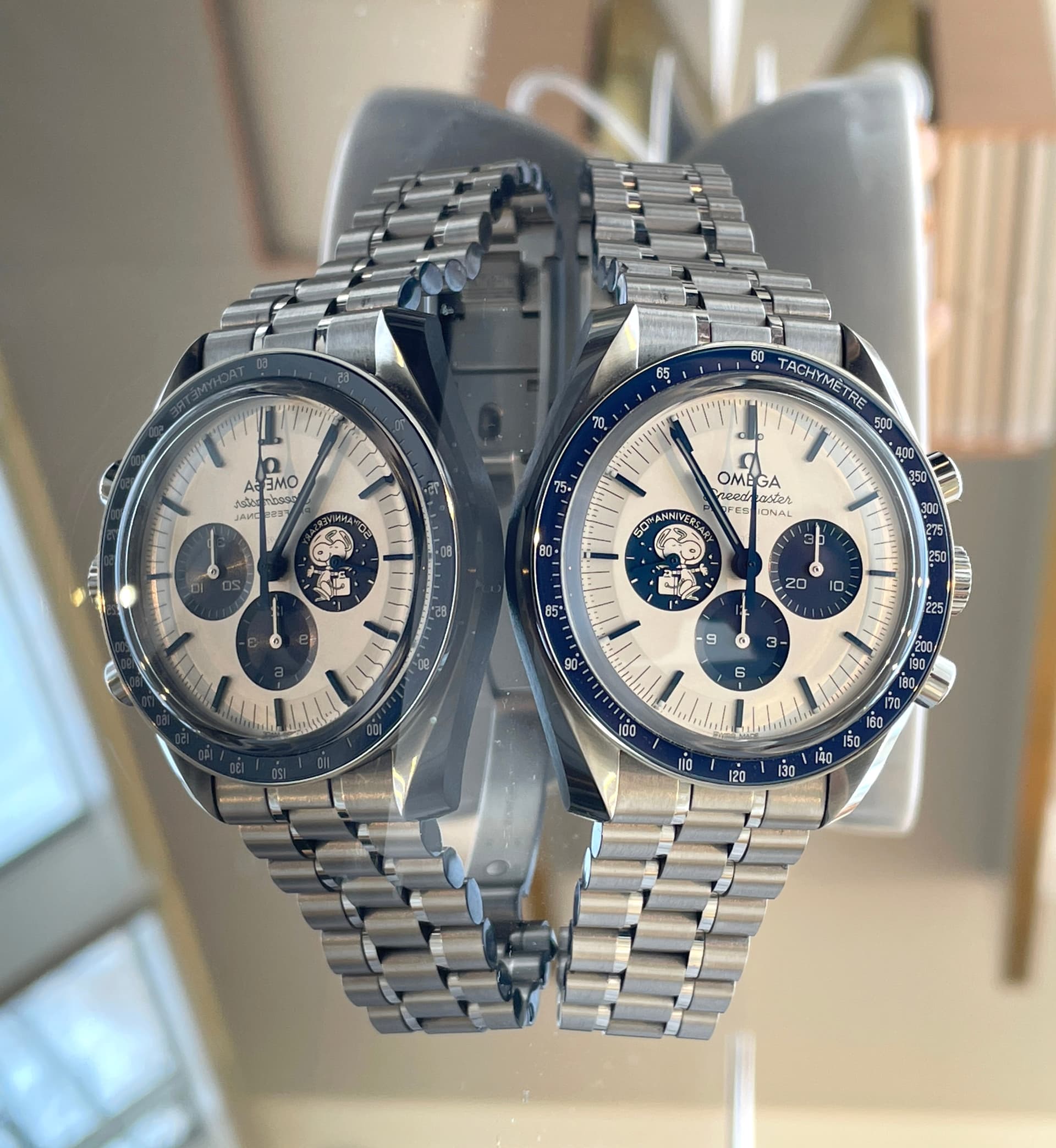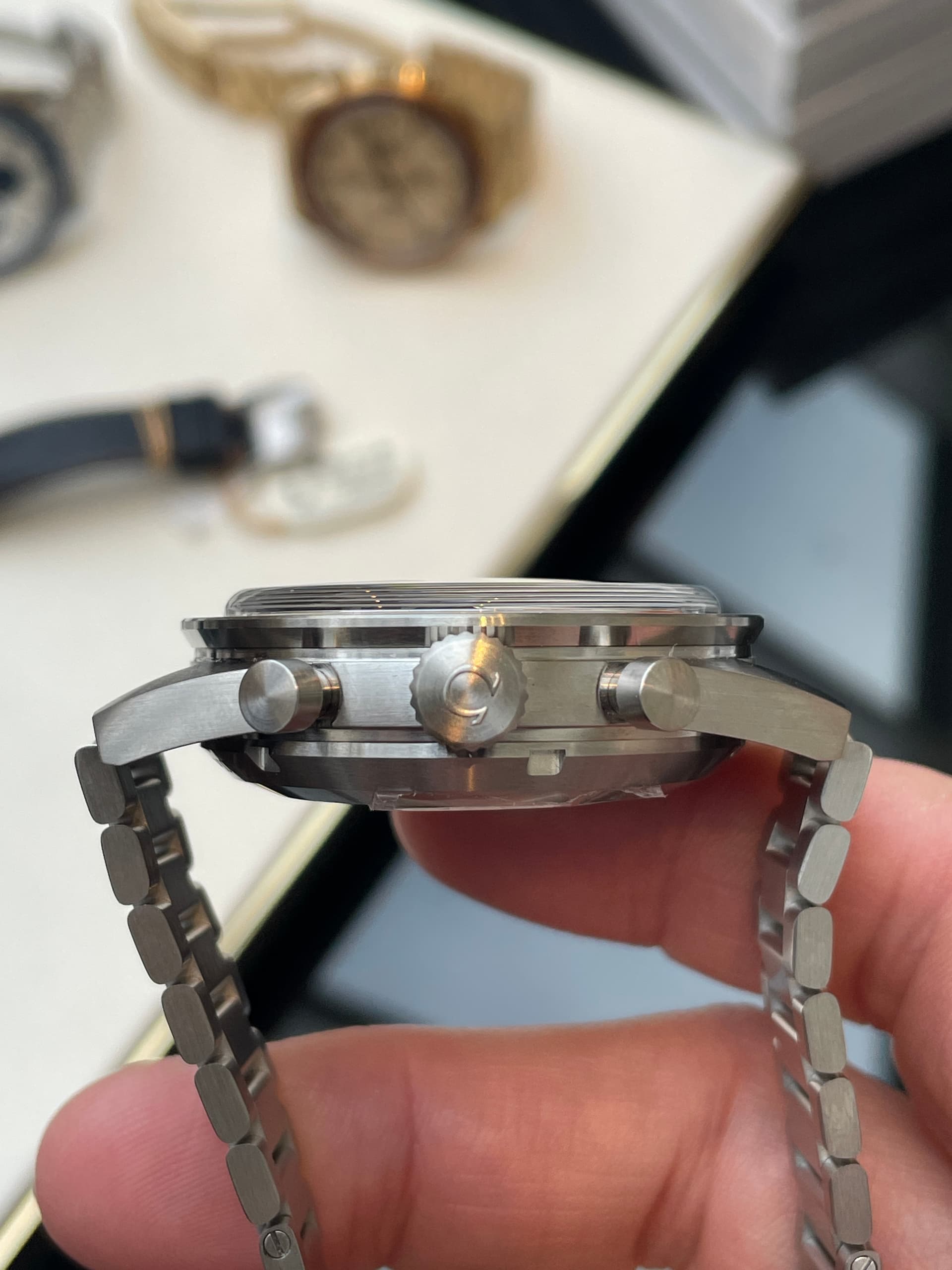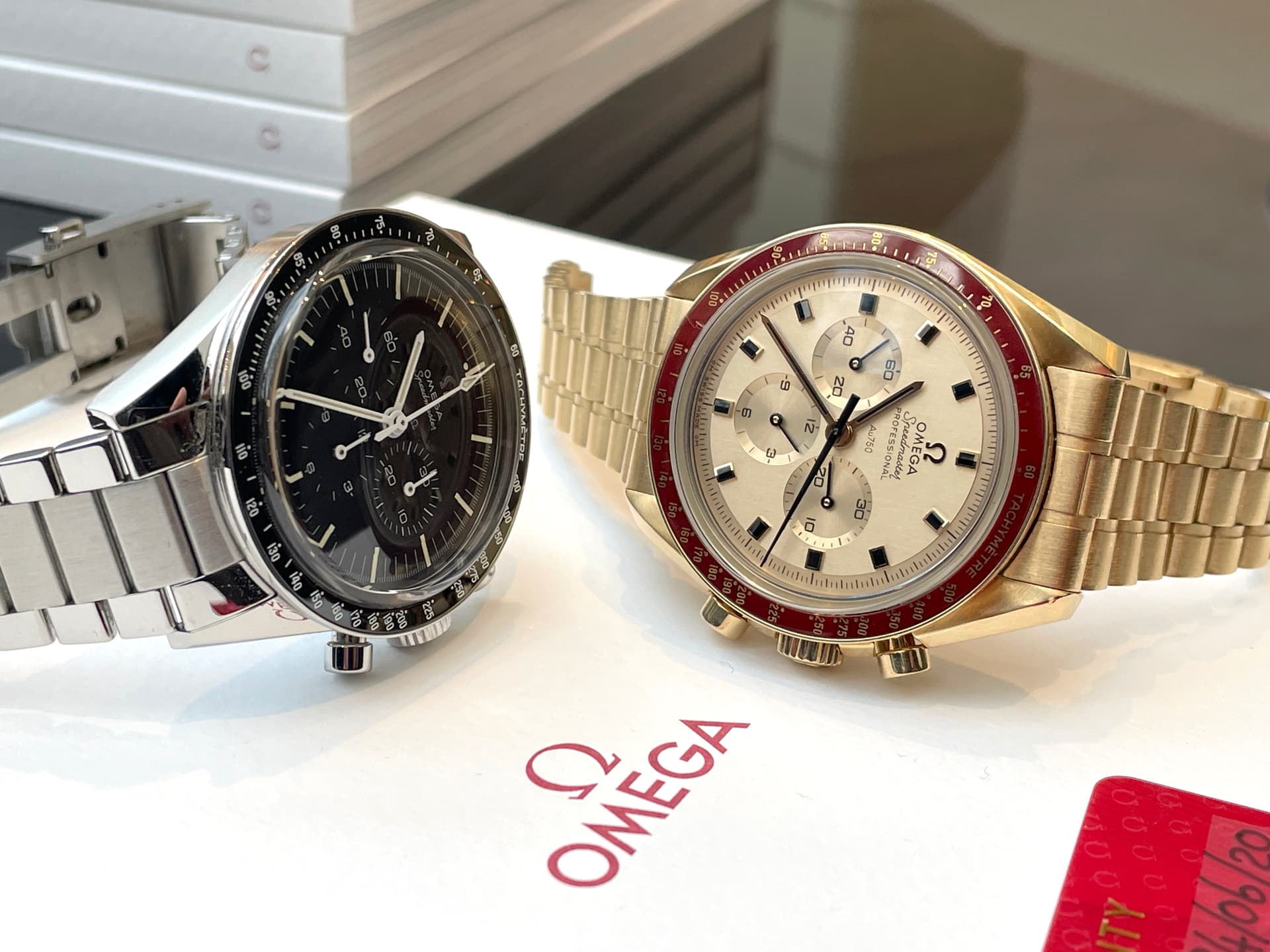 Waaronder de nieuwe FOIS, die goed loopt in de verkoop. Ik heb meteen het nieuwe gebolde saffierglas vergeleken met de klassieke hesalite van een 3861 Moonwatch. De lichtwerking en de vervorming leken enorm veel op elkaar (als je de glimmende wijzers van de FOIS even negeert). Ik ben benieuwd of Omega dit breder gaat uitrollen.