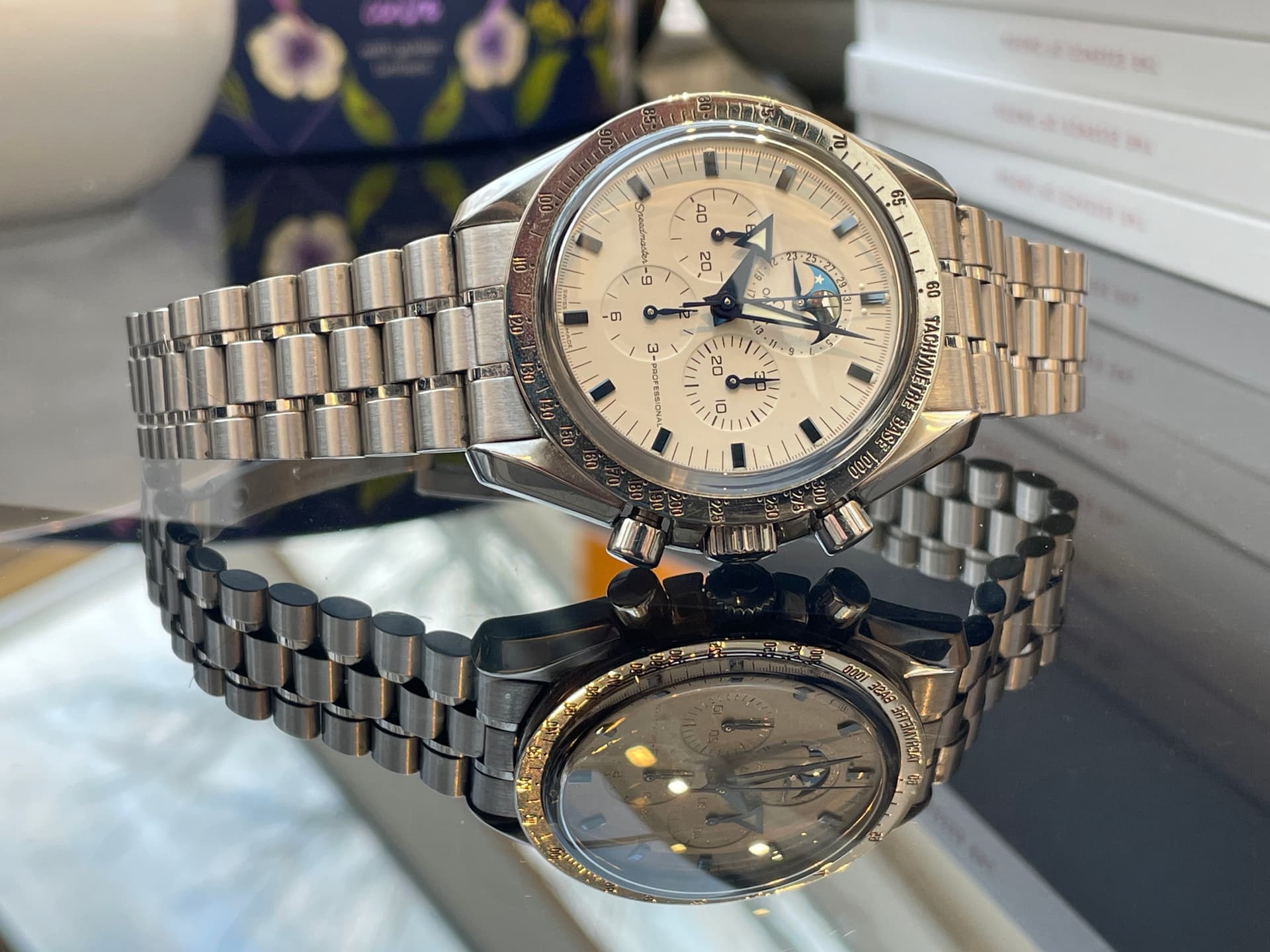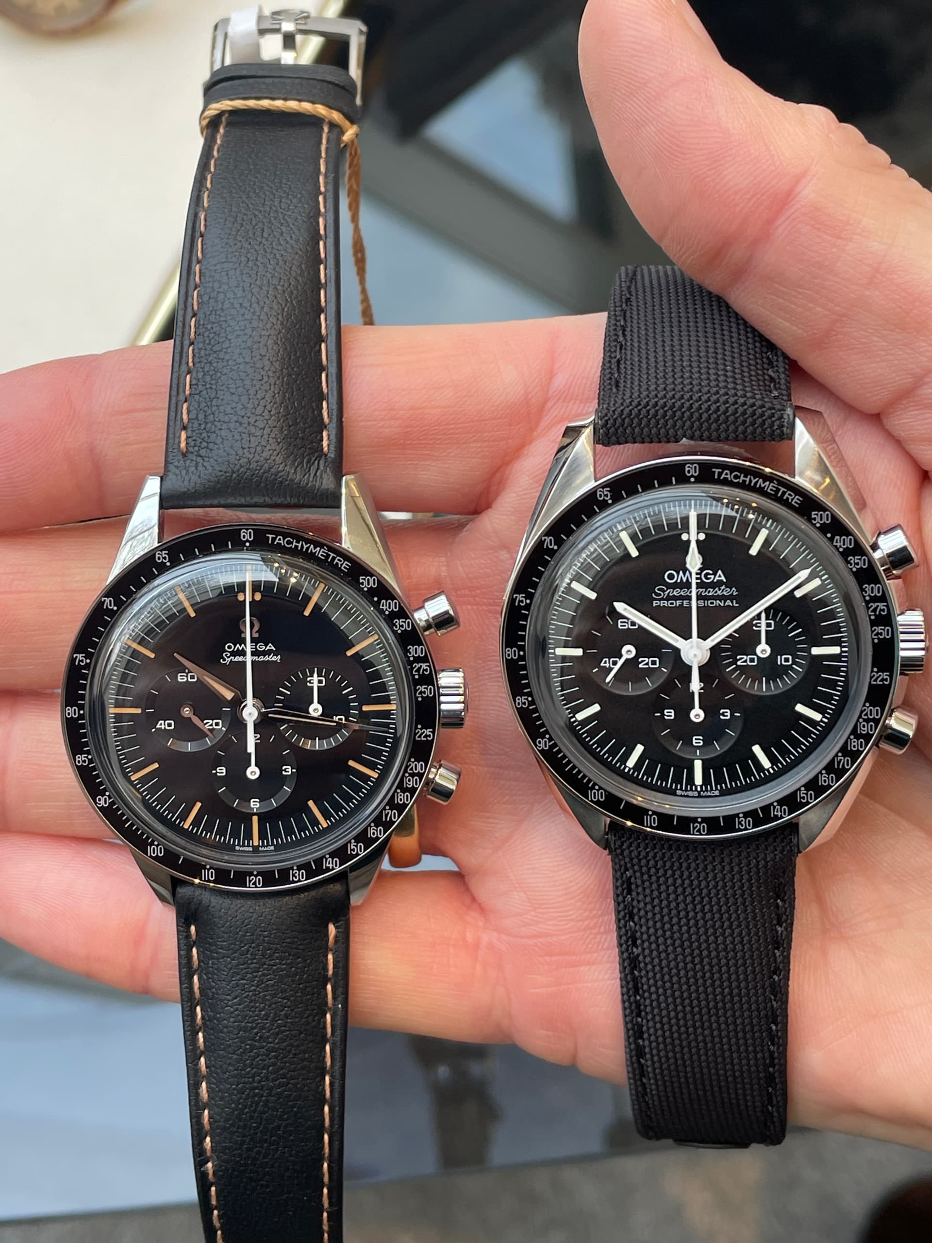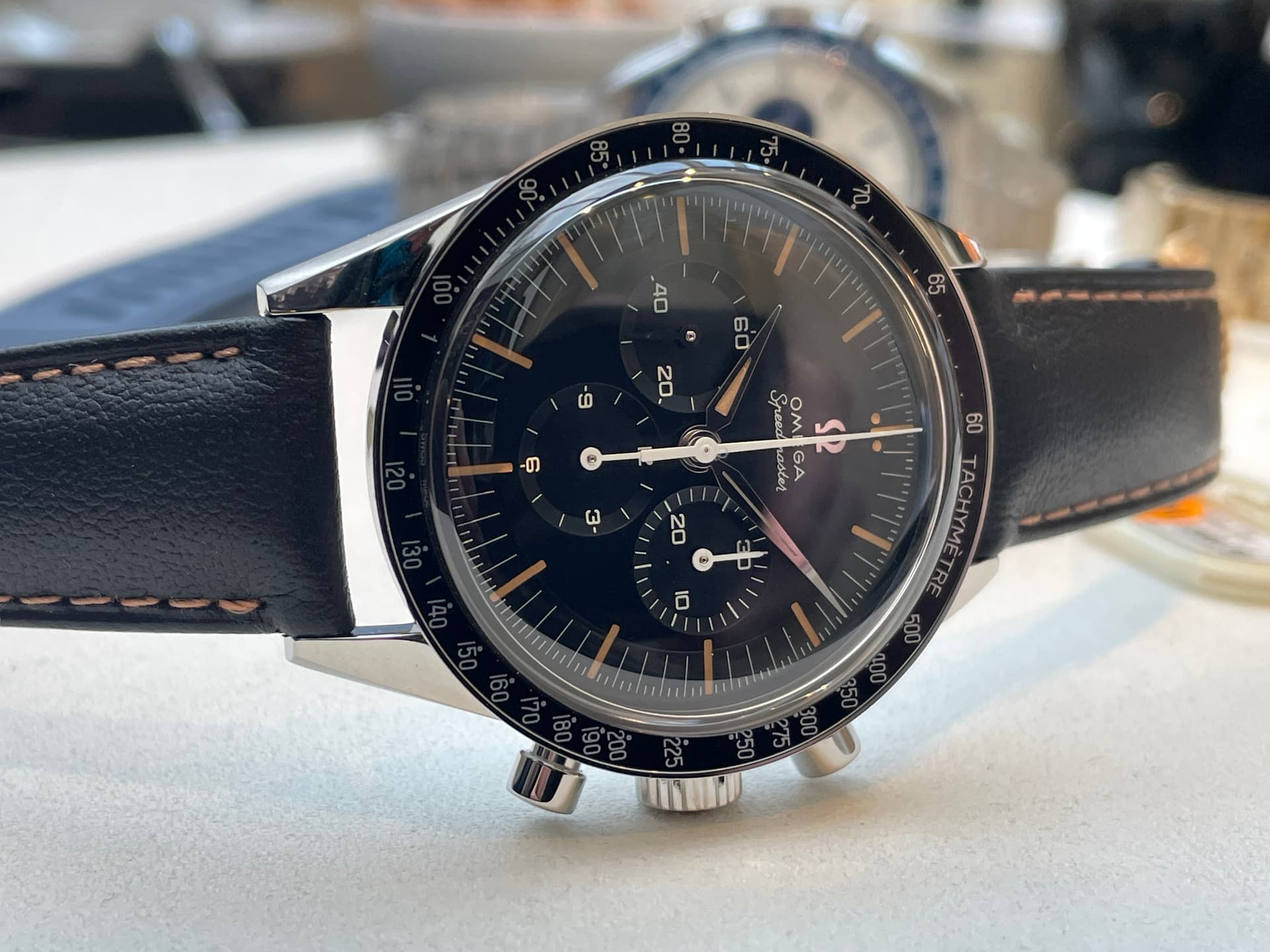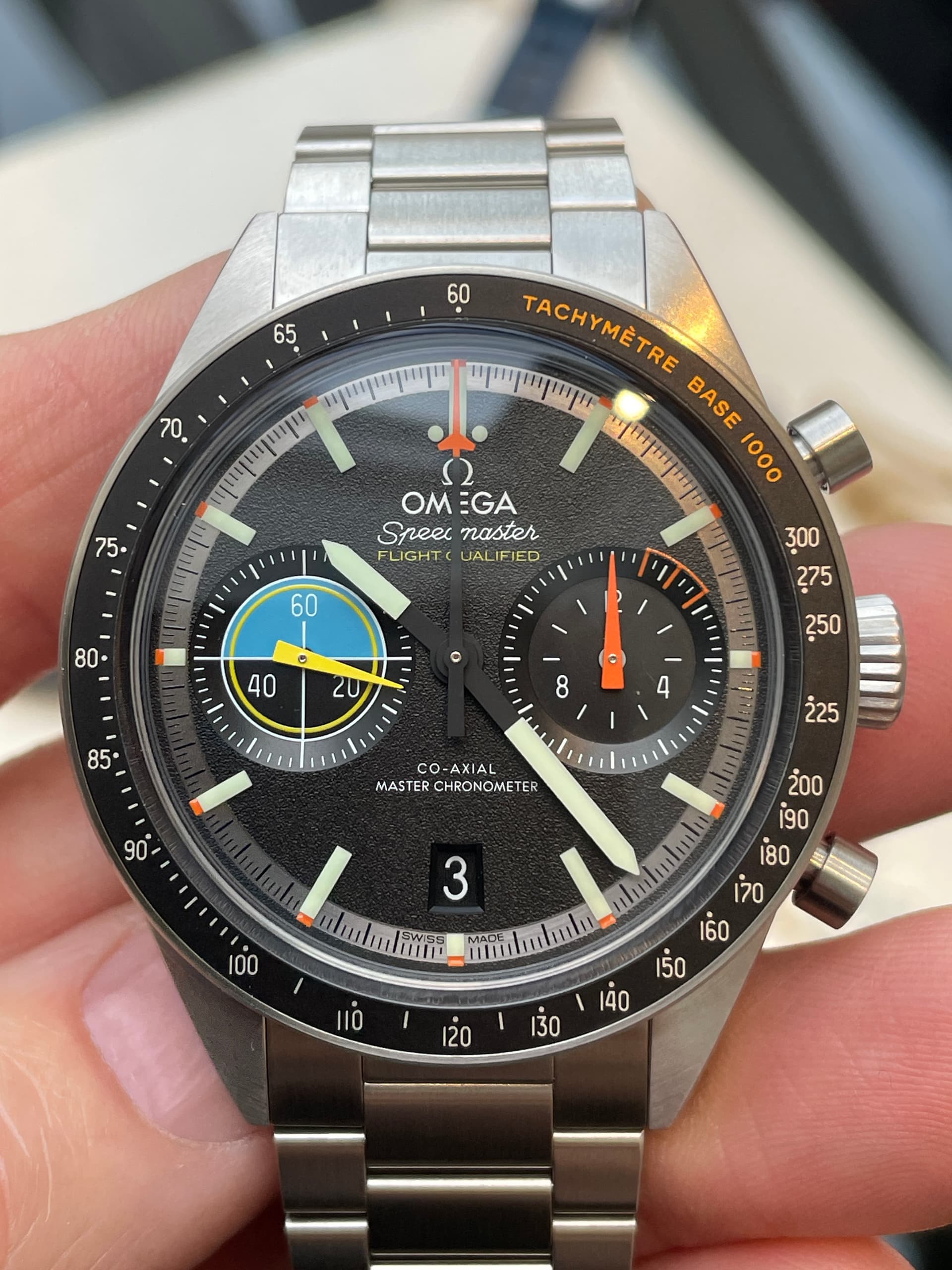 Waaronder de nieuwe FOIS, die goed loopt in de verkoop. Ik heb meteen het nieuwe gebolde saffierglas vergeleken met de klassieke hesalite van een 3861 Moonwatch. De lichtwerking en de vervorming leken enorm veel op elkaar (als je de glimmende wijzers van de FOIS even negeert). Ik ben benieuwd of Omega dit breder gaat uitrollen.