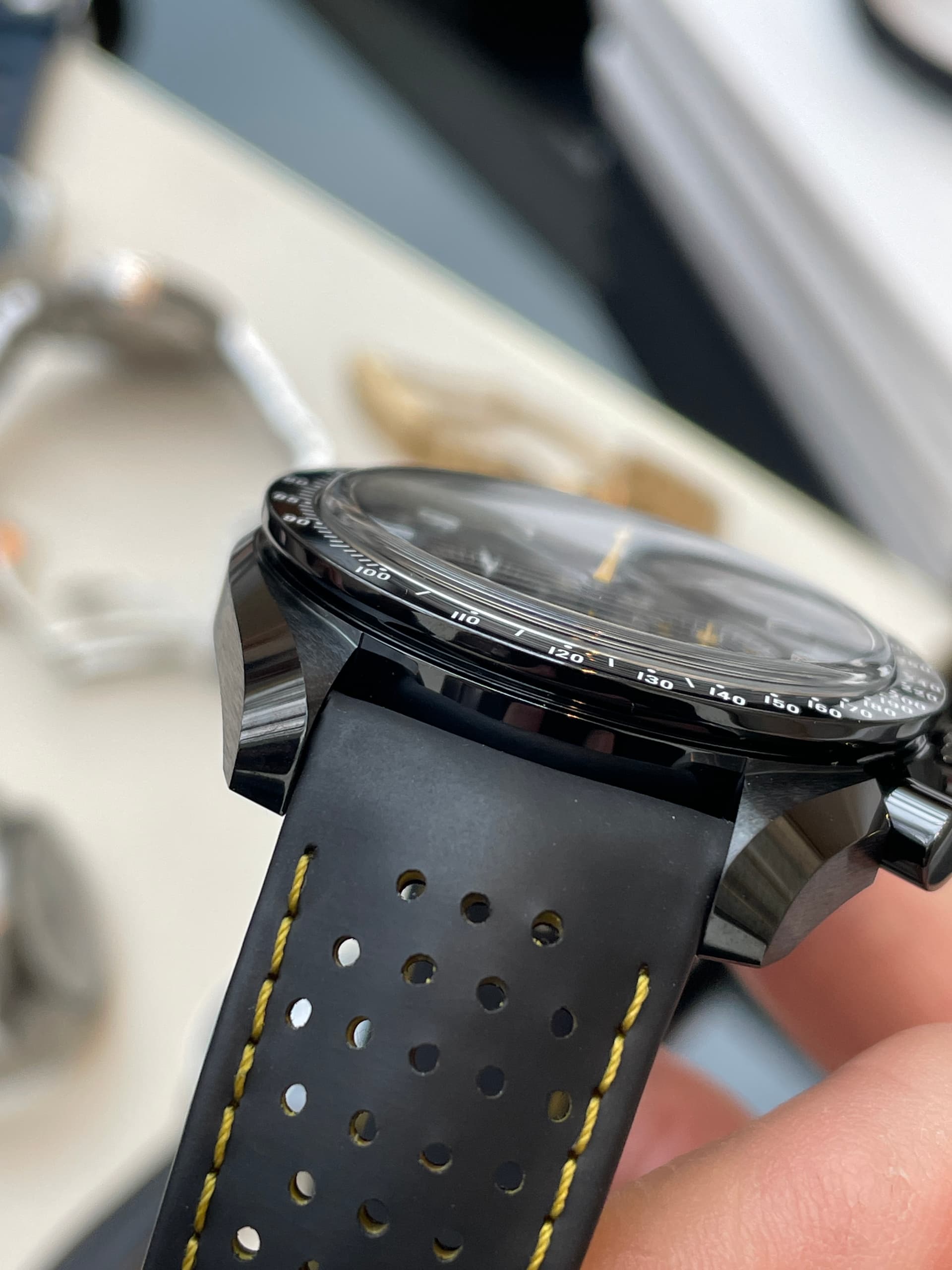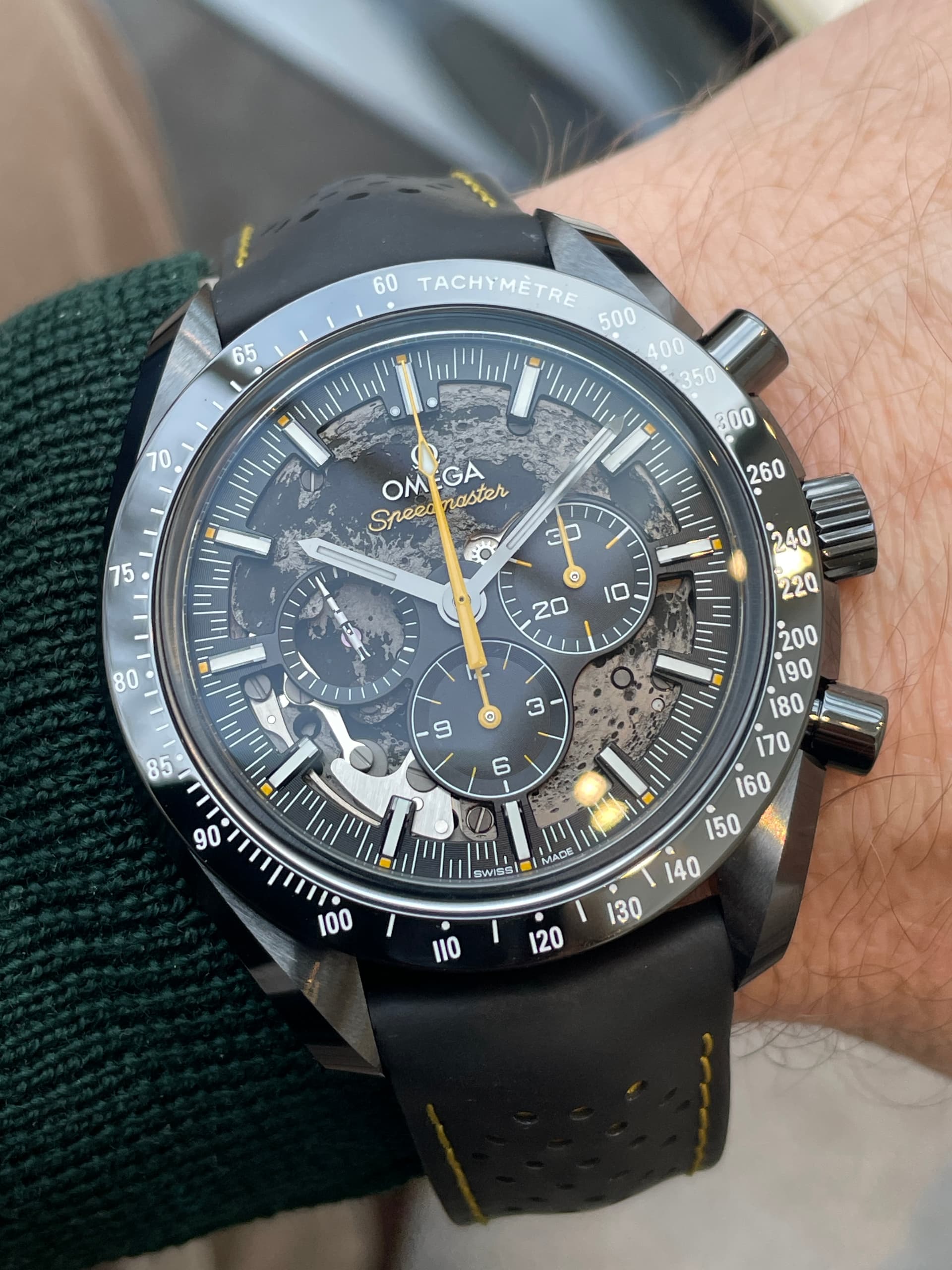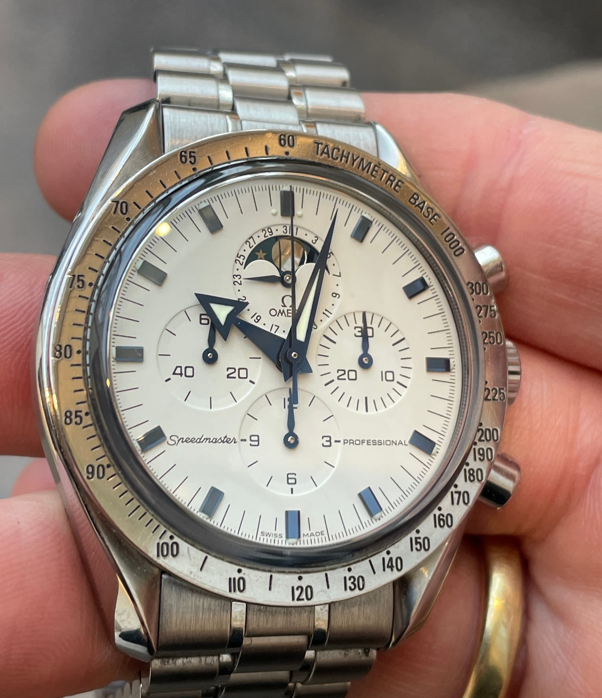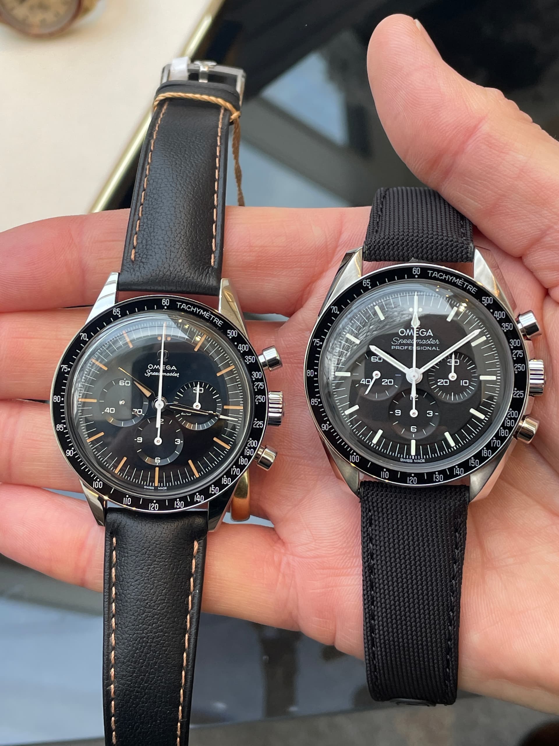 Waaronder de nieuwe FOIS, die goed loopt in de verkoop. Ik heb meteen het nieuwe gebolde saffierglas vergeleken met de klassieke hesalite van een 3861 Moonwatch. De lichtwerking en de vervorming leken enorm veel op elkaar (als je de glimmende wijzers van de FOIS even negeert). Ik ben benieuwd of Omega dit breder gaat uitrollen.