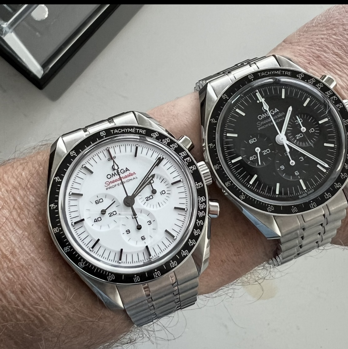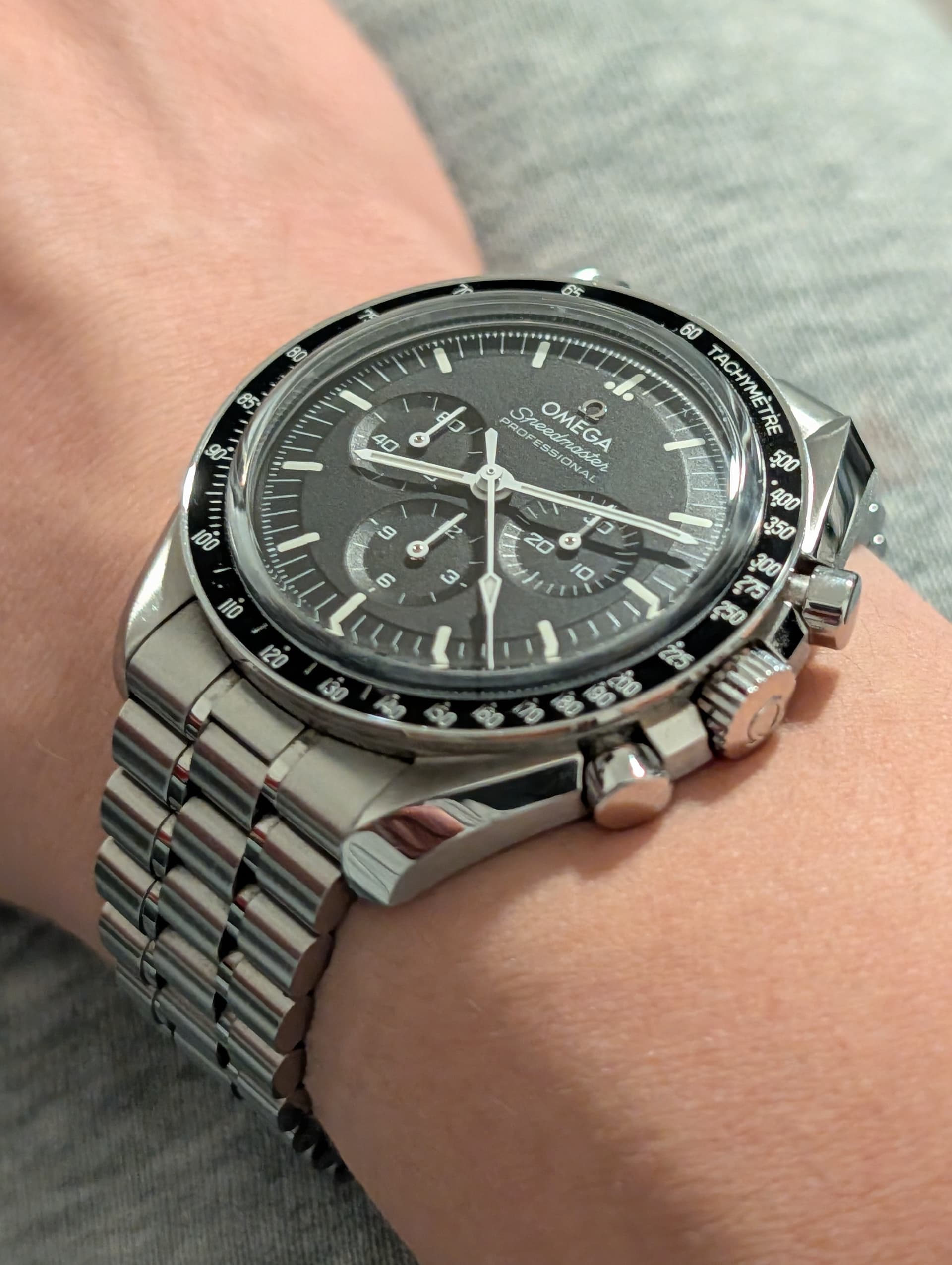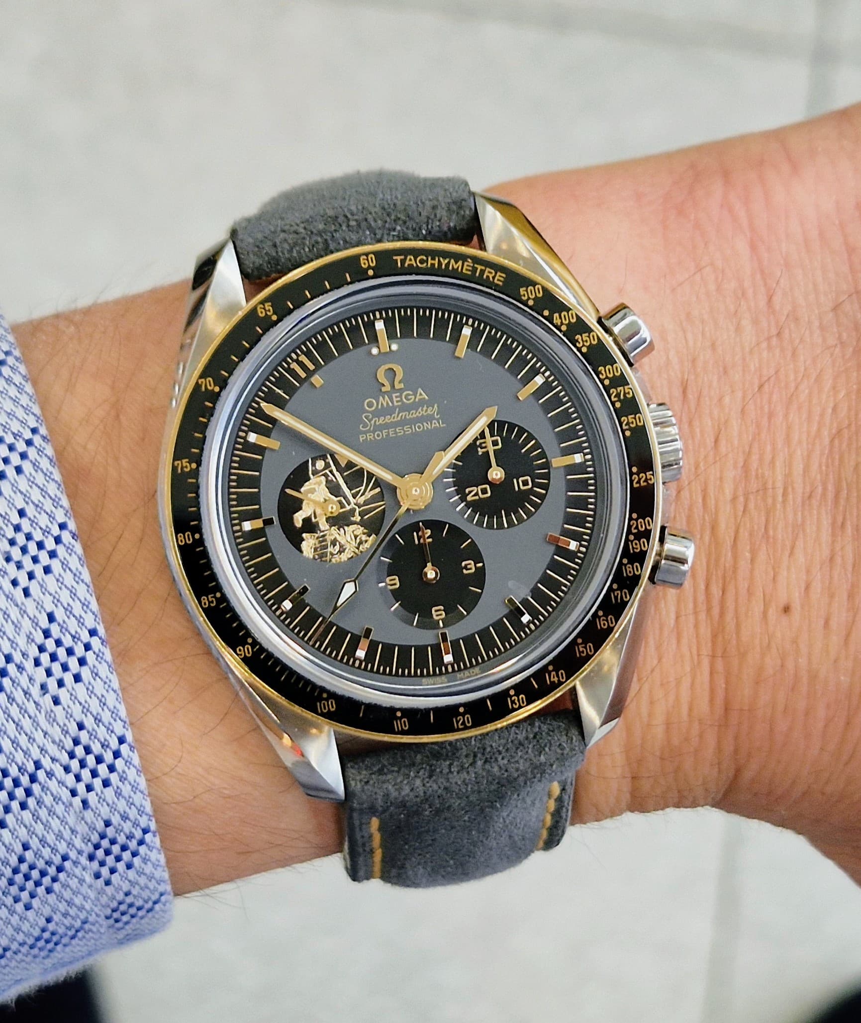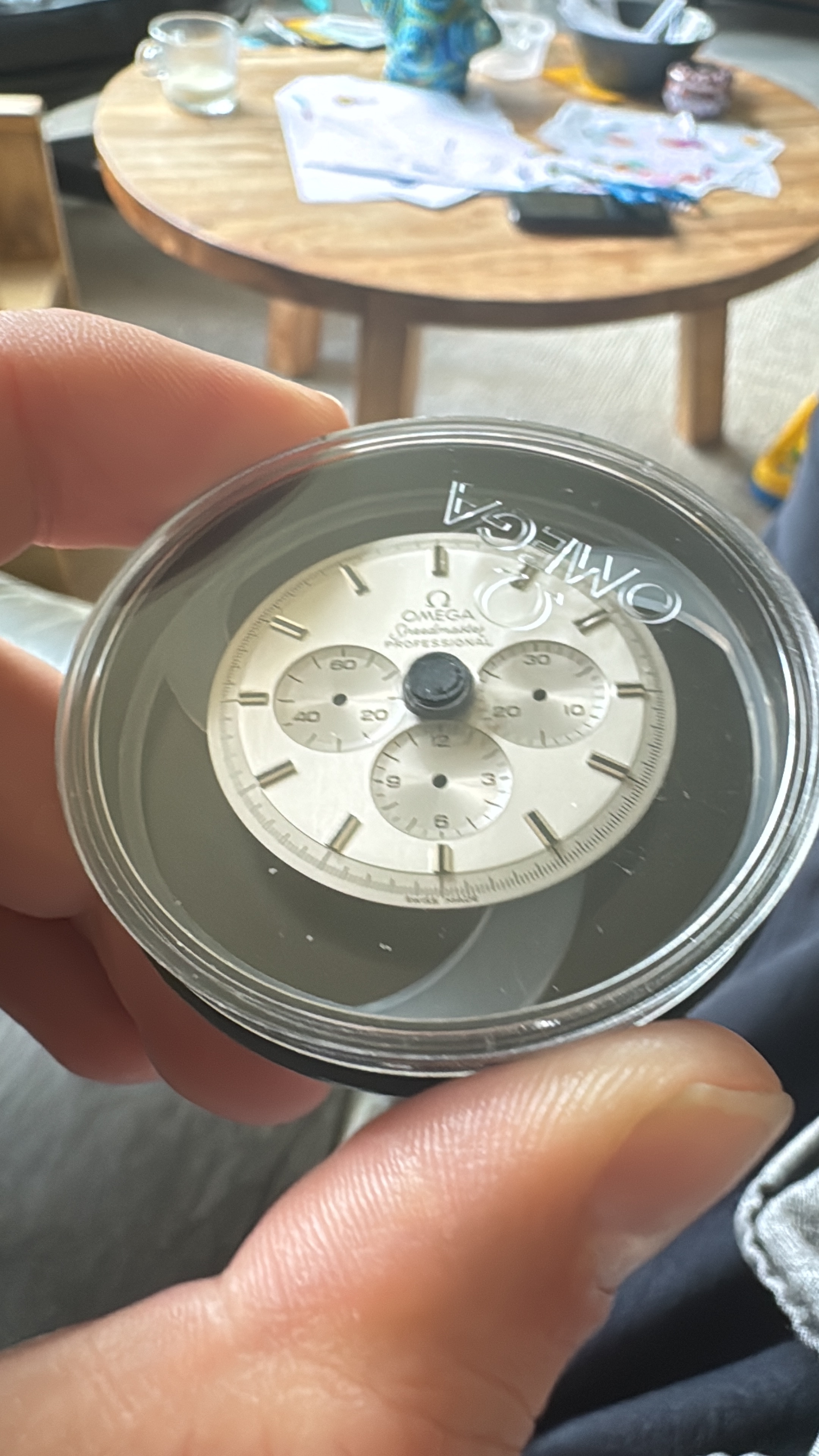 Wijzerplaat uit een 345.0802 Apollo XI Witgoud early 80’s (waar er 20 van zijn totaal) in een moderne stalen Speedy. Het origineel ![]()