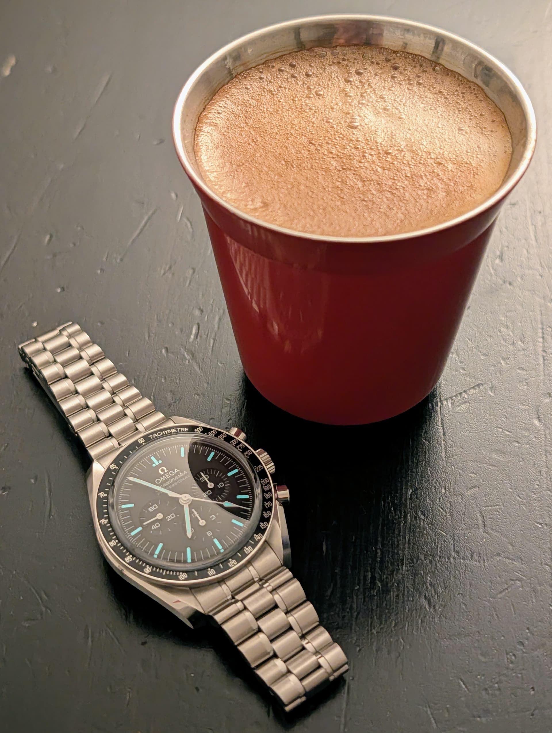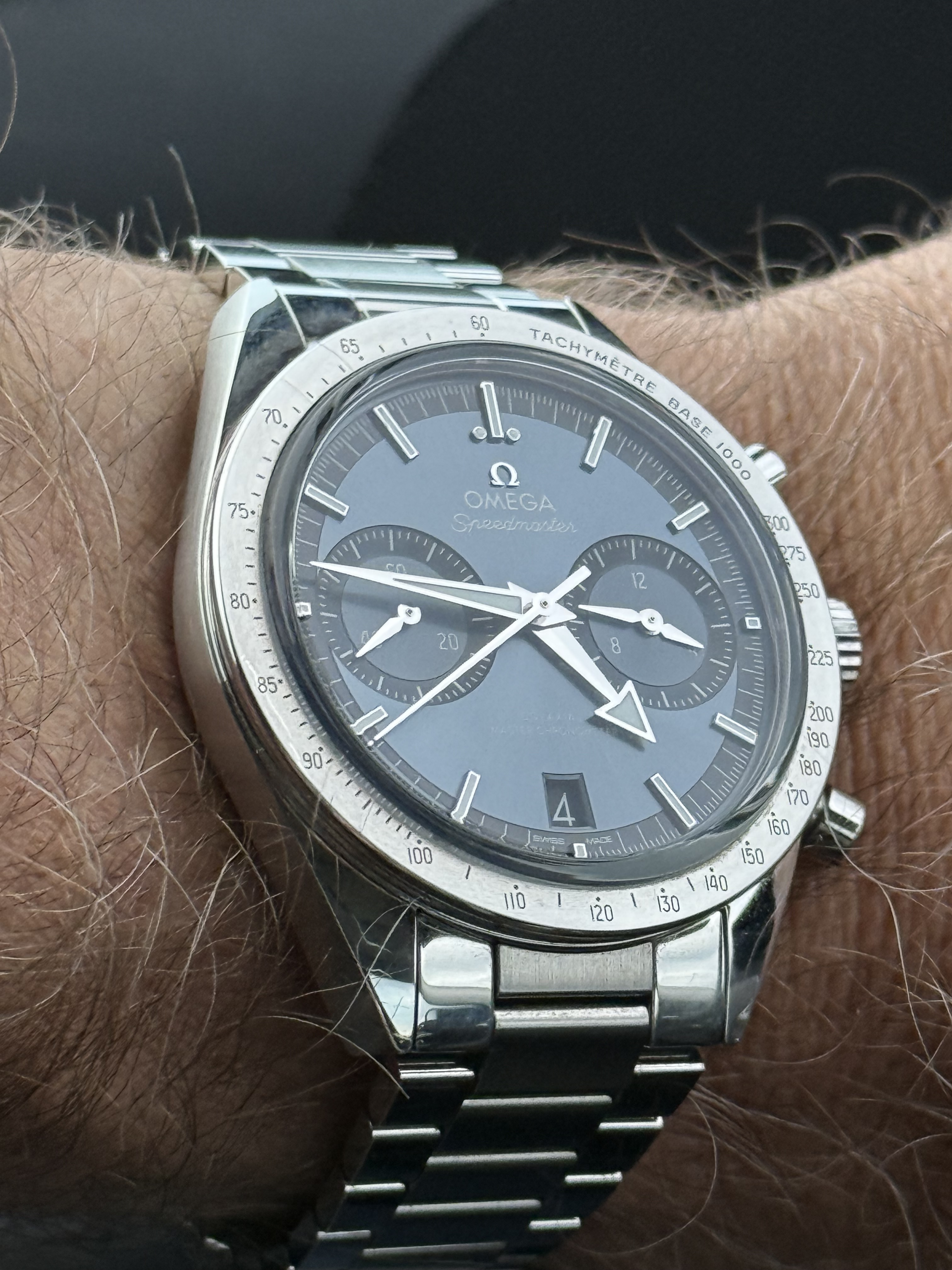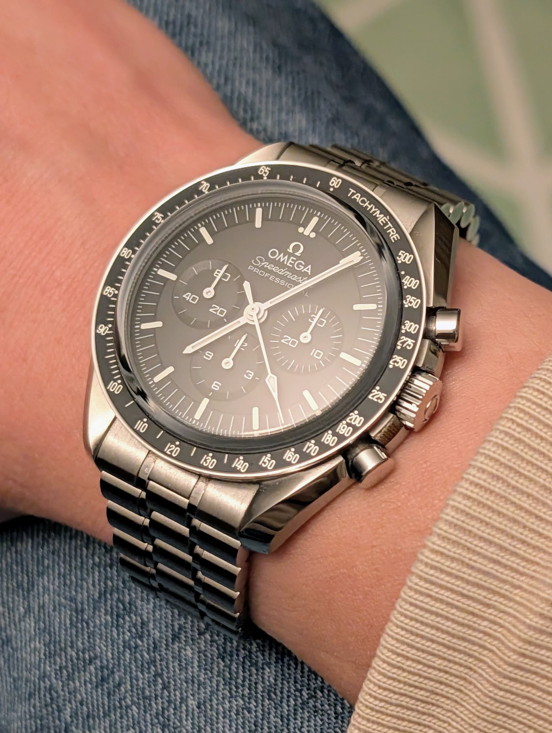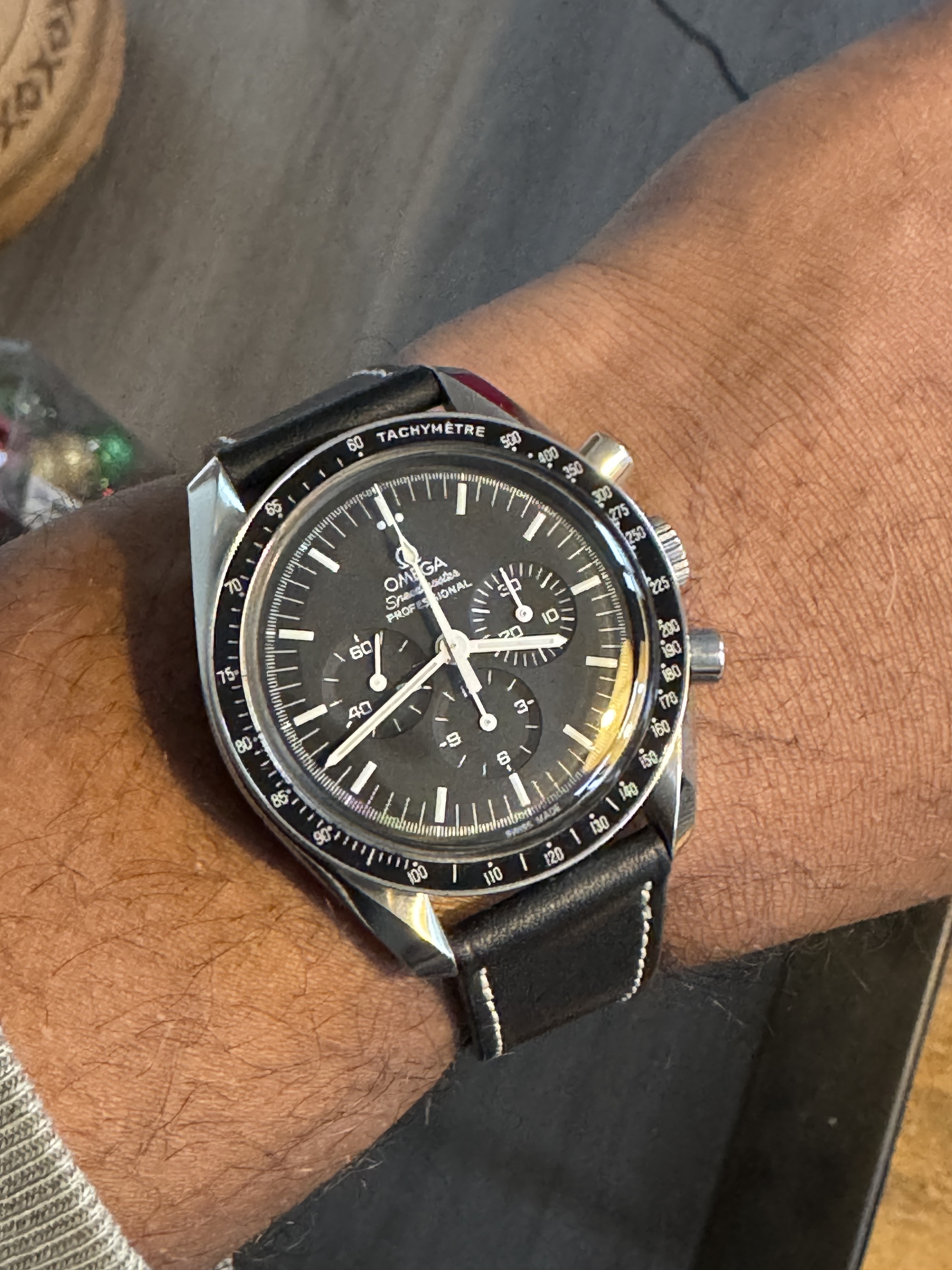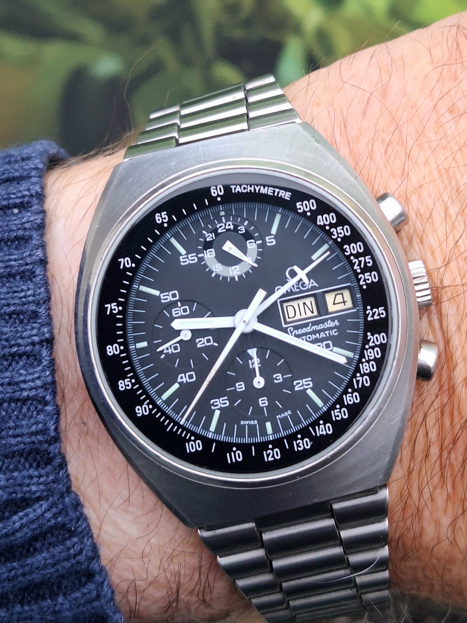 Wijzerplaat uit een 345.0802 Apollo XI Witgoud early 80’s (waar er 20 van zijn totaal) in een moderne stalen Speedy. Het origineel ![]()