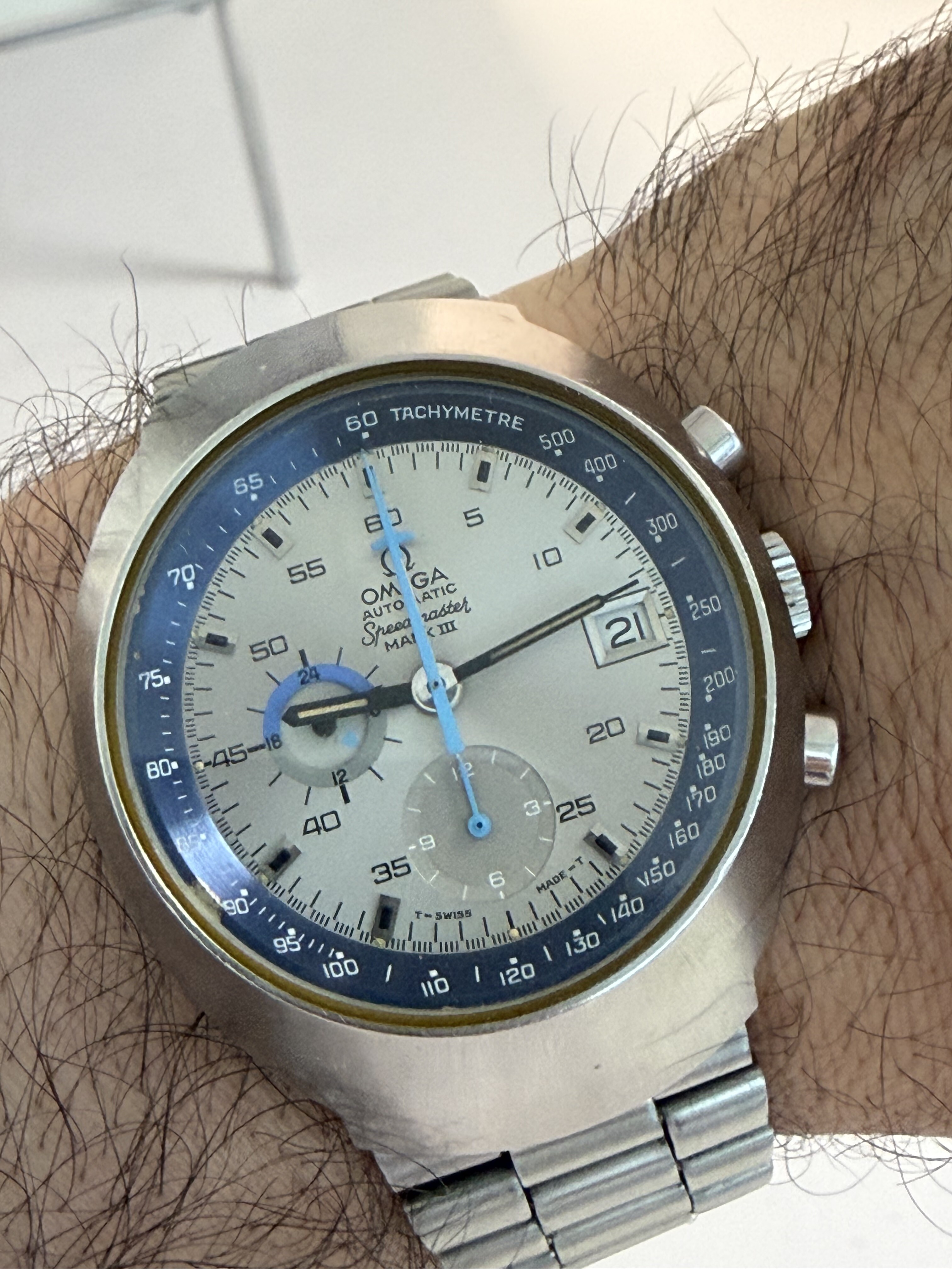 Ja hij is prachtig. Ik vind die met de electric blue dial ook mooi maar deze doet daar zeker niet voor onder. Mooie grijze/zilveren wijzerplaat met zwarte wijzers. Ik hoop dat je kunt aangeven indien de staat nog goed genoeg is om zoveel mogelijk originele onderdelen te behouden. Vaak zijn de nieuwe service onderdelen (en dan praat ik niet over een rubbere seal maar over wijzers/dials/bezel) net een beetje anders dan de vintage onderdelen. Zo kun je bij deze vintage modellen (maar ook de PloProf, Mark II, flightmaster, etc) heel snel zien of het nog de originele authentieke onderdelen bevat. Bijvoorbeeld de T - Swiss Made - T op de wijzerplaat. Wanneer er een service plaat in zit dan zijn de T’s weg en zit er ook geen tritium lume meer op, maar SuperLuminova. Hetzelfde voor de wijzers. Een getraint oog kan het verschil zien tussen een originele bezel en een service bezel. Ik ben niet afgestudeerd op de mark III maar bij andere modellen zit er bijvoorbeeld een ander type lume op de bezel (divers), een ander lettertype font, bij inner bezels kan de step een andere hoek hebben enzovoorts. Ik weet niet of bij de mark III de bezel op/in het glas zit (zoals bij de Mark II) of dat het een inner-ring betreft.