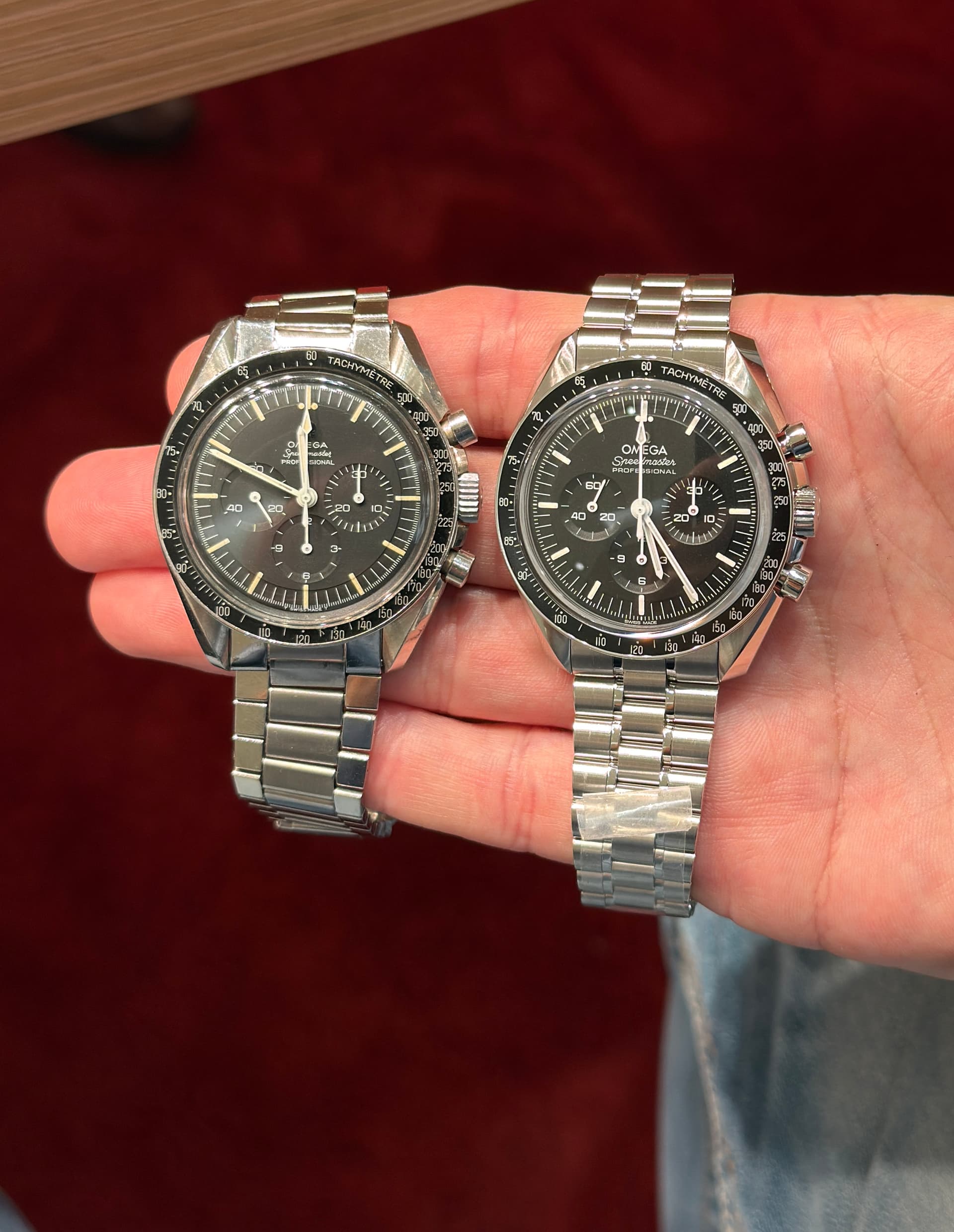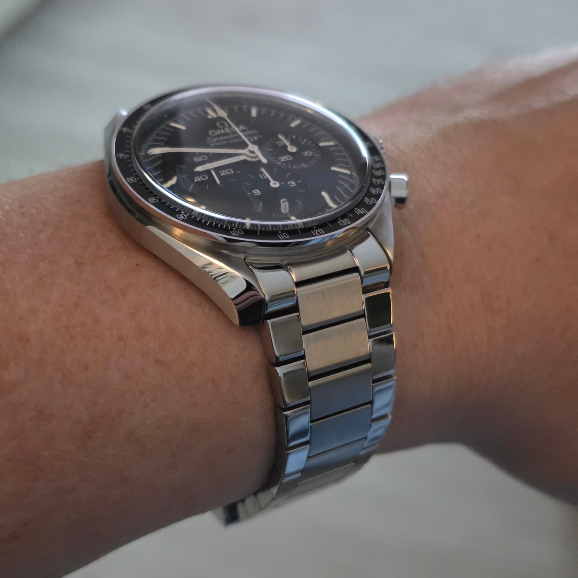Dat klopt ook, alle 3861 Moonwatches hebben dezelfde kastvorm als de 105.012 (natuurlijk de Speedmaster referentie die als eerste op de maan werd gedragen) en dus ook die drukkers. De Apollo 11 50th Moonshine heeft ook deze details, ondanks dat dit niet zo was op het origineel.