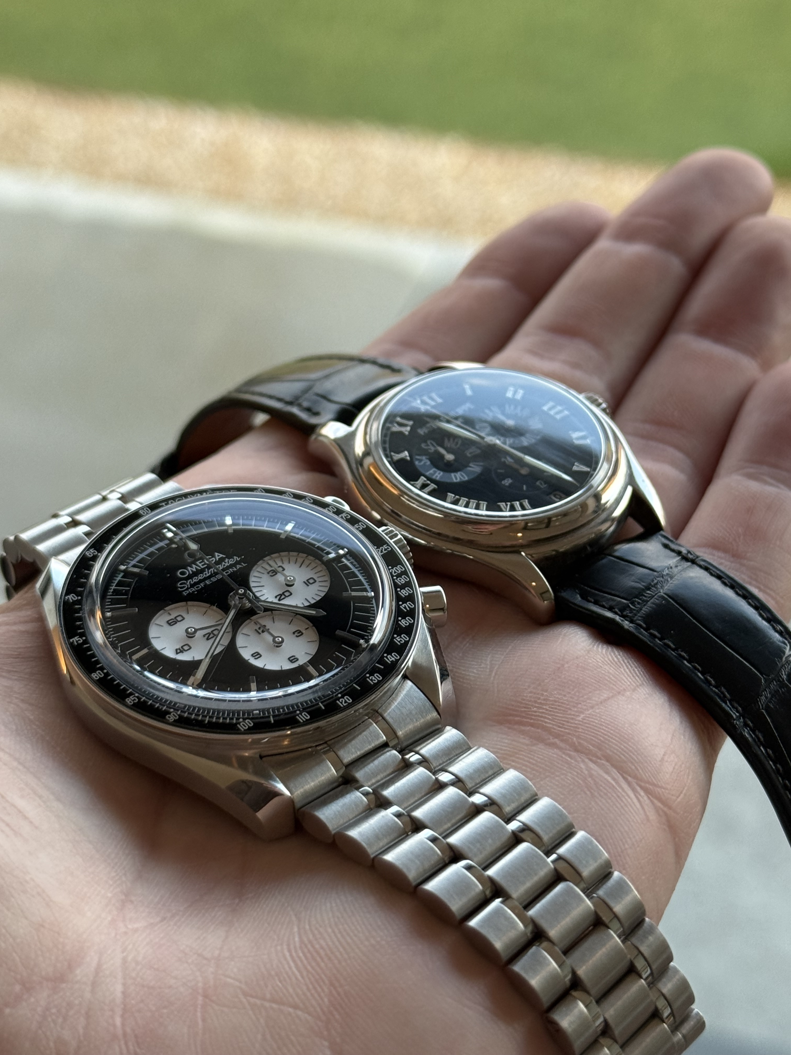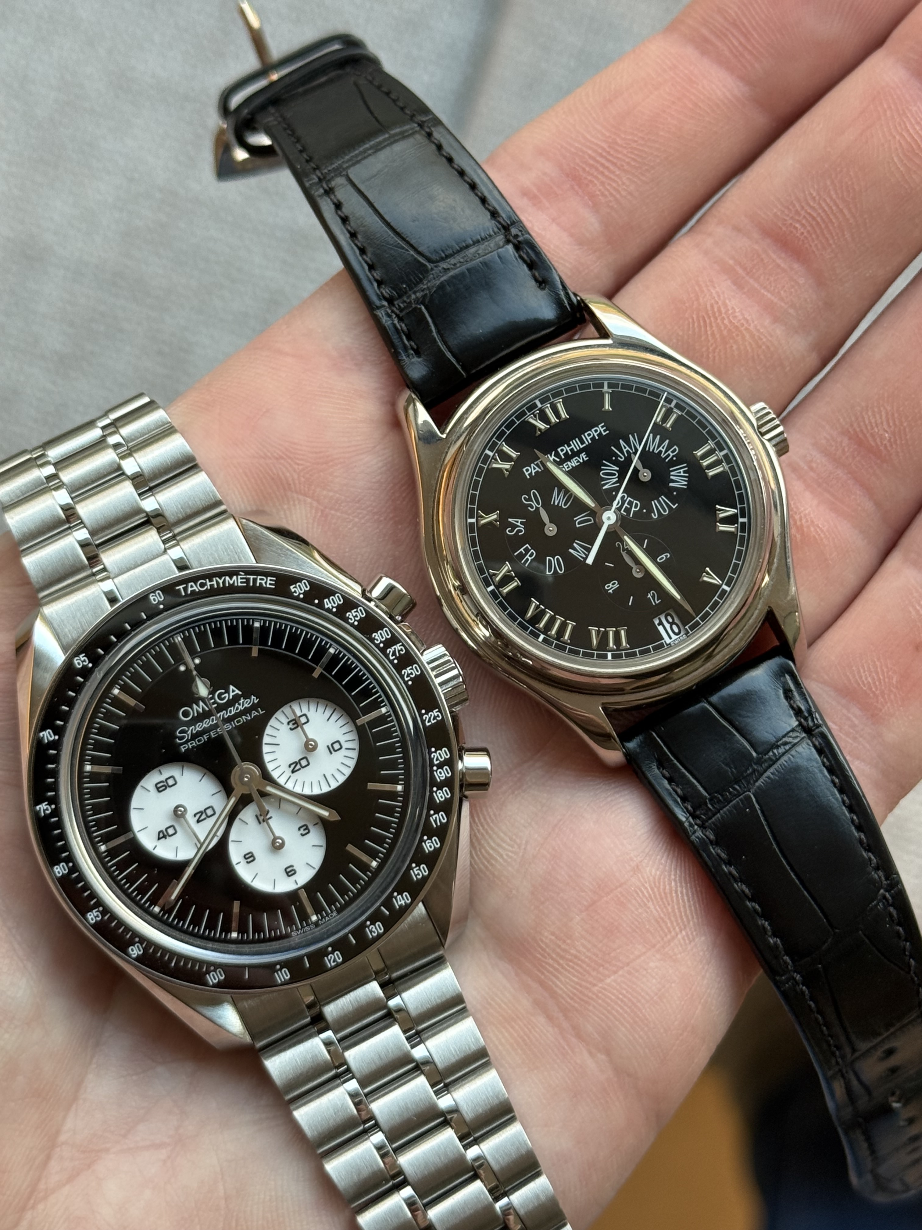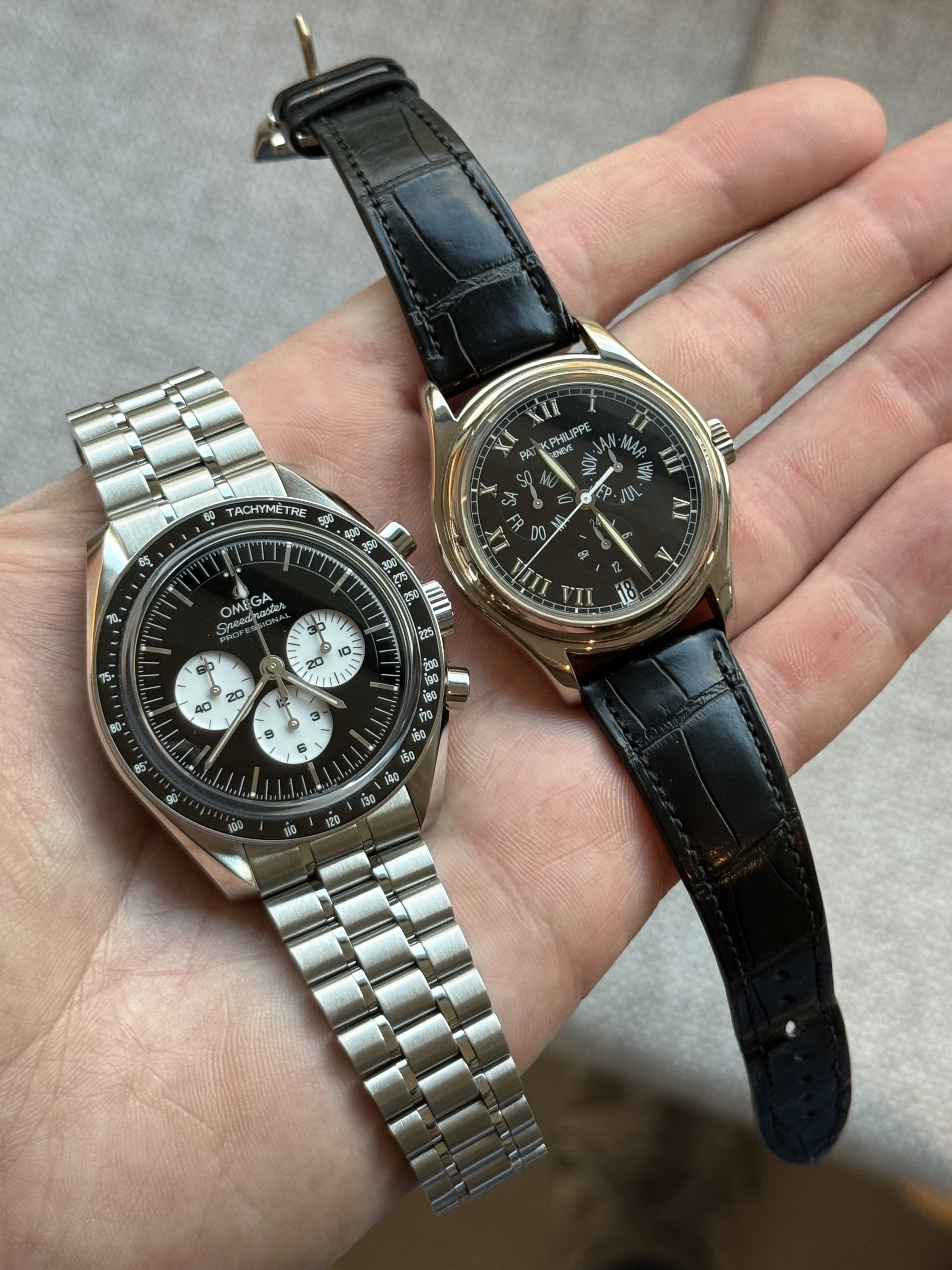 Past dat bij een toolwatch, nee, die moet altijd goed afleesbaar zijn. Maar deze Speedmaster brengt wel die unieke en luxe ervaring die ik ook zoek in een horloge. Al blijven de afmetingen wel een ding, zeker omdat ik dagelijks een 37mm Patek draag die een heel stuk subtieler is.