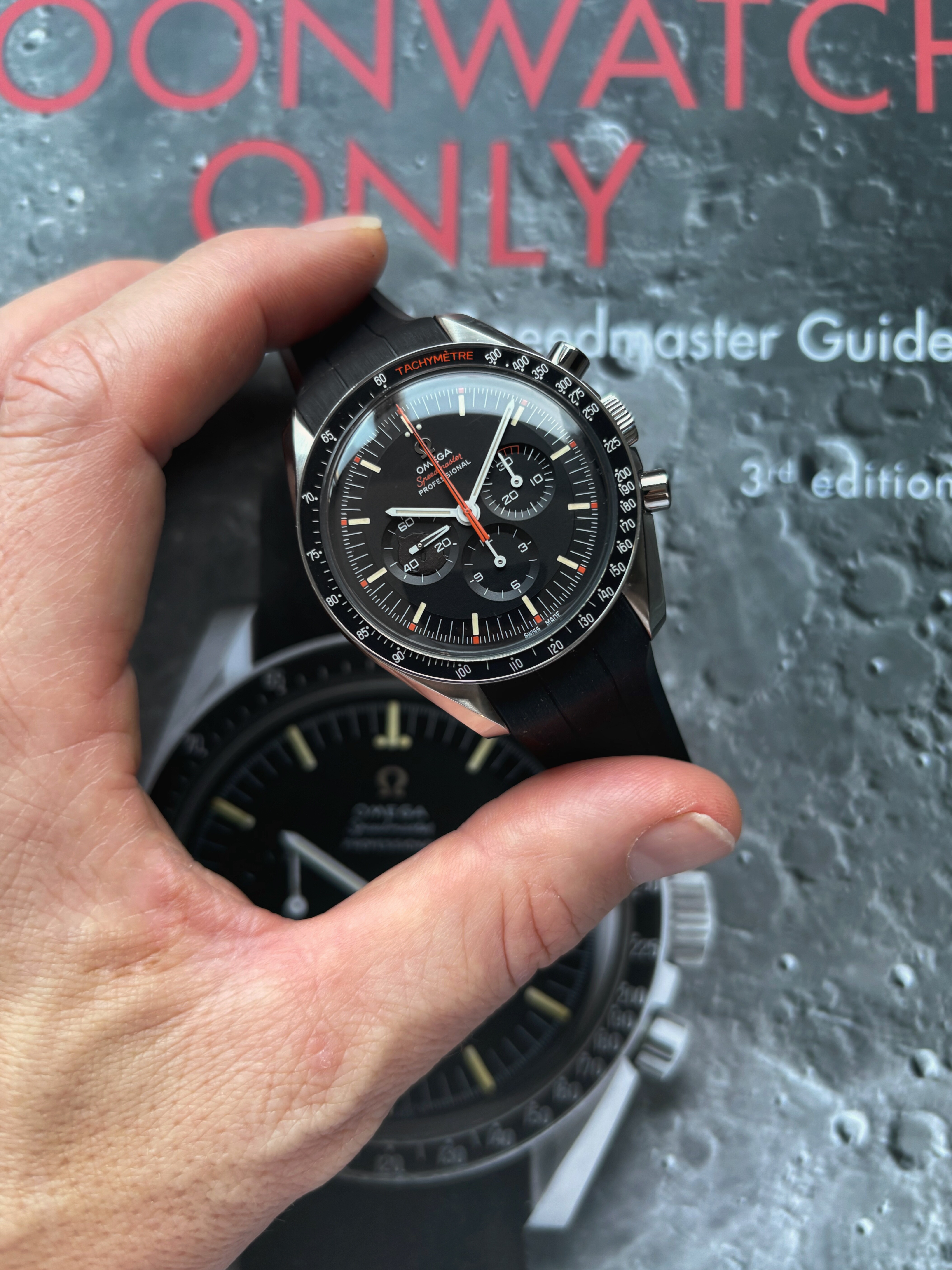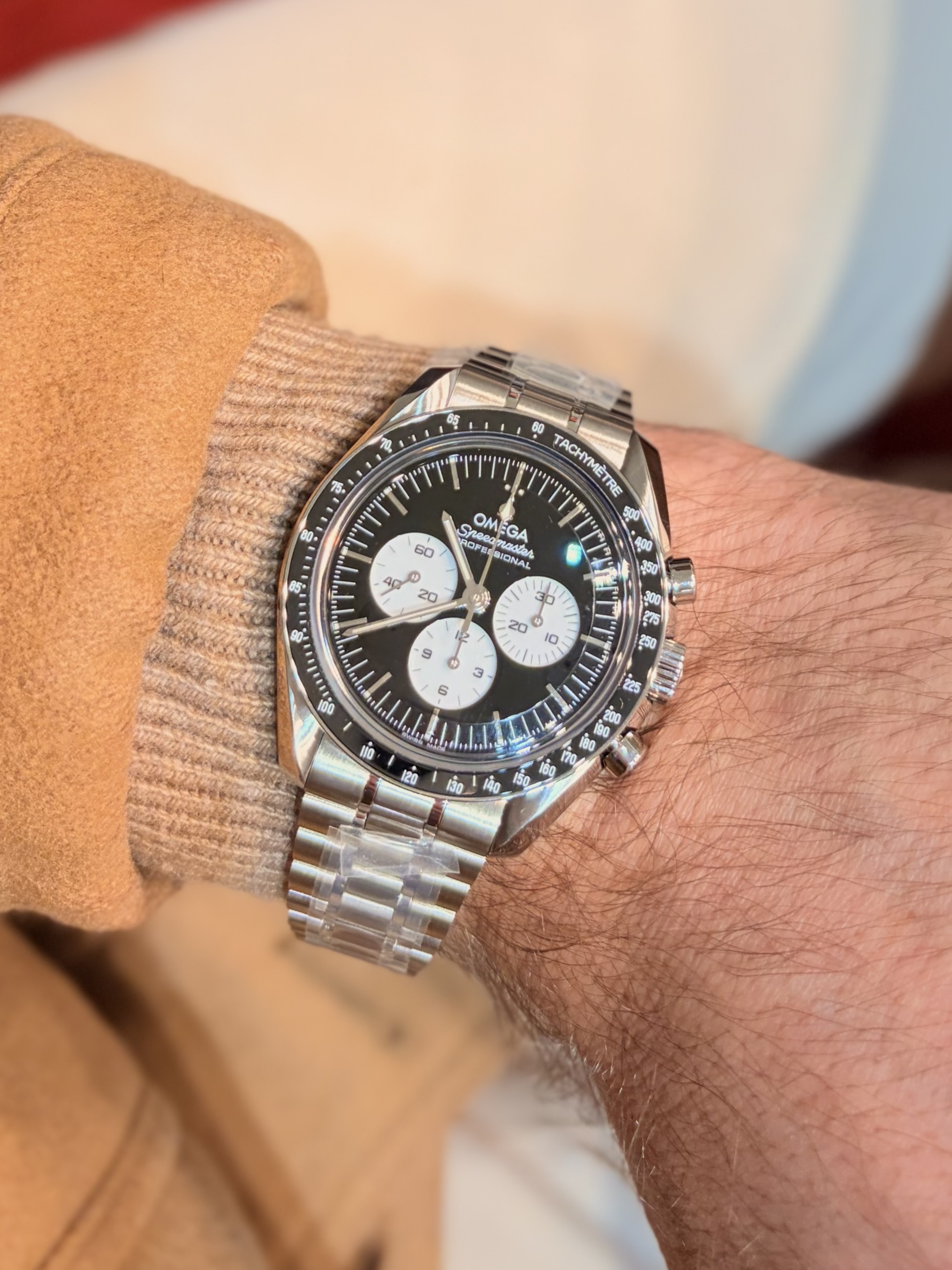 Ik had de gelakte Speedmaster gister ook voor het eerst gezien. Het oogt echt als een heel ander horloge ten opzichte van de normale Moonwatch doordat alles glossy en shiny is (bezel, dial, hands, markers, logo).