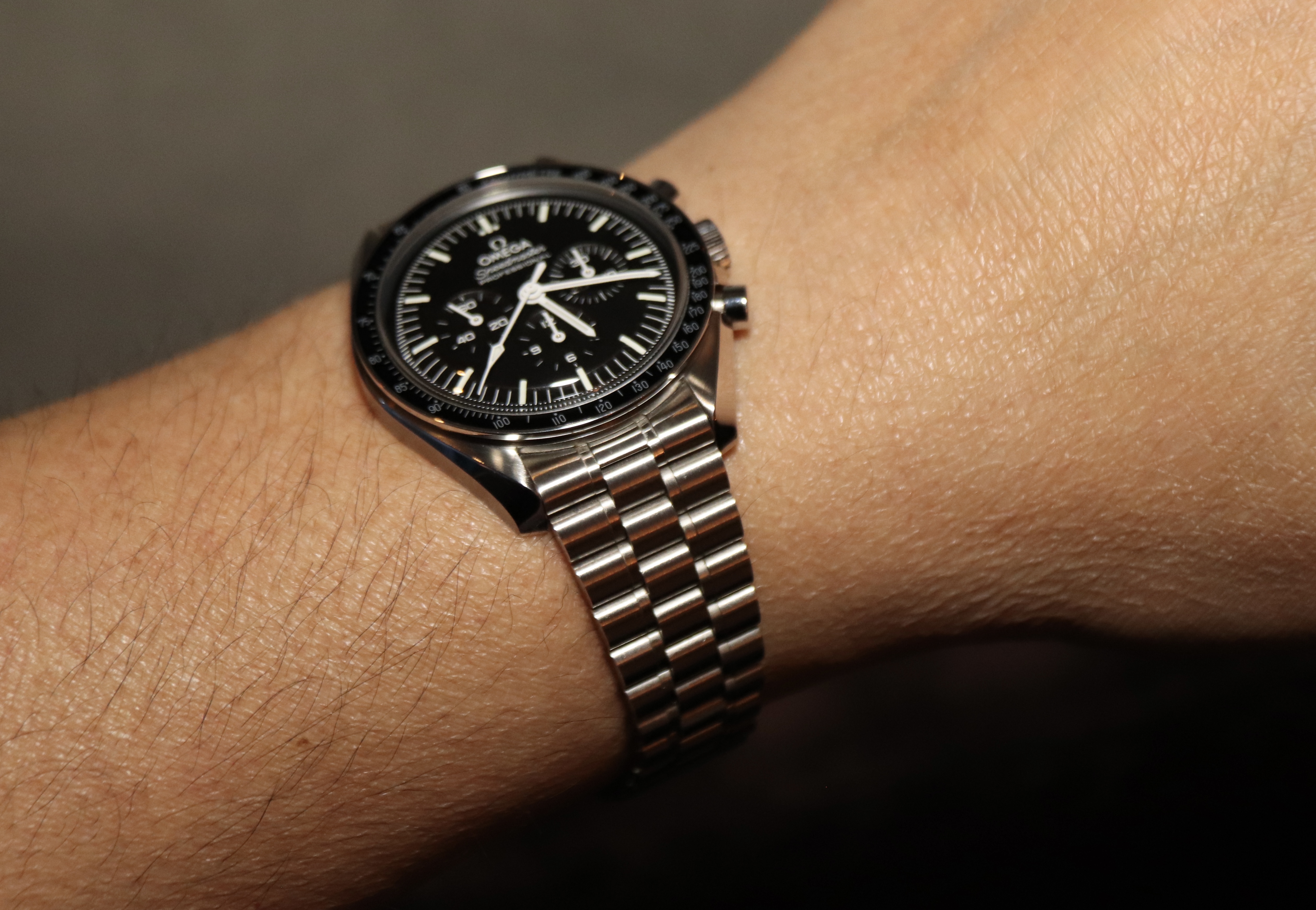 Totdat ik de witte Speedy om de pols van de verkoper zag. Bij het uitkomen in 2024 al veel naar gekeken, maar dacht dat de witte plaat te groot zou ogen op mijn relatief kleine polsen. De verkoper was zo aardig om mij zijn horloge, op de rubber band, te laten passen en dit was totaal niet het geval! Oogde niet groter dan de andere Speedy’s (al voelde de FOiS wel kleiner aan). En wat is die witte plaat mooi en oogt ook helemaal niet vlak, waar ik ook wat ‘bang’ voor was. Volgende week de witte Speedy op staal passen om te kijken of dat nog steeds zo’n indruk maakt, maar het lijkt erop dat door toeval de keuze nu de hele andere kant op gaat…