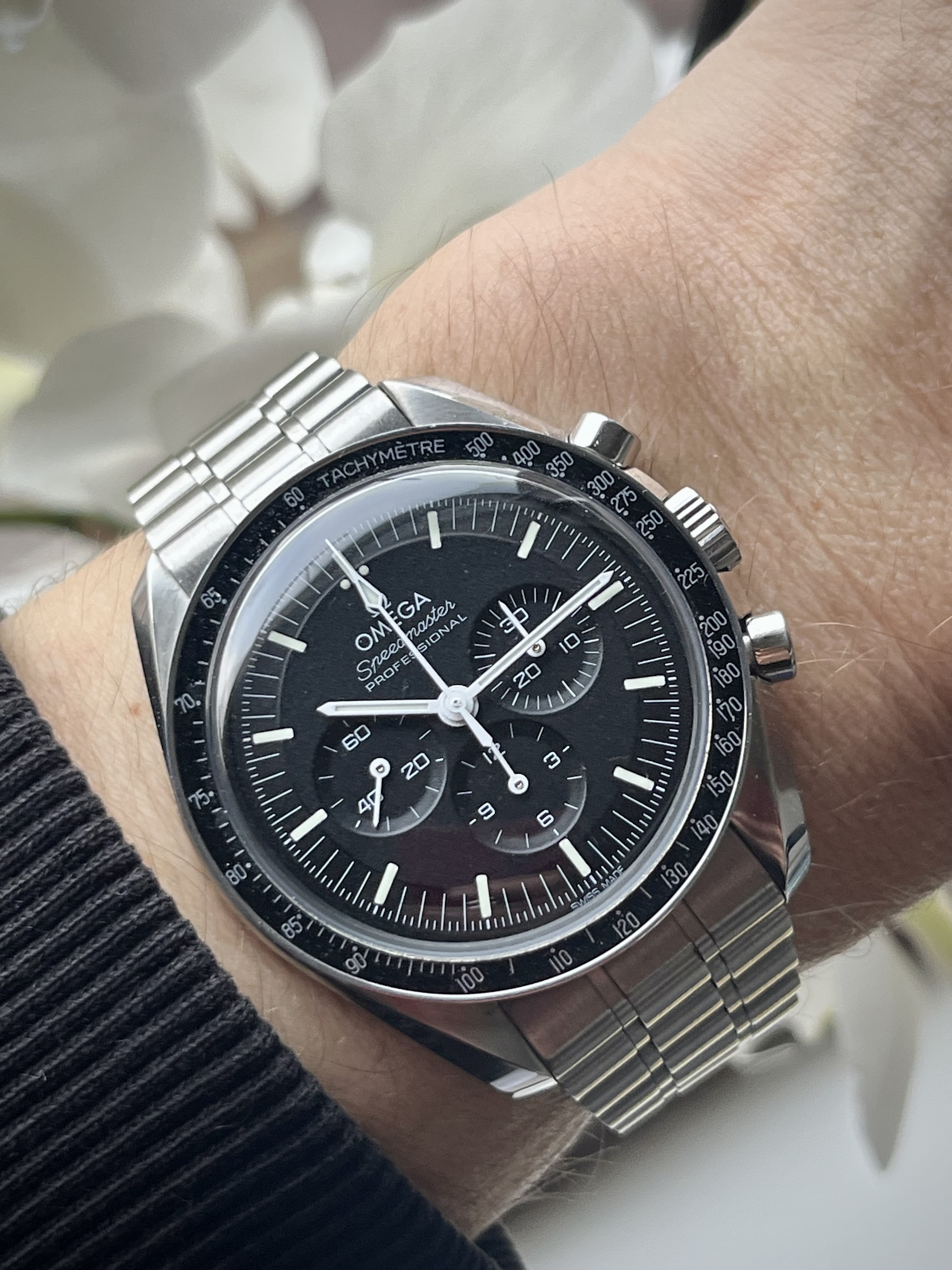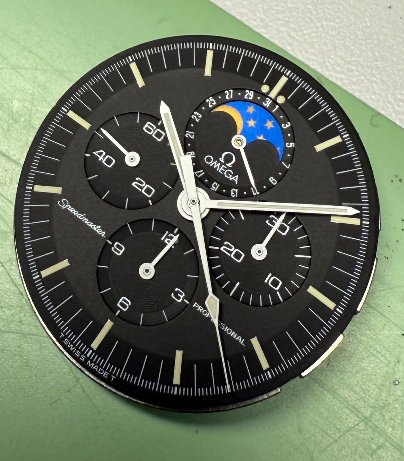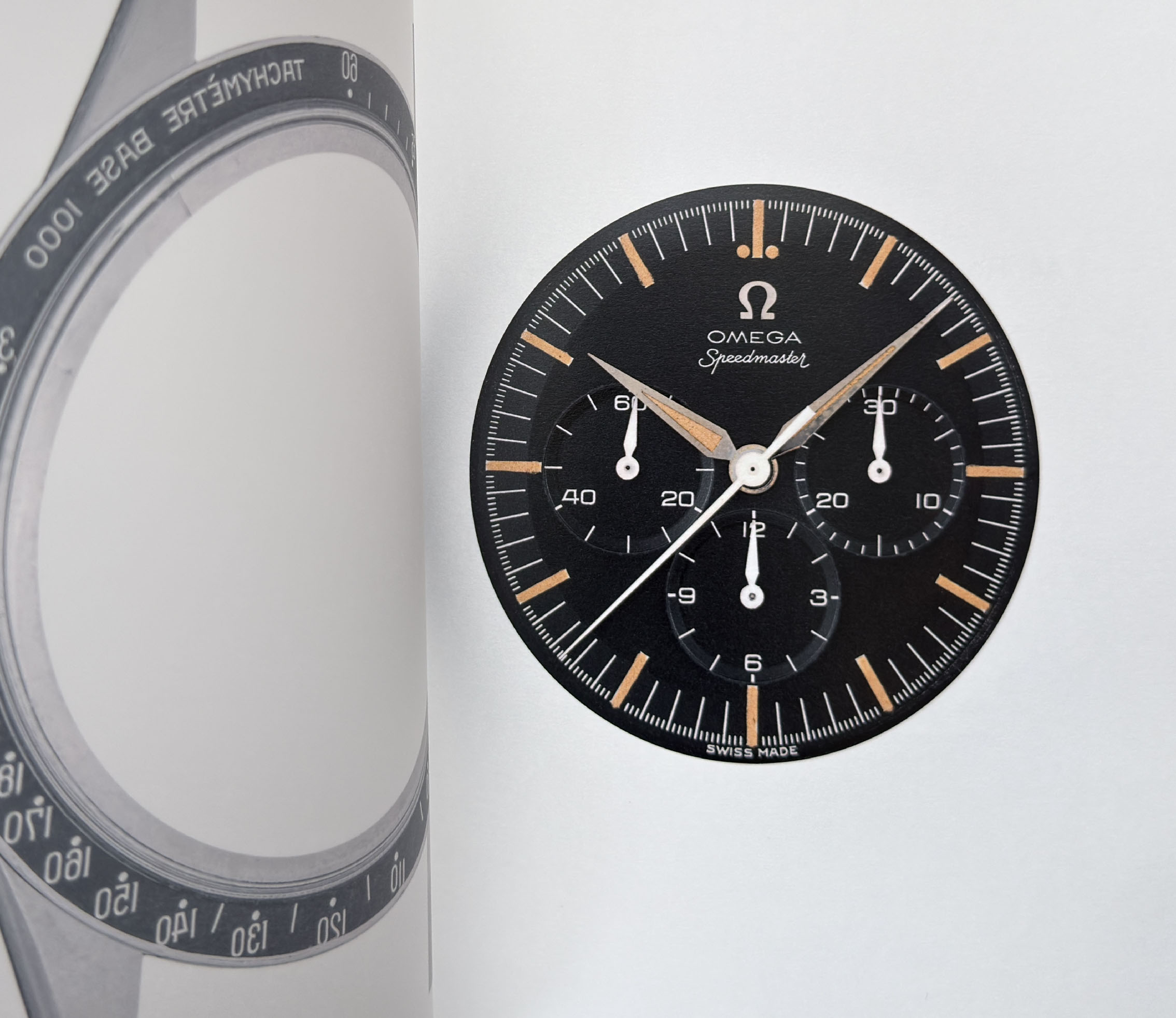 Toen ik zes jaar geleden voor het eerst een losse Speedmaster wijzerplaat in mijn handen had, was ik verkocht. Wat is dat een gaaf gezicht, zonder dat glas ervoor. Ik had hetzelfde toen ik vorig jaar de Speedymoon naakt zag liggen.