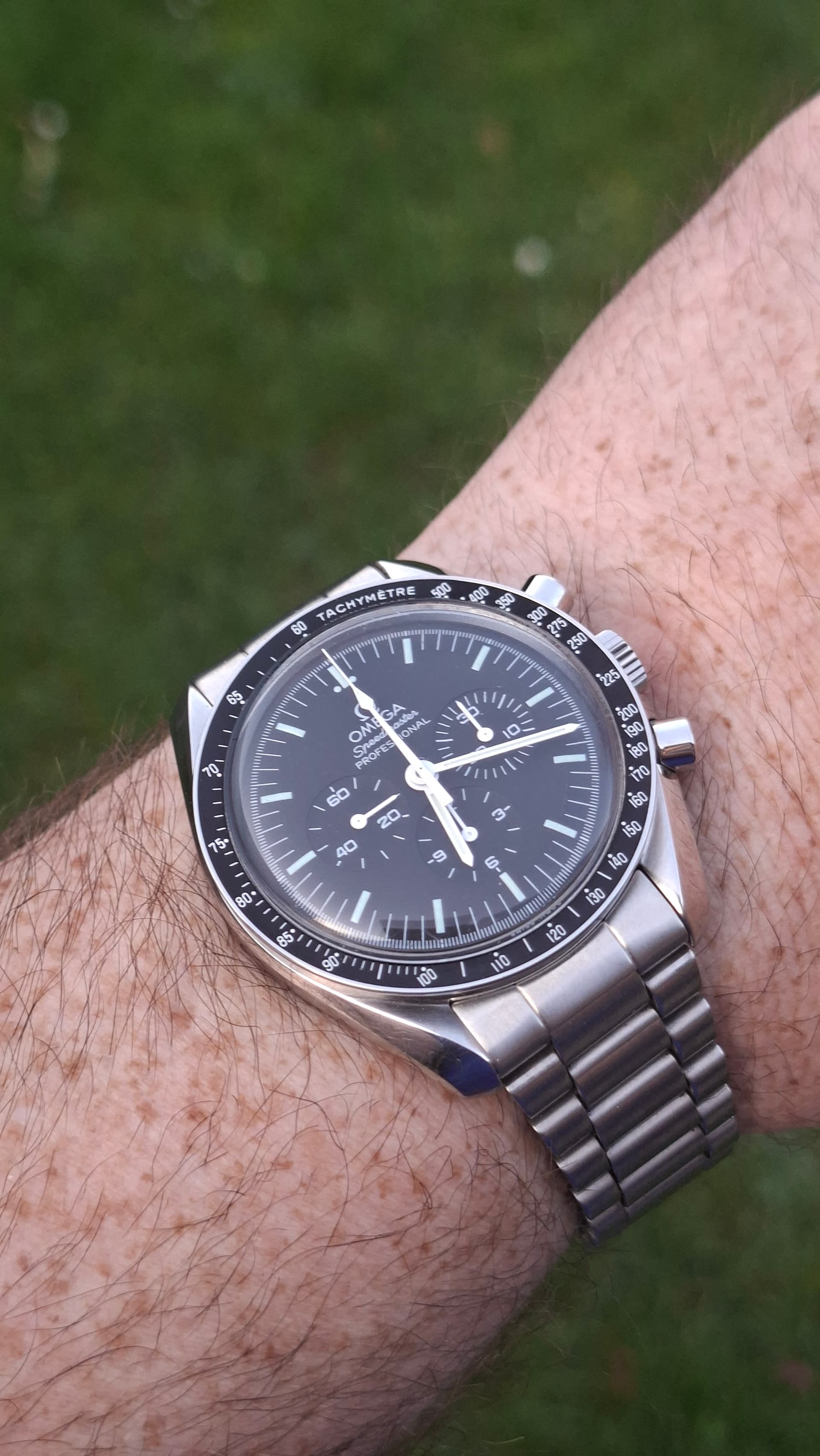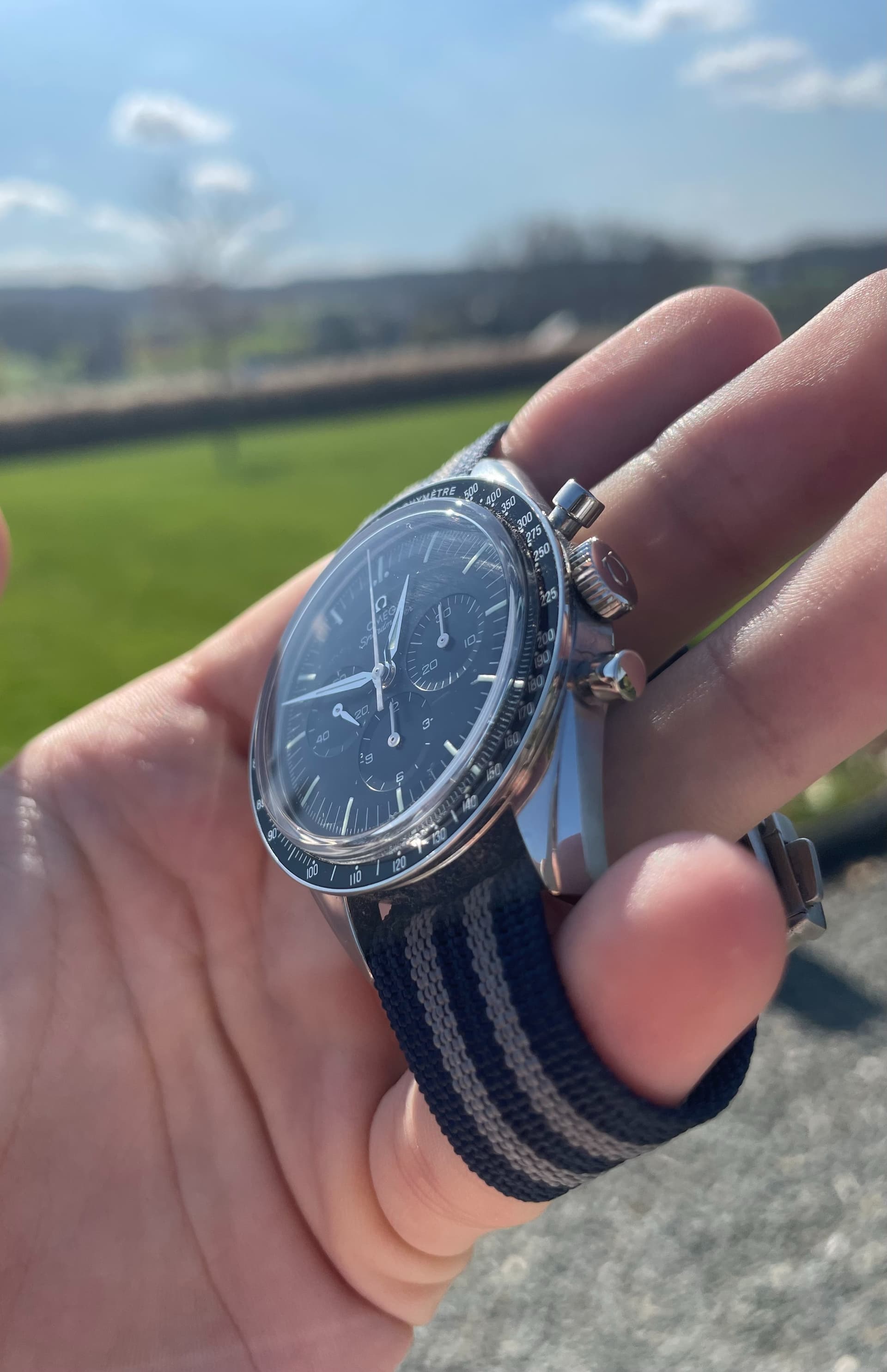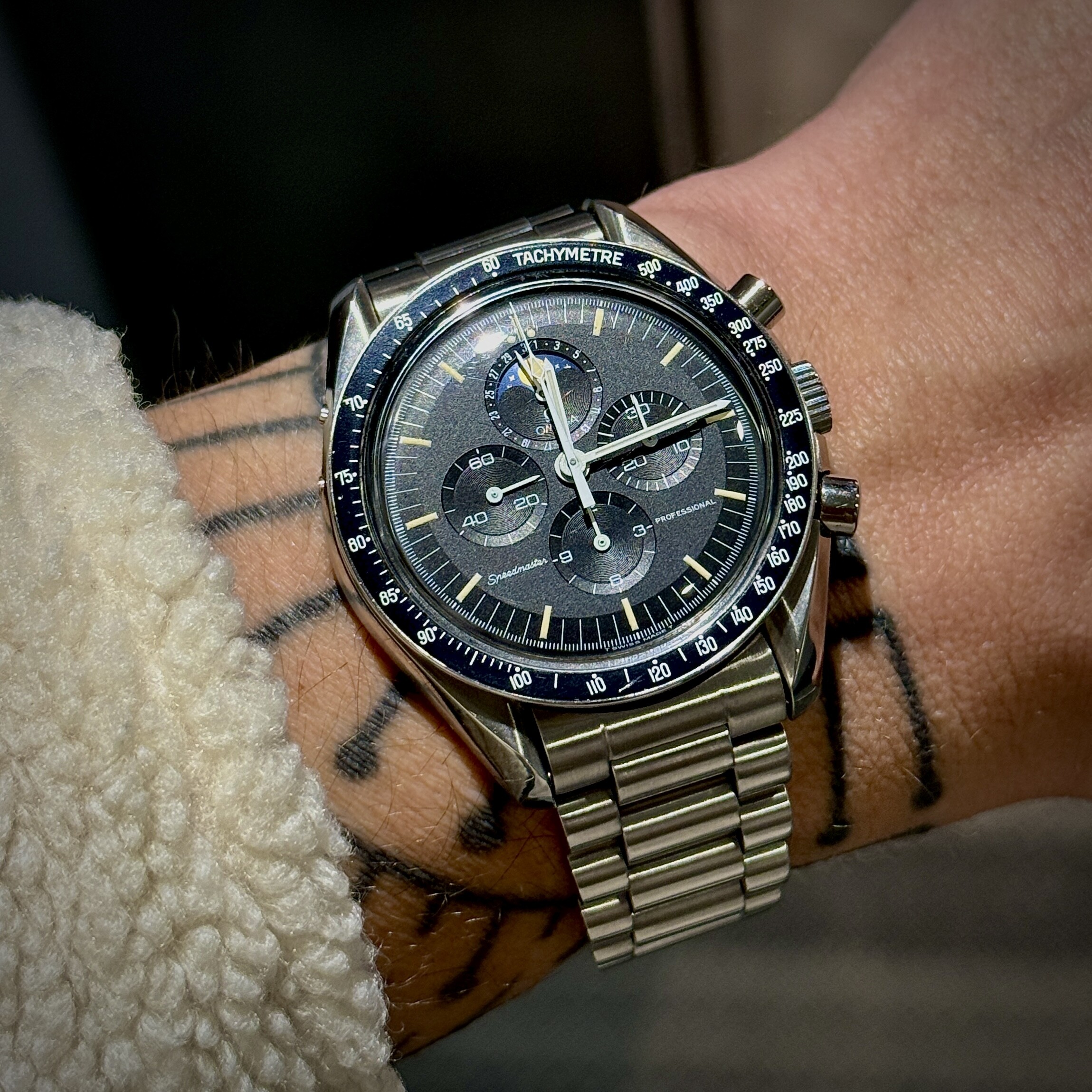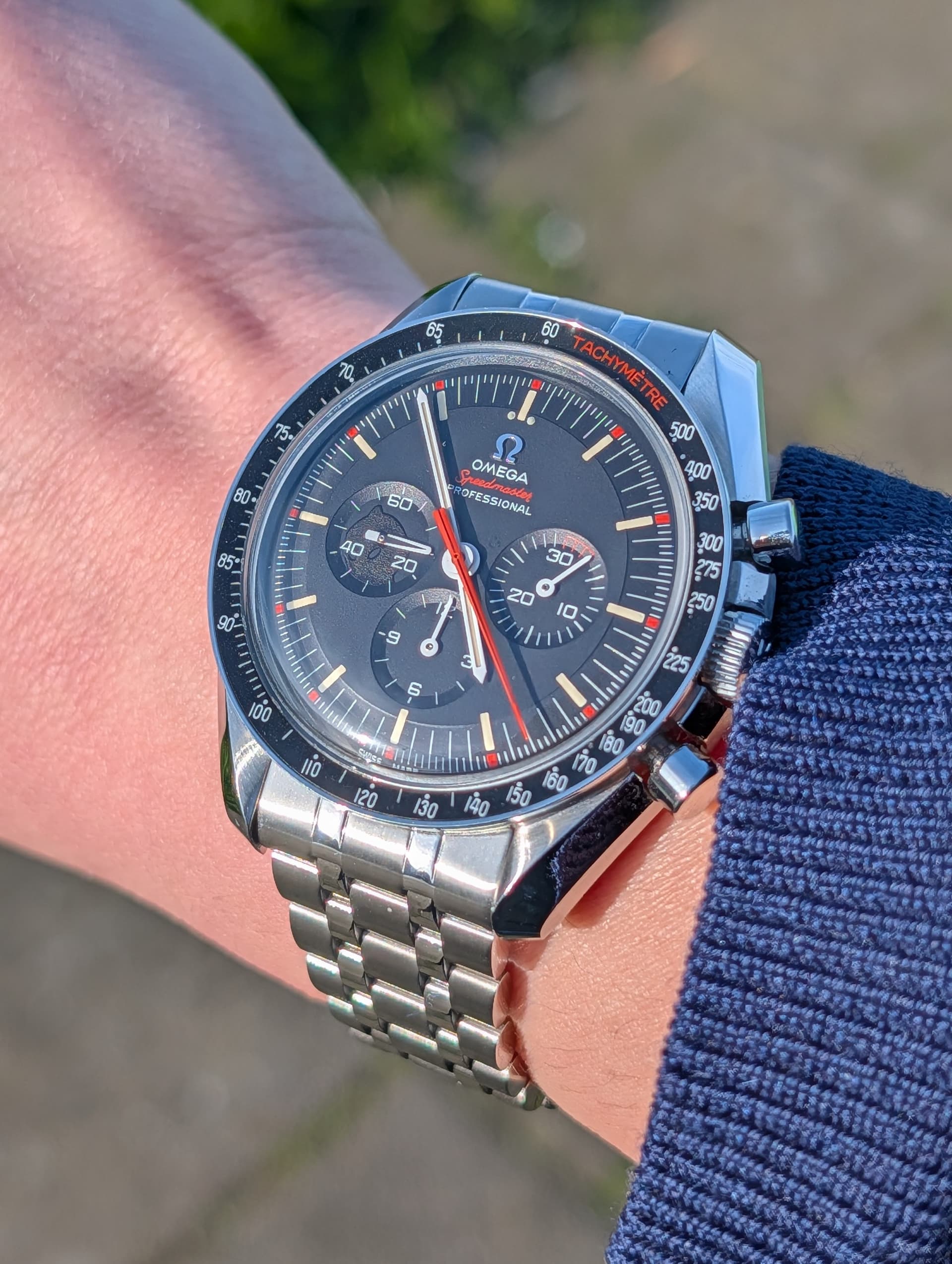 Wijzerplaat van deze Speedymoon heeft een soort zijdeglans. Sommigen, zoals die van @PloProfesseur hebben dan weer een matte plaat. Leuke verschillen binnen de kleine oplage van deze referentie.