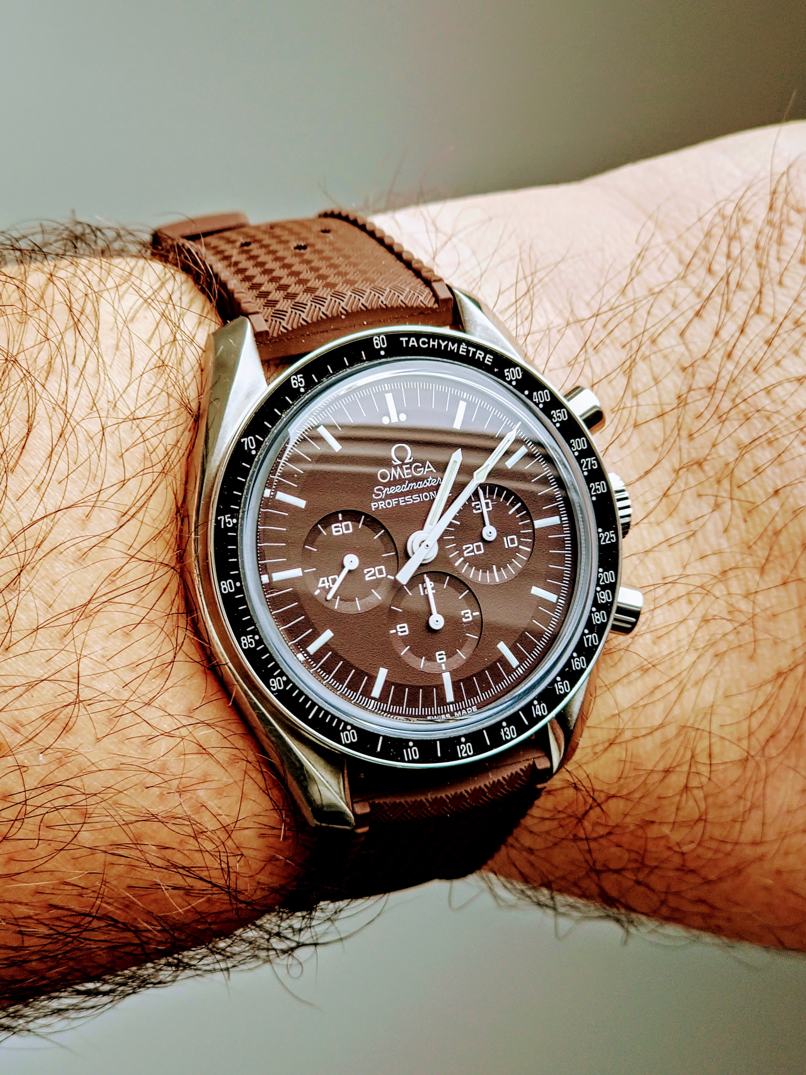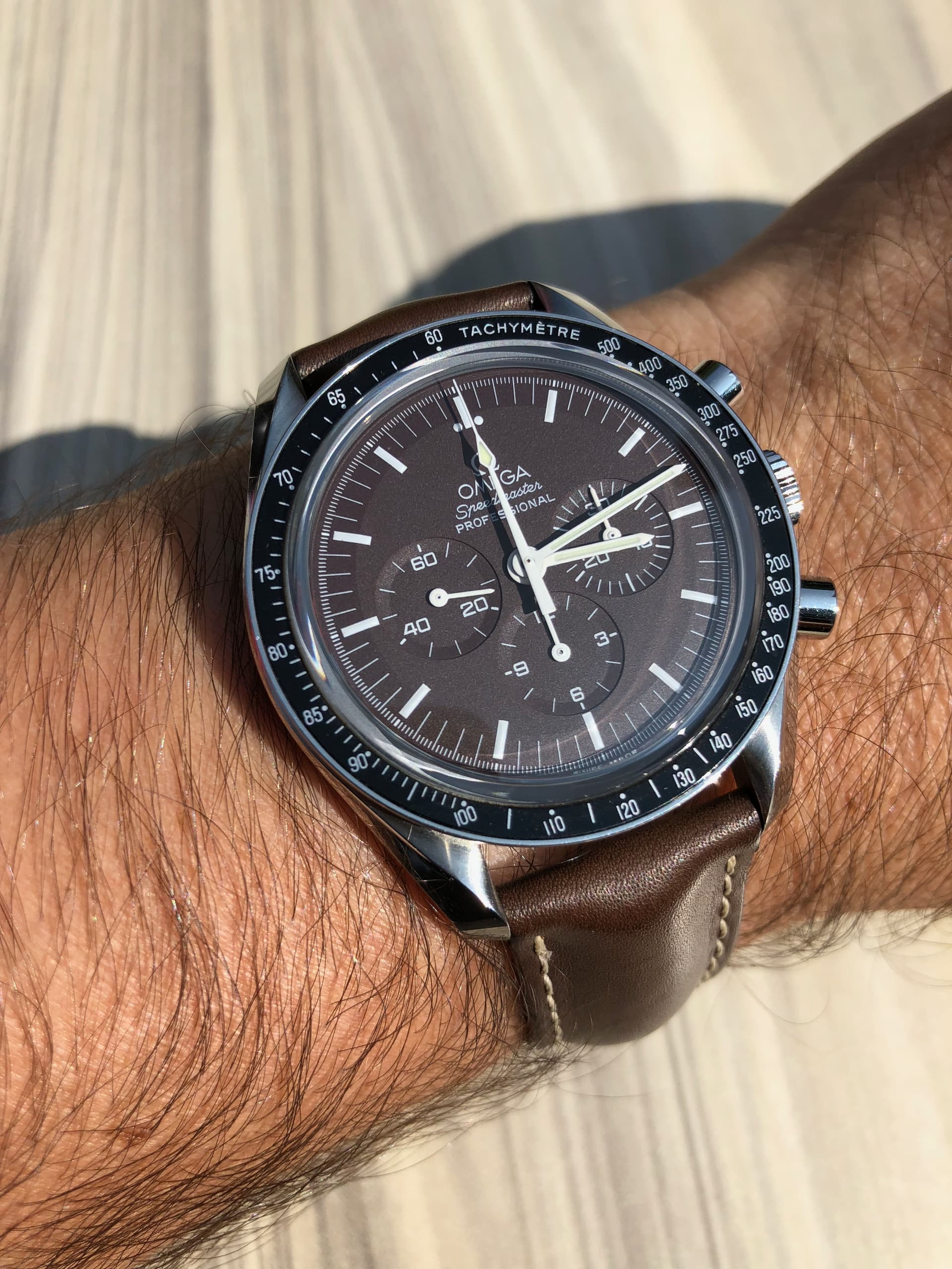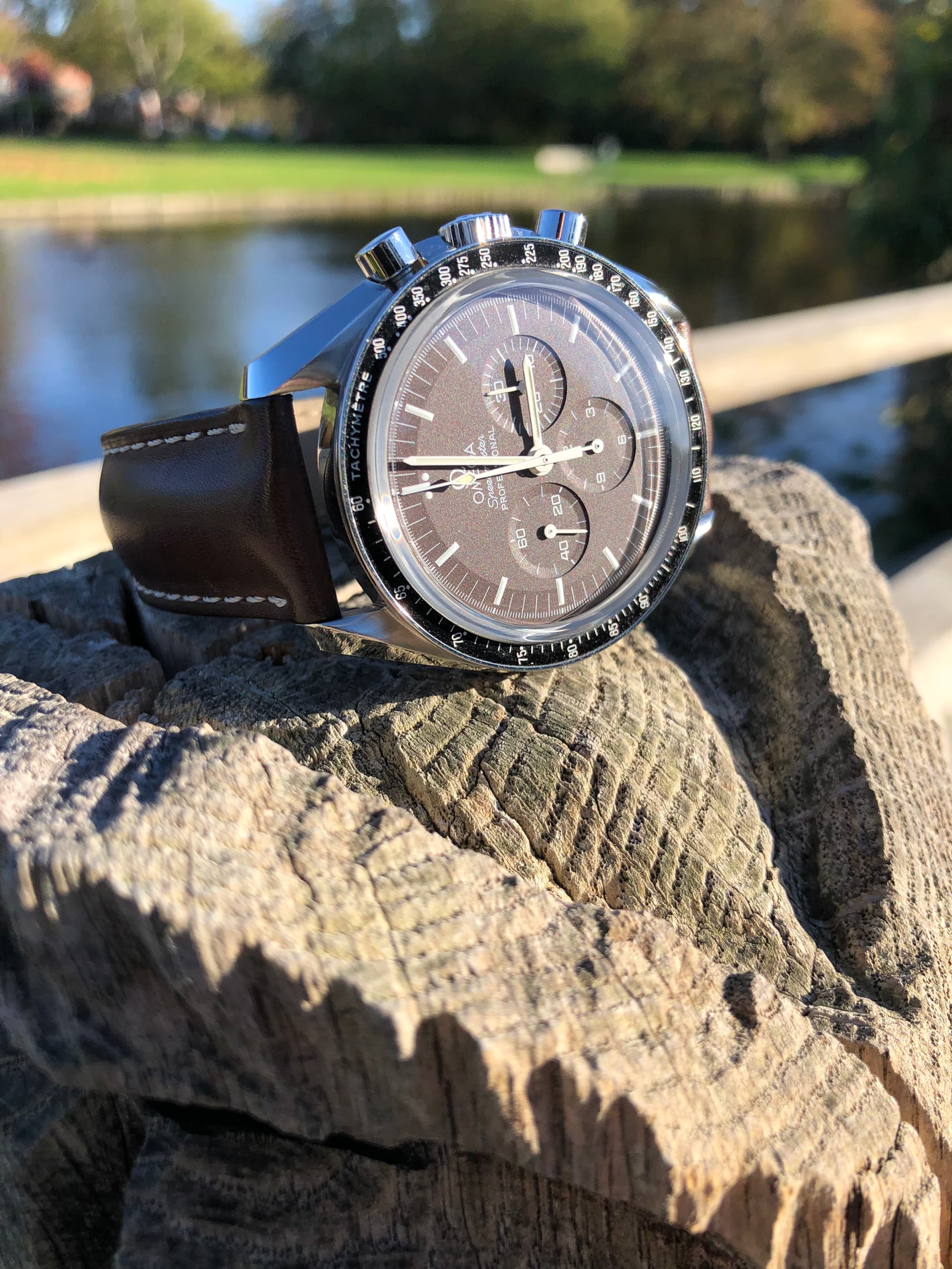 Er zit ook nog een leuk verhaal aan vast. Een goede Duitse vriend van me, fervent horloge liefhebber en bezitter van een grote en waardevolle collectie (PP, AP, Rolex,…), wou absoluut geen Speedmaster. Op een dag zijn we een avondje wezen stappen in Brussel toen het gesprek weer daarover ging. Ik droeg die dag toevallig deze chocolade Speedmaster, heb hem spontaan afgedaan en aan hem gegeven met de woorden “nu is hij van jou, je mag me ervoor betalen wat je hem waard vindt, zonder minimum maar maximaal €3999” (dat was dus in 2019). Daar had hij geen antwoord op en zo is hij dus in het bezit gekomen van zijn eerste en enige Speedmaster.