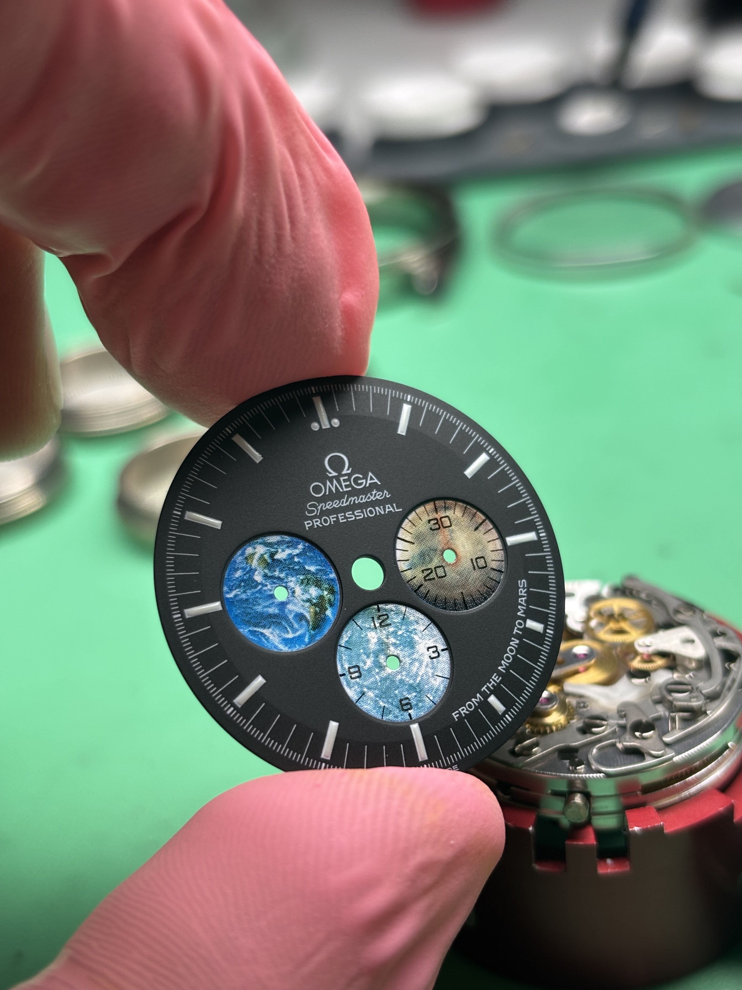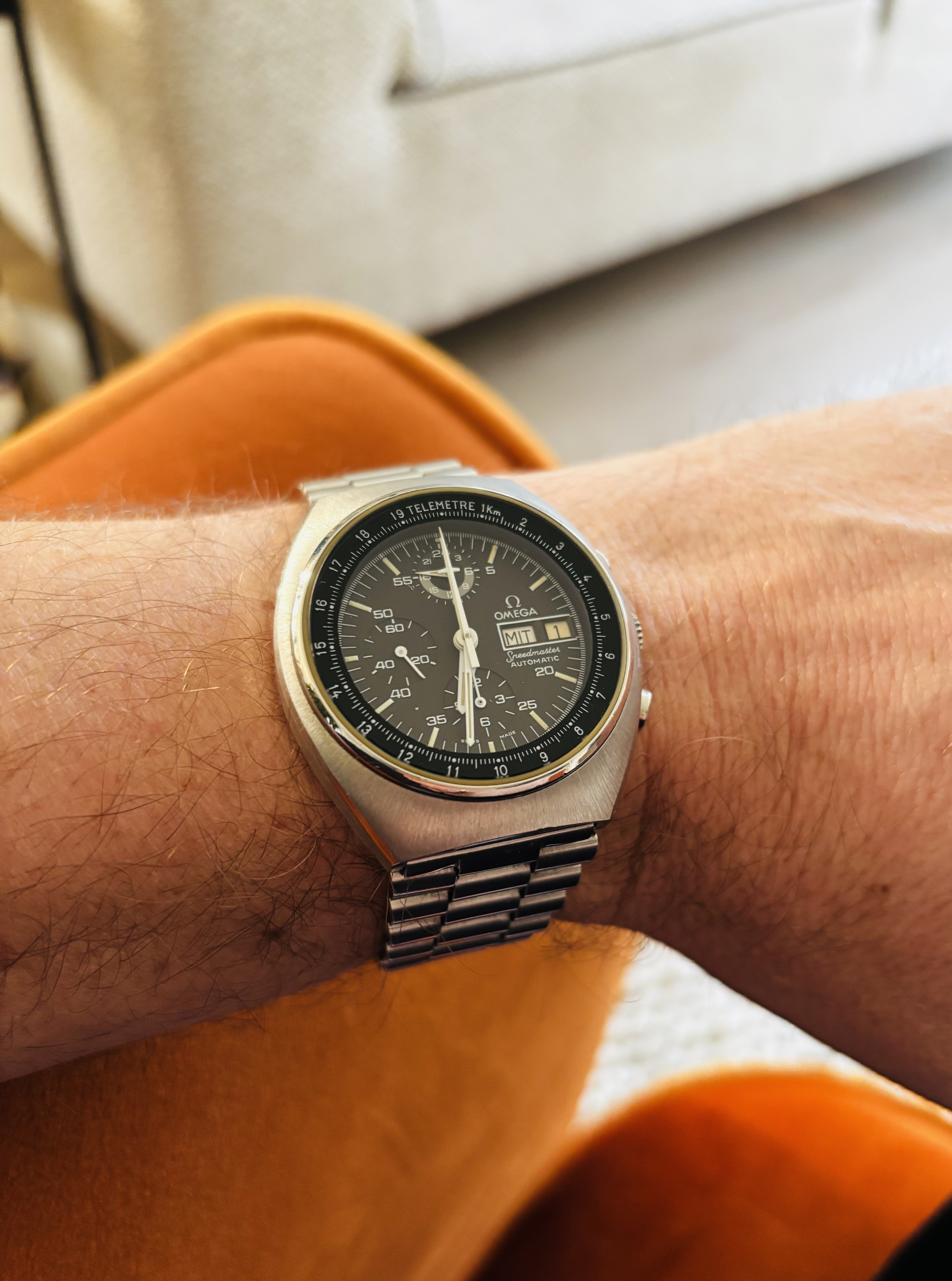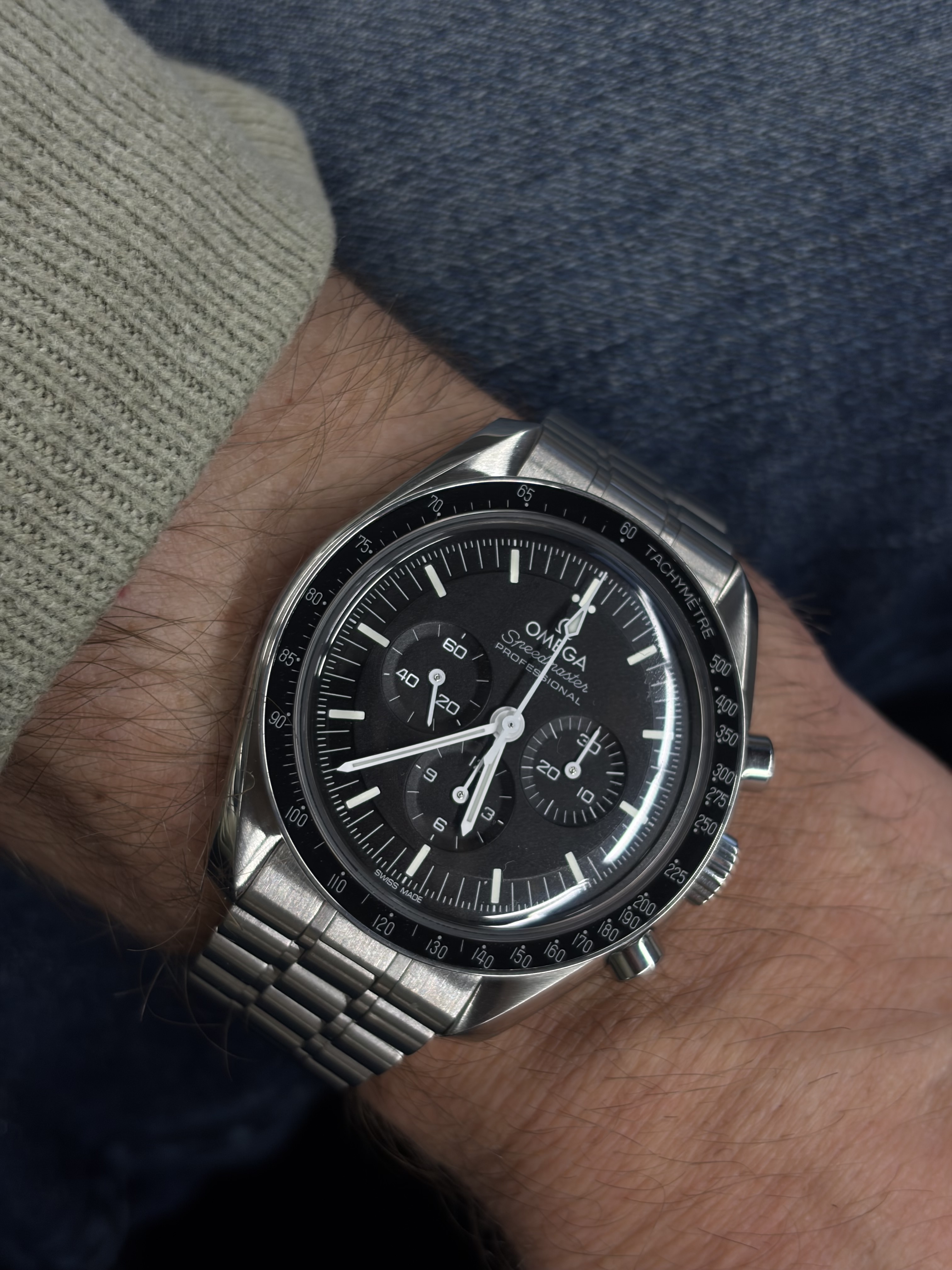 Er zit ook nog een leuk verhaal aan vast. Een goede Duitse vriend van me, fervent horloge liefhebber en bezitter van een grote en waardevolle collectie (PP, AP, Rolex,…), wou absoluut geen Speedmaster. Op een dag zijn we een avondje wezen stappen in Brussel toen het gesprek weer daarover ging. Ik droeg die dag toevallig deze chocolade Speedmaster, heb hem spontaan afgedaan en aan hem gegeven met de woorden “nu is hij van jou, je mag me ervoor betalen wat je hem waard vindt, zonder minimum maar maximaal €3999” (dat was dus in 2019). Daar had hij geen antwoord op en zo is hij dus in het bezit gekomen van zijn eerste en enige Speedmaster.