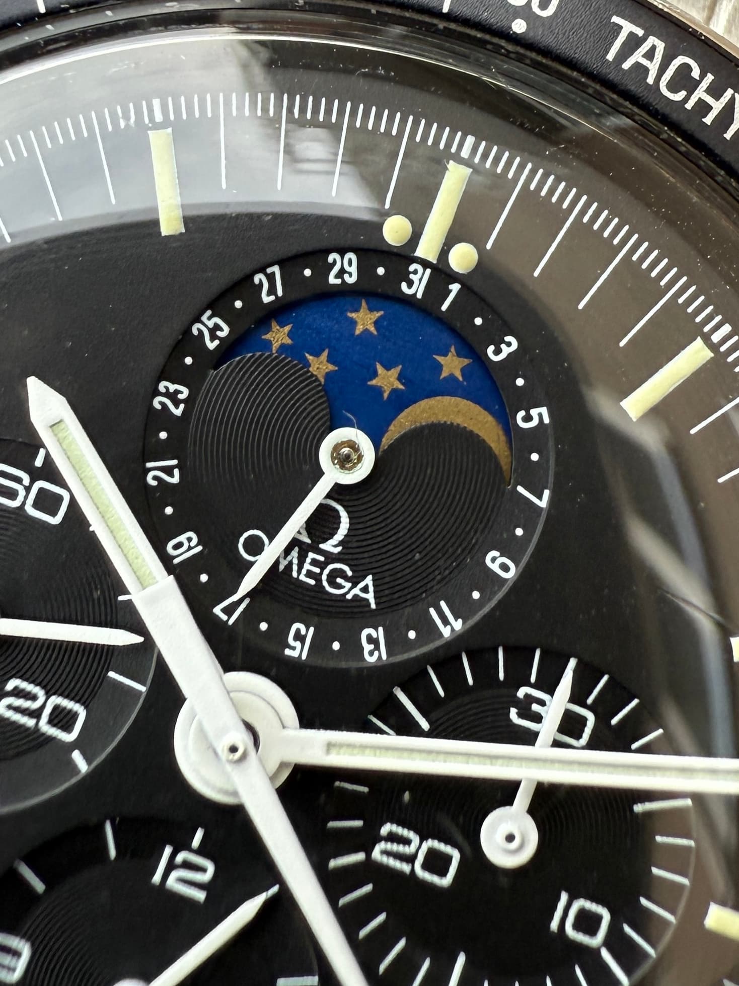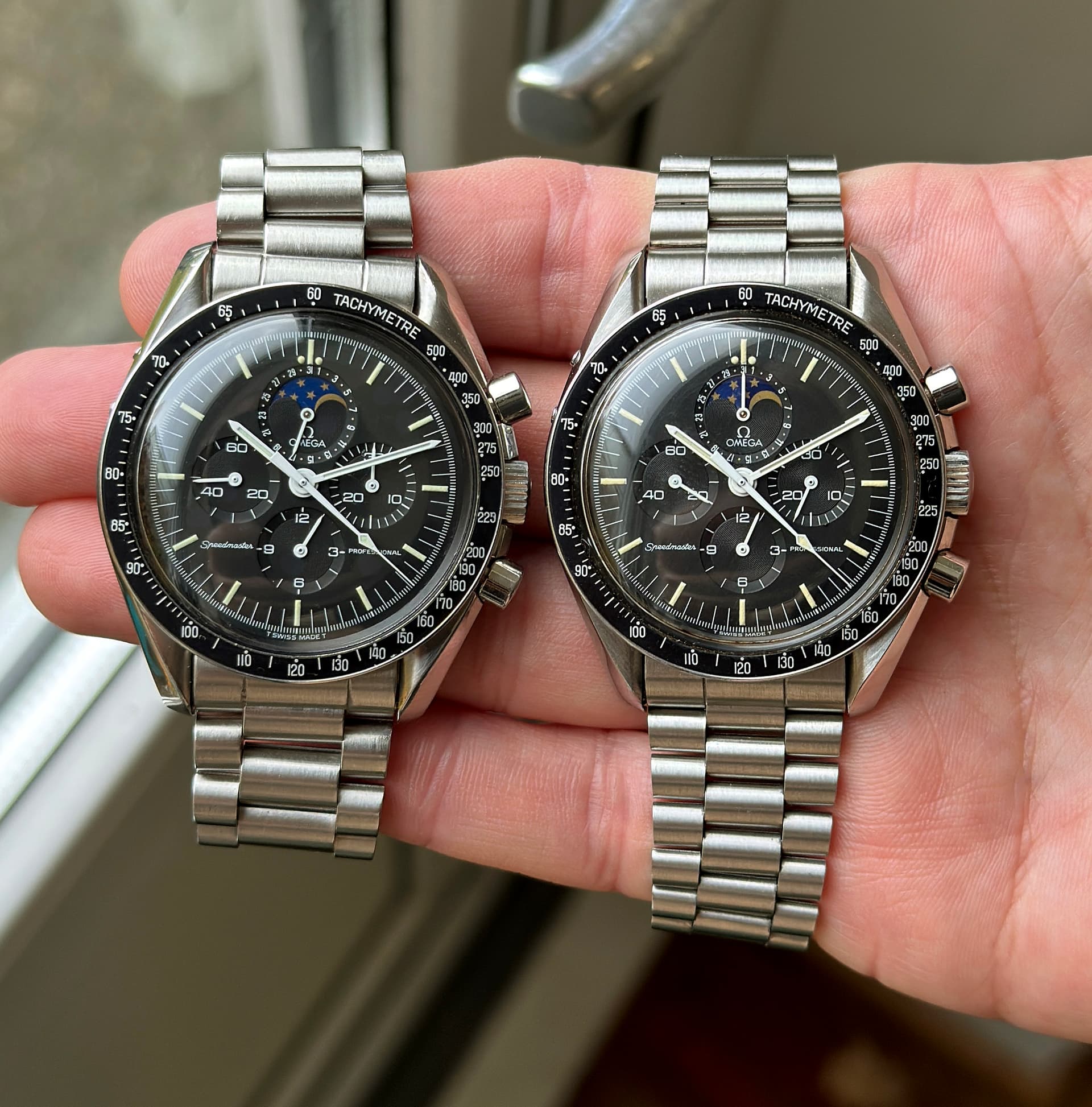 Nog een Speedymoon 345.0809 op de kop getikt! Het is de rechter. Waarom? Nadat ik er dieper ben ingedoken, wilde ik toch graag eentje op een 1447 band en de duidelijkere accentlijnen bij de subdials. Deze komt uit februari 1986, dus vier maanden nadat de Speedymoon uitkwam. Het is geleverd in Duitsland.