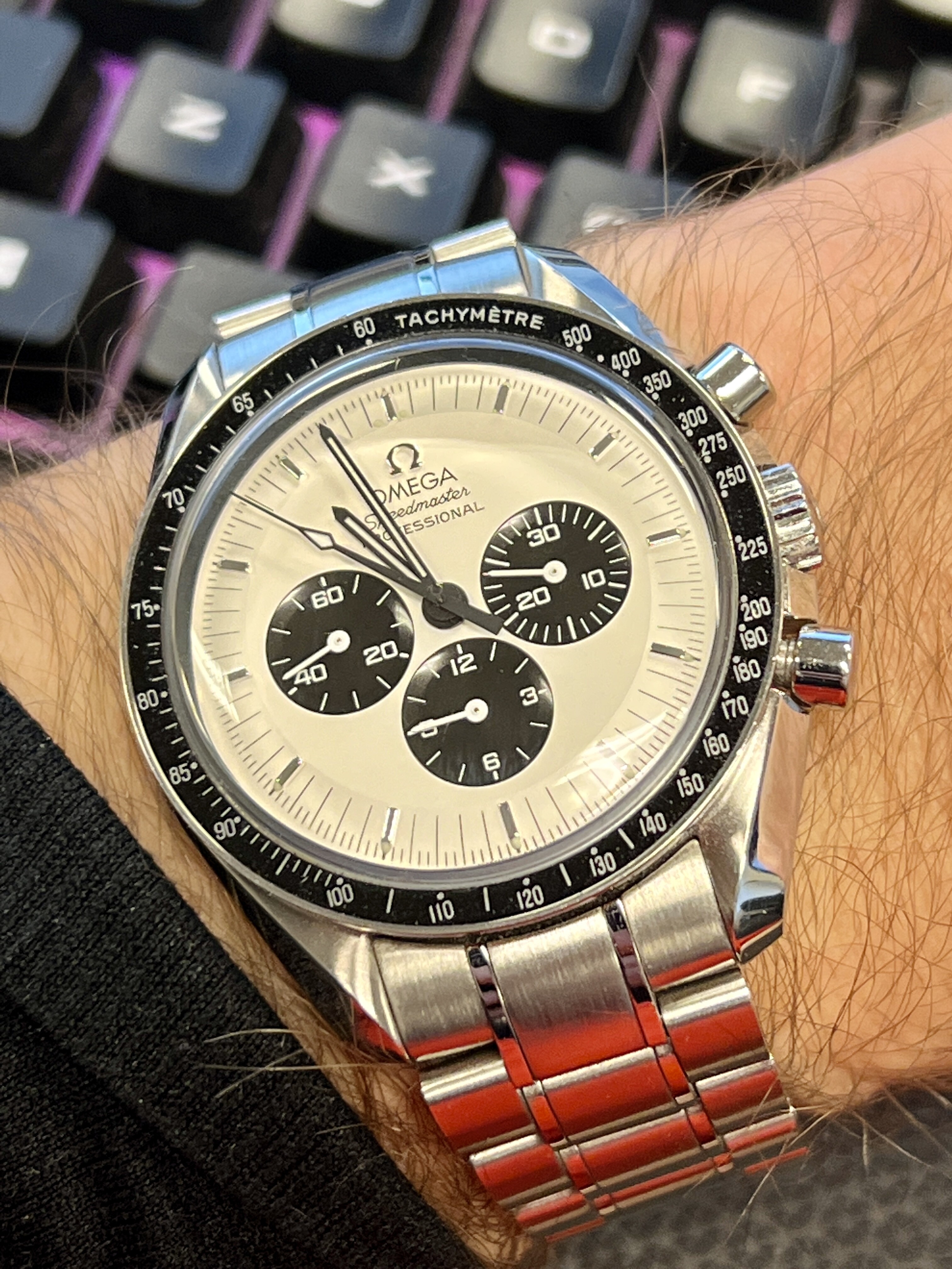 Voor míj pakte het anders uit. Al heel veel speedmasters in handen gehad en altijd de hesalite geprefereerd. Daarom eigenlijk nul twijfel gehad over deze keuze, totdat ik de 3861’s naast elkaar in handen had. Ik vond de saffier meer spreken om onderstaande reden.