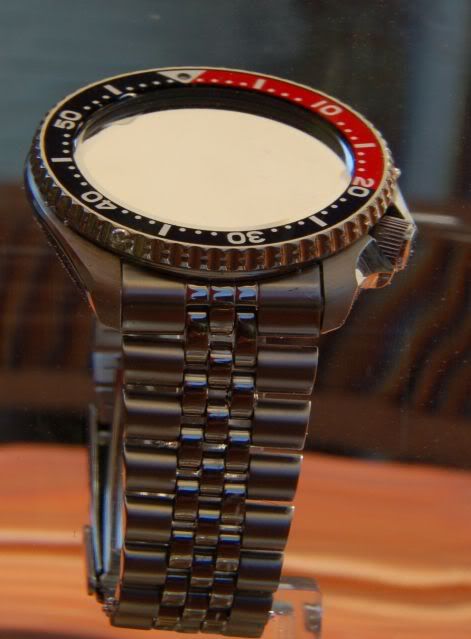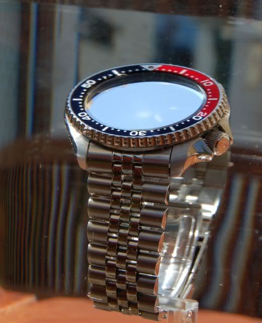 Vanmorgen was ik aan het zwemmen, en viel me weer eens op dat mijn Seiko onder water, bij een bepaalde hoek, perfect spiegelglas heeft. Ik heb dit proberen vast te leggen, zojuist.