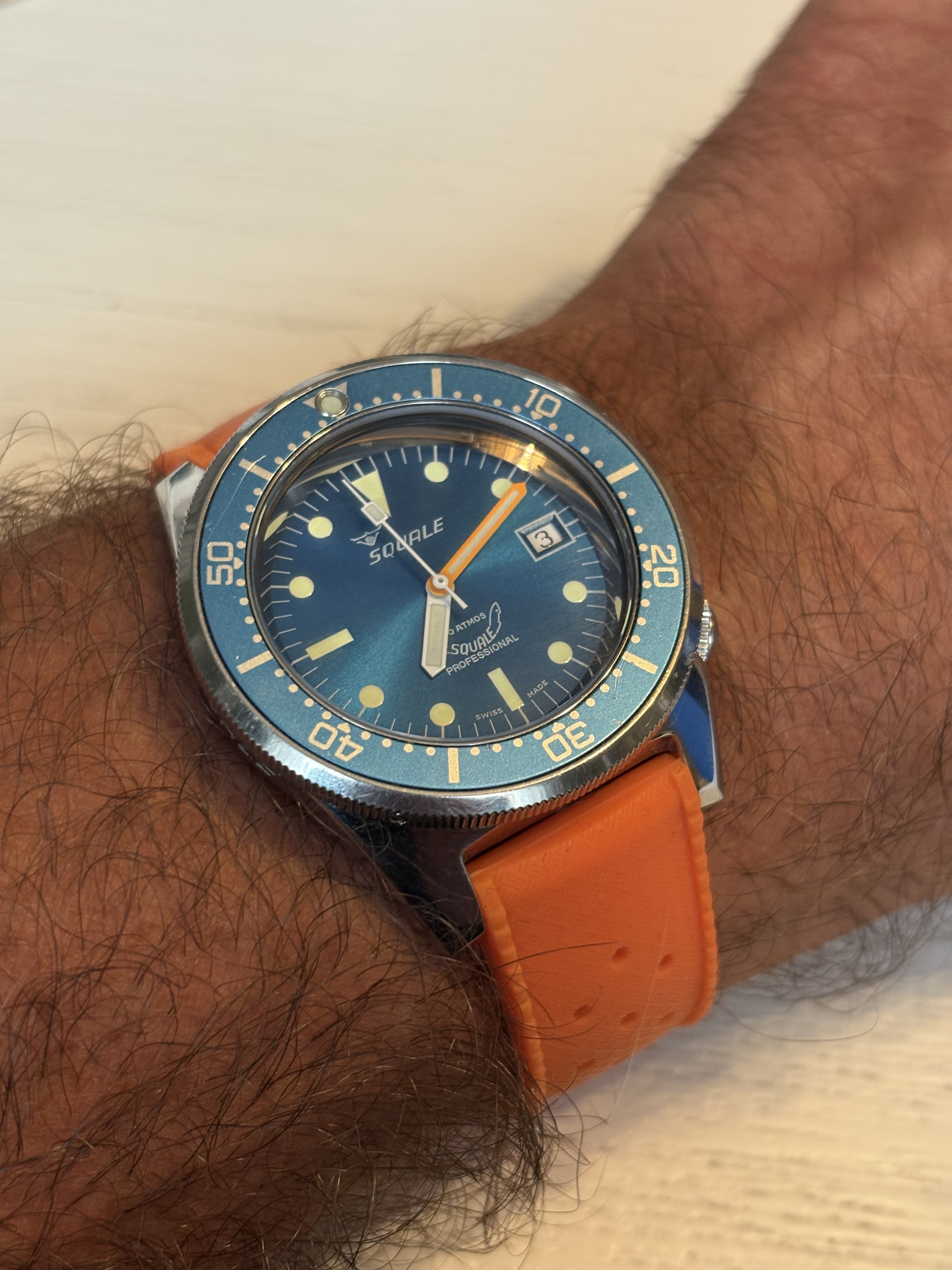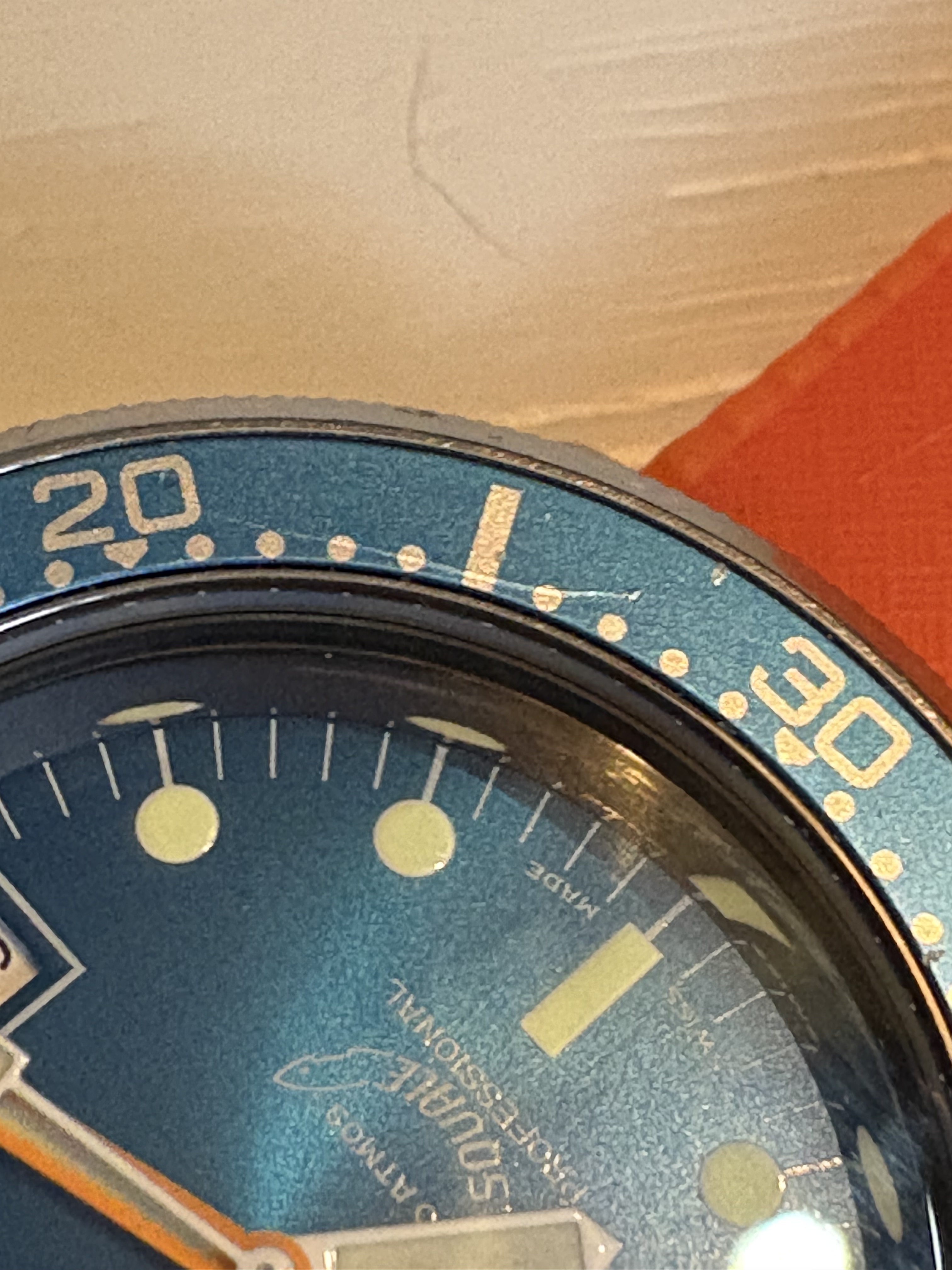 Sporen van bandenwissels en 2 zichtbare krasjes op de bezel insert. Hij glimt en straalt je toe met al een klein beetje zon. Heb het zo goed mogelijk op de foto proberen te zetten.