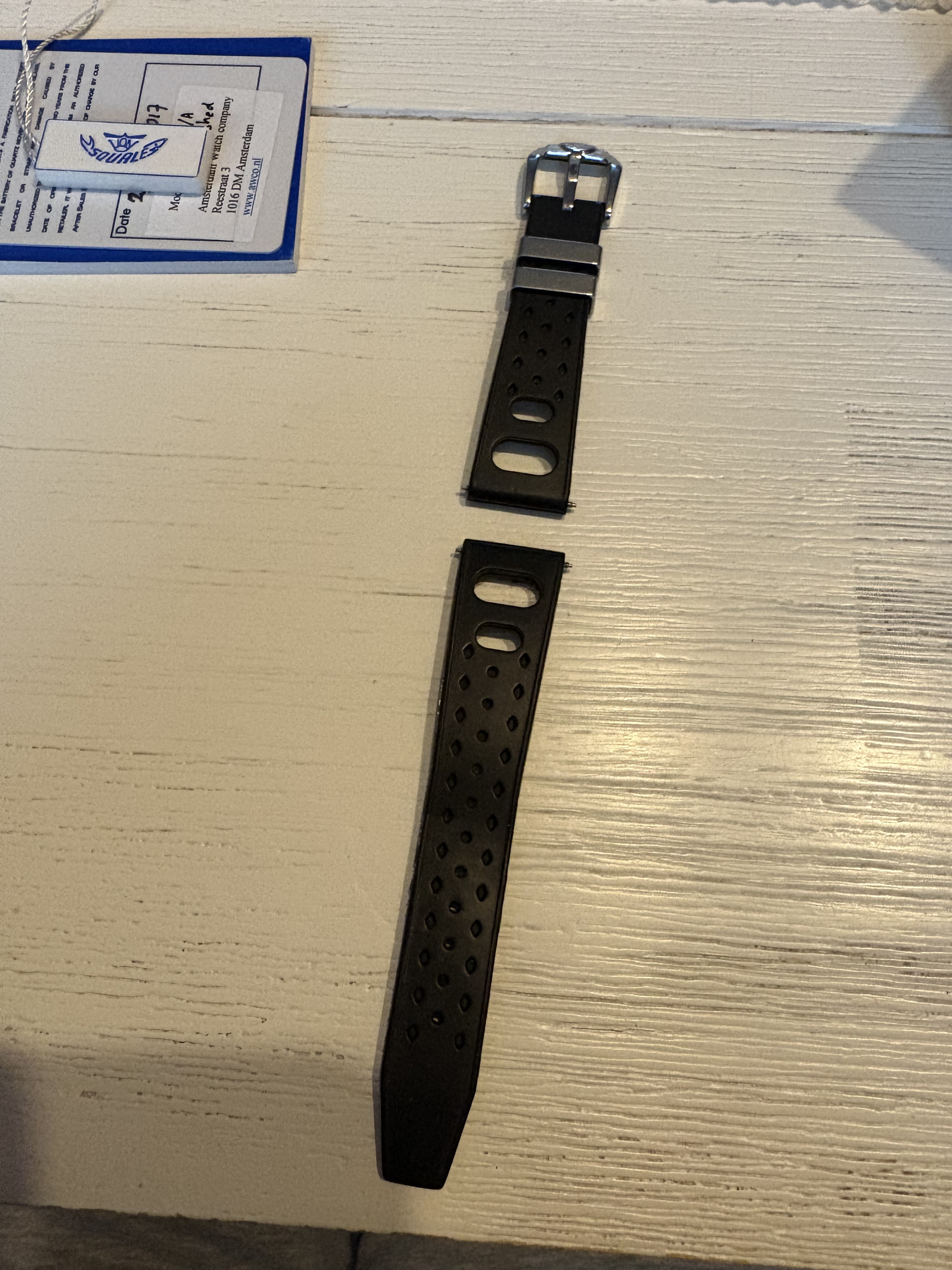 De zwarte originele band is helaas stuk, maar heb de gesp en de goede helft er nog bij.