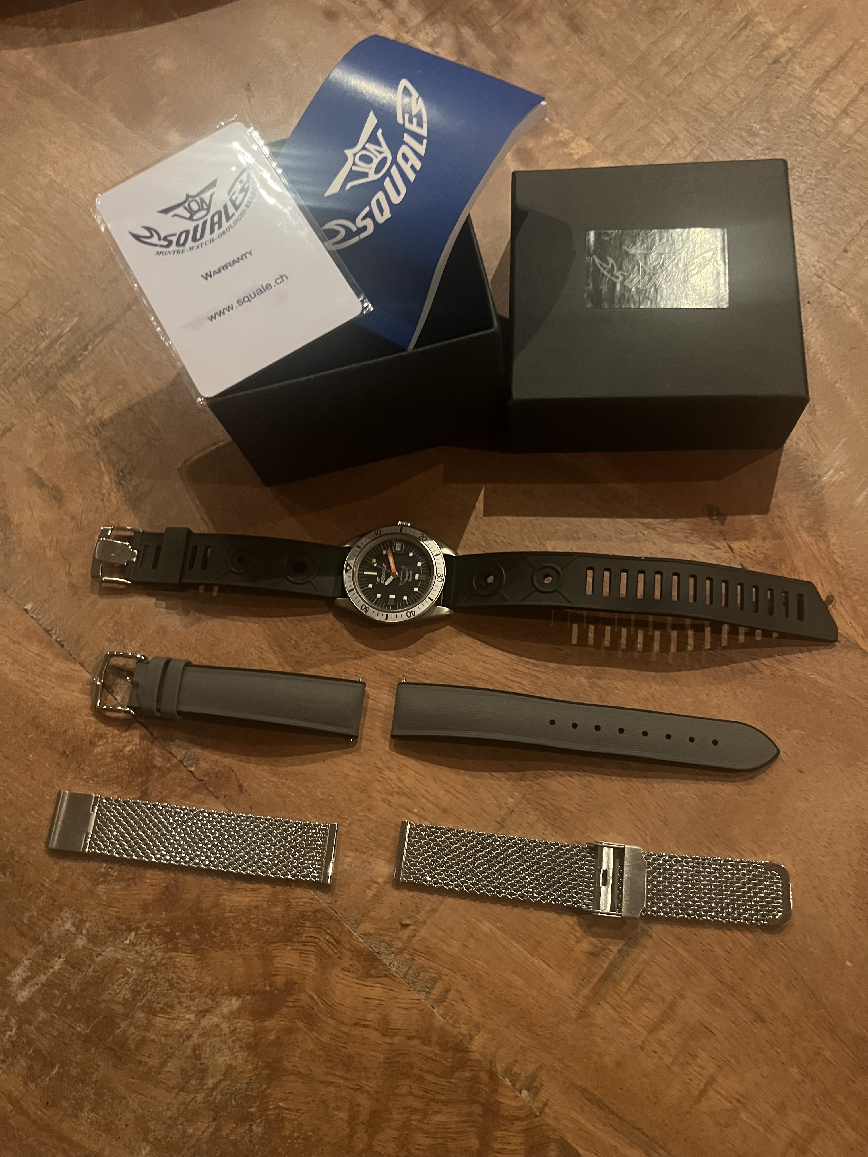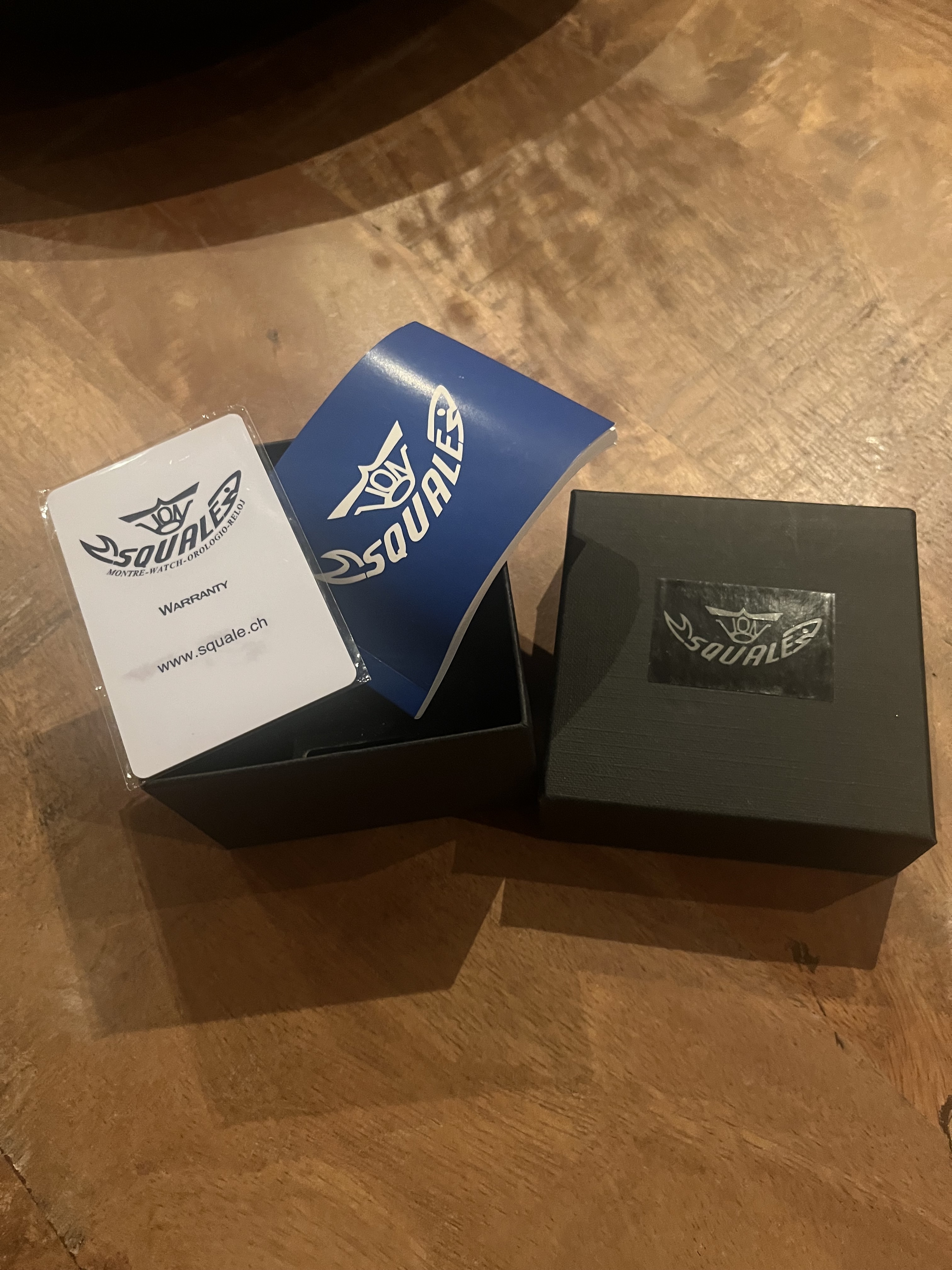 Originele doos en/of eventuele accessoires: komt in orginele doos met orginele Squale rubber strap, een Hirsch Arne performance (grijs) en een mesh band.