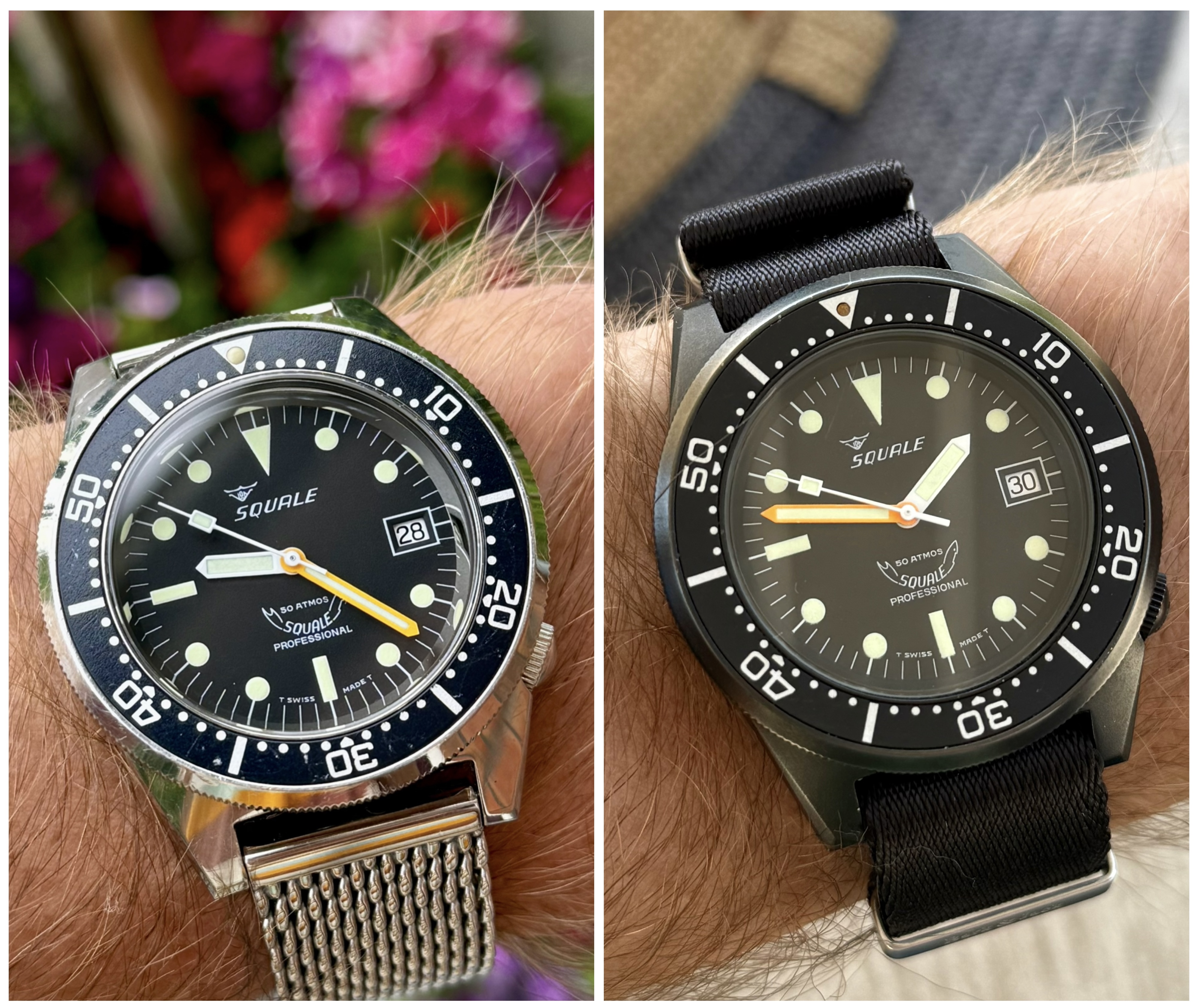 Ik zit zelf nog wel te twijfelen of dit een échte vintage uit de jaren 80 is óf een NOS variant die Squale rond 2008 heeft uitgebracht met NOS onderdelen uit het magazijn. Ik twijfel omdat deze Squale geen serienummer tussen de lugs heeft. Niet dat het heel veel uitmaakt want het is zeker een tof horloge.