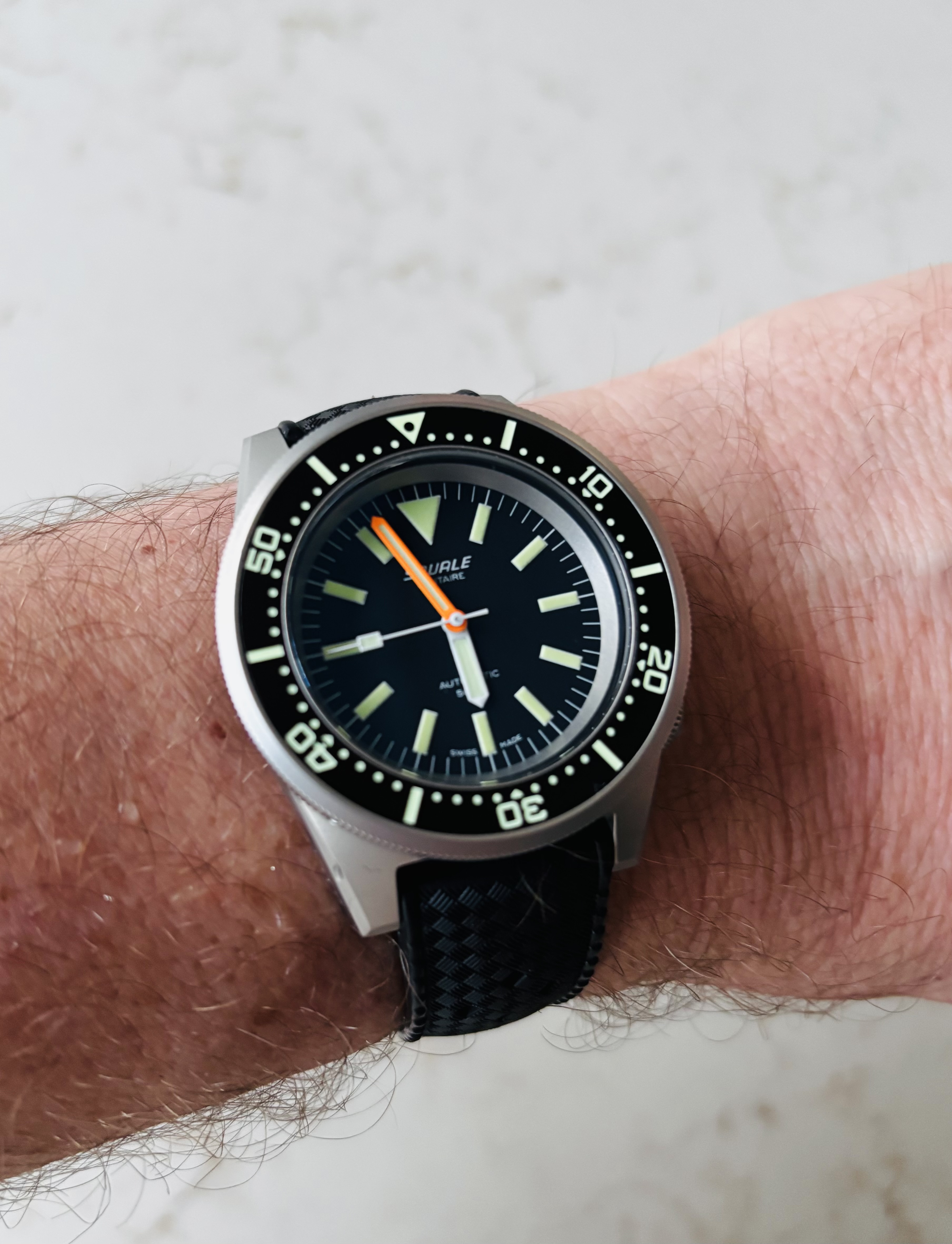 Nou in de zon knalt het ding enorm. Die sunburst en dat kleurtje. De combinatie met de originele rubber band is voor mij ook te veel van het goede. Wel een heel fijn soepel bandje overigens. Dat wat er nu op zit is maar een goedkoop ding. Ik heb al bij Ali gezocht op fkm rubber en er een aantal gekocht.