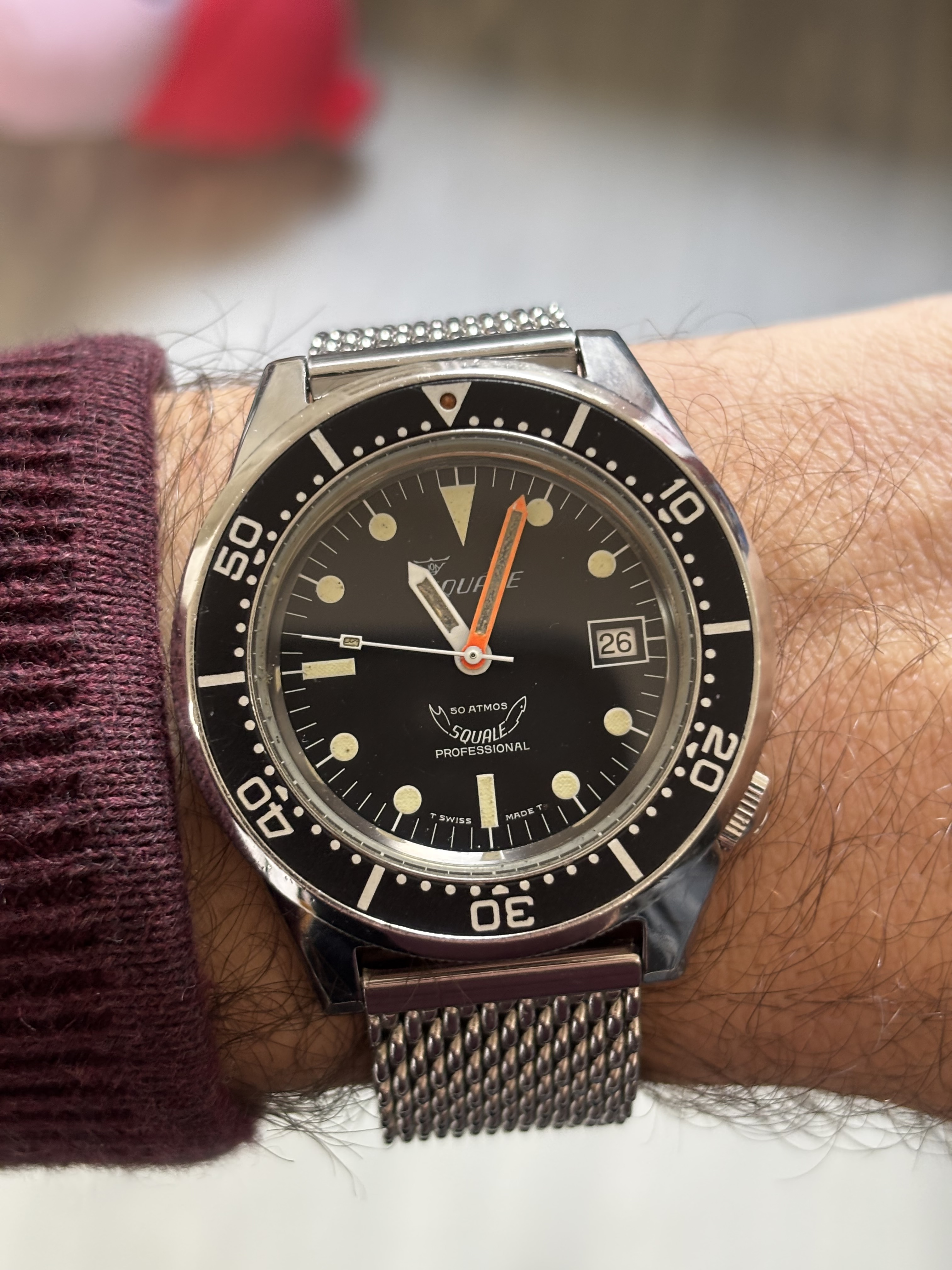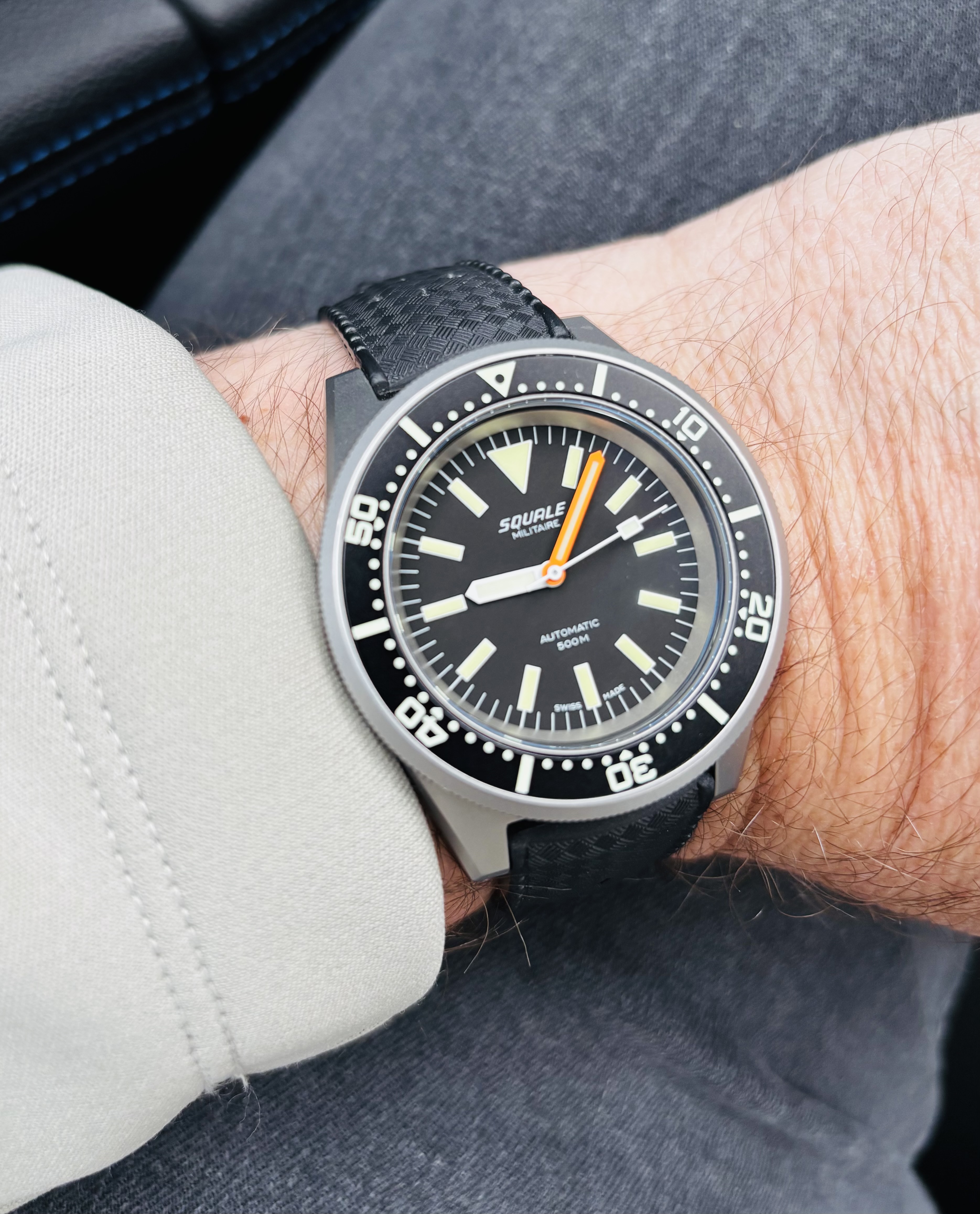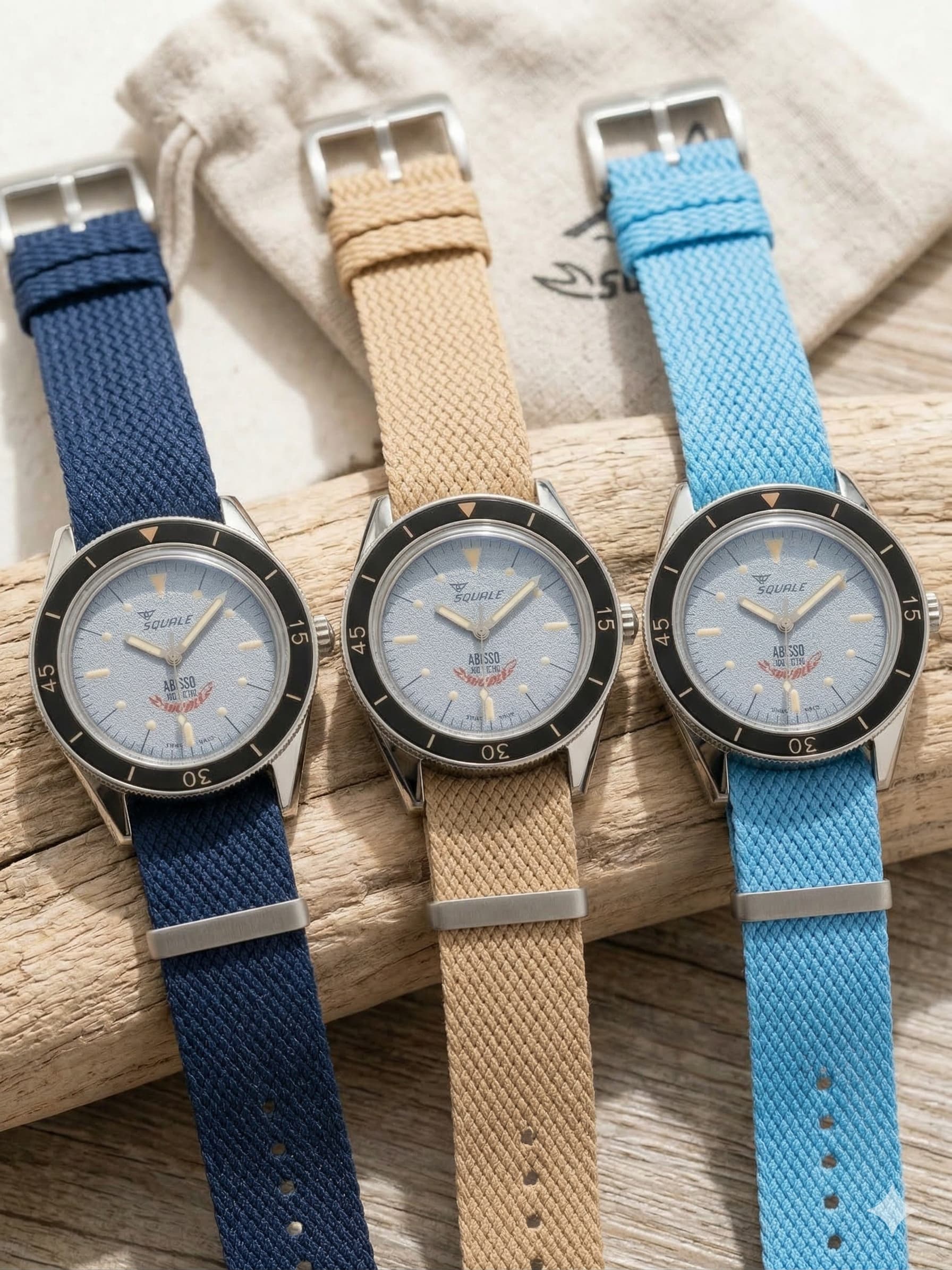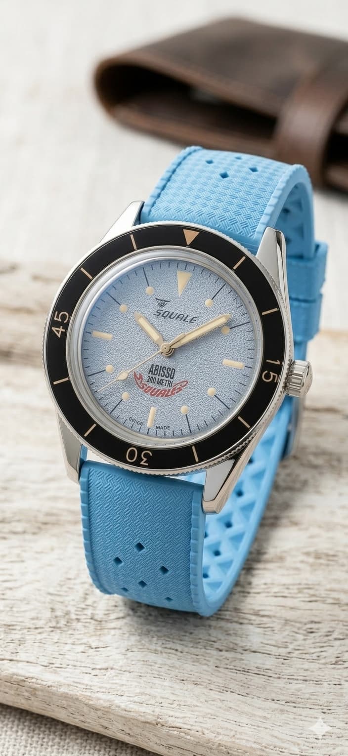 Squalisti, ik heb wat hulp nodig. Ik krijg mijn Abisso niet verkocht en overweeg hem zelf weer te gaan dragen. Maar dan wel met een andere band, die hem frisser en zomerser maakt. Van mij mag de licht blauwe dial wat steviger uitkomen.