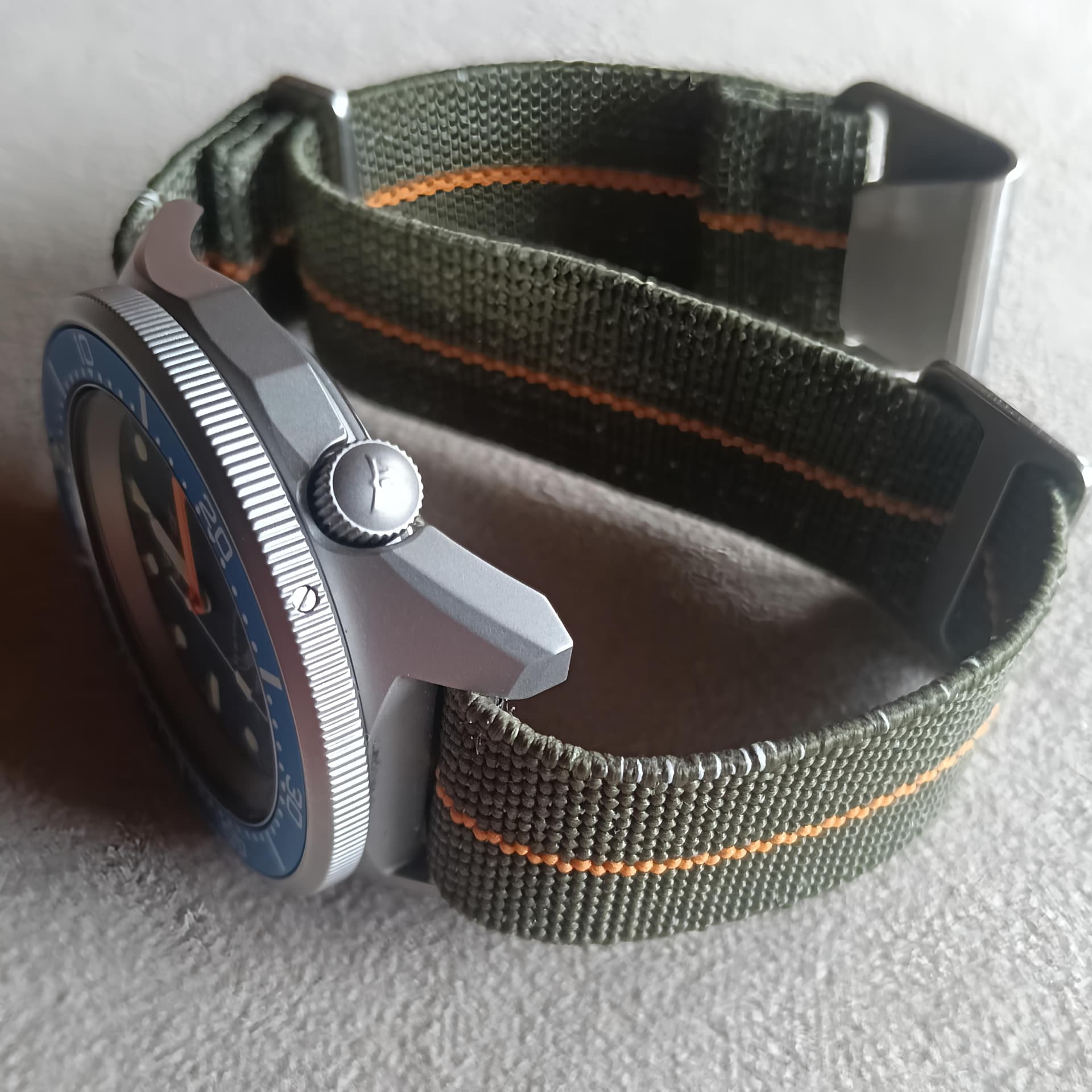 Nu is de bandaanzet 22mm en dat vind ik eigenlijk alleen mooi werken als een band een taper heeft. Een lichte (zandkleurige?) band in de tint van de indices lijkt me mooi. Maar ik heb Gemini wat opties laten maken, zie hieronder. Mesh lijkt me ook mooi, maar is denk ik lastig te vinden met taper. Perlon is een optie. Nato ook, maar dan eerder single pass om het horloge niet te hoog te maken. Rubber kan, met een voorkeur voor tropic. Kortom, keuzes keuzes. Ik denk dat ik eerst de kleur moet bepalen en daarna pas het materiaal. En ik hoop op wat inspiratie of advies hier ![]()