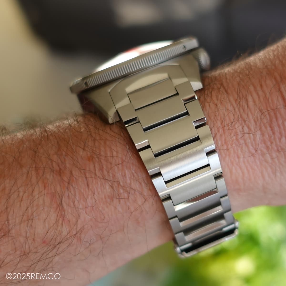 Het uurwerk van deze rooie is een MT5602-U (METAS+COSC), de Harrods heeft een MT5602 (COSC). Verder is de kasaanzet 22mm en bij de rooie 21mm. Het is dus een andere kast, ondanks dat ze op elkaar lijken. Mogelijk heeft dat met het uurwerk te maken, dat de METAS-versie dikker is ofzo. Kan zomaar. Ik zal er in de verloren uurtjes eens induiken.