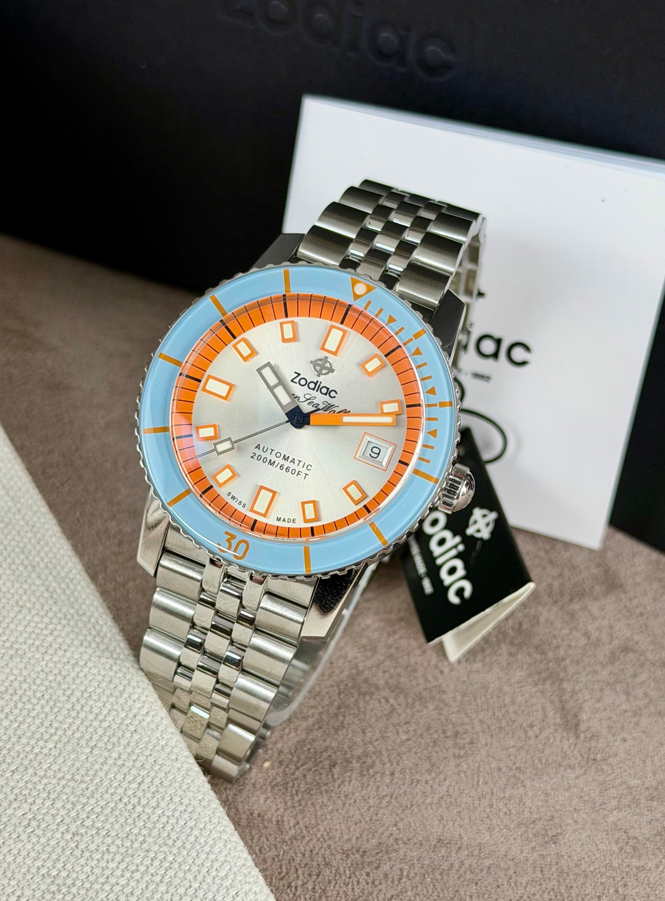 Nog wat anders. Wat vinden we hier eigenlijk van de Zodiac Super Sea Wolf, m.n. in deze ‘Gulf’ kleurencombi? Zie je hier niet veel op het forum, ergens vind ik ze toch wel gaaf.