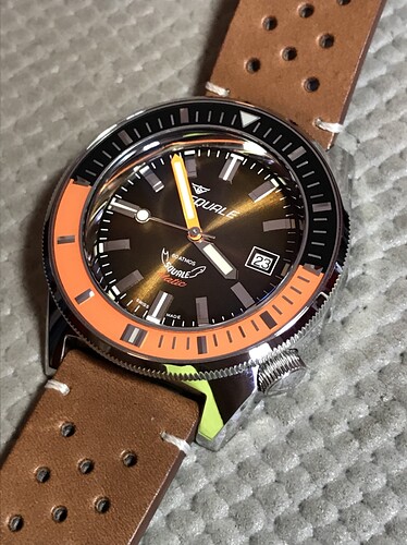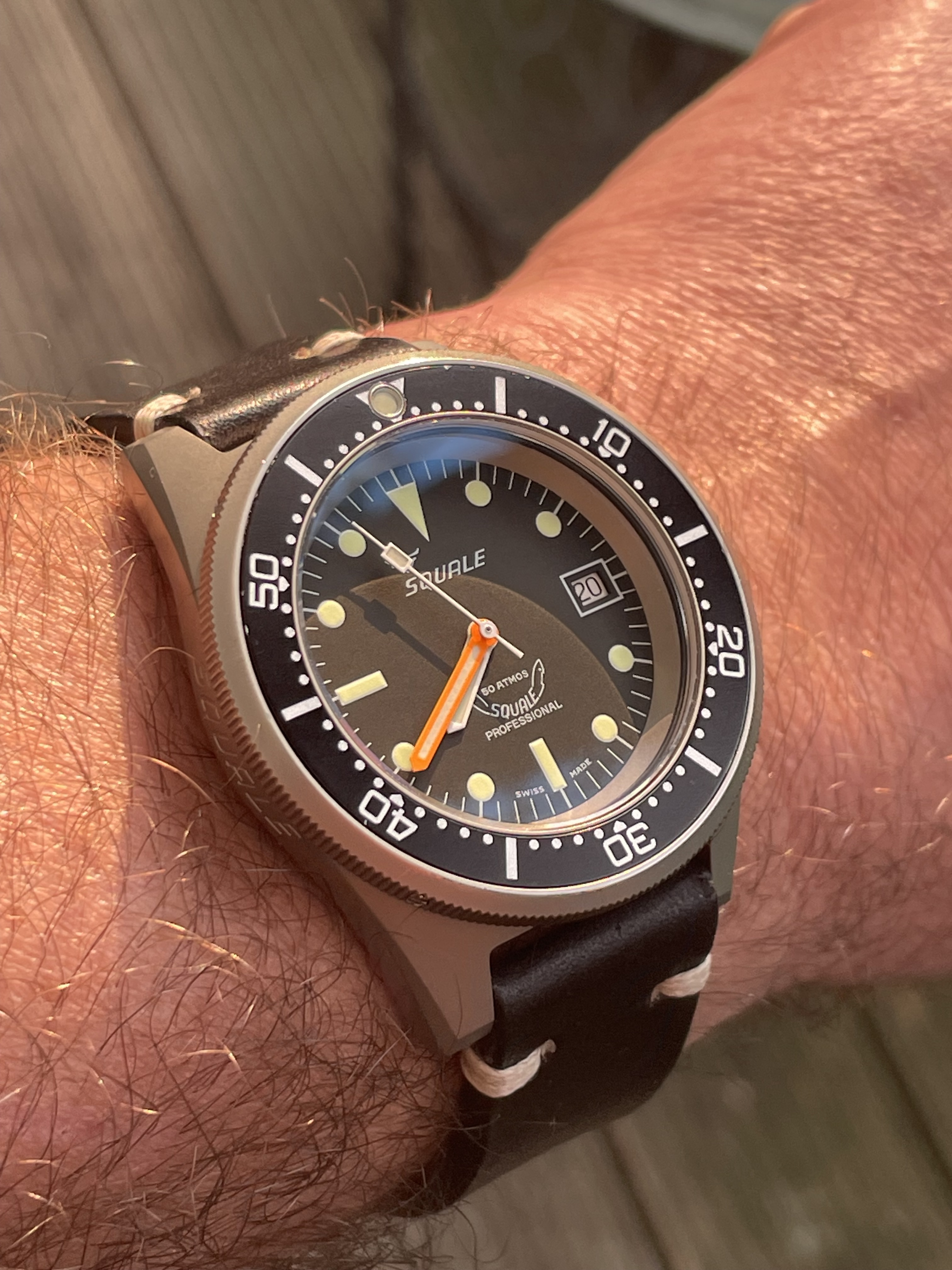 Over deze pindakaasbruine Matic niets dan lof, een heerlijk frisse uitstraling. Vind alleen een leren band niet oké (op geen enkele duiker), dus ik zou er een zwarte rubberen band aanhangen. Zo dus …