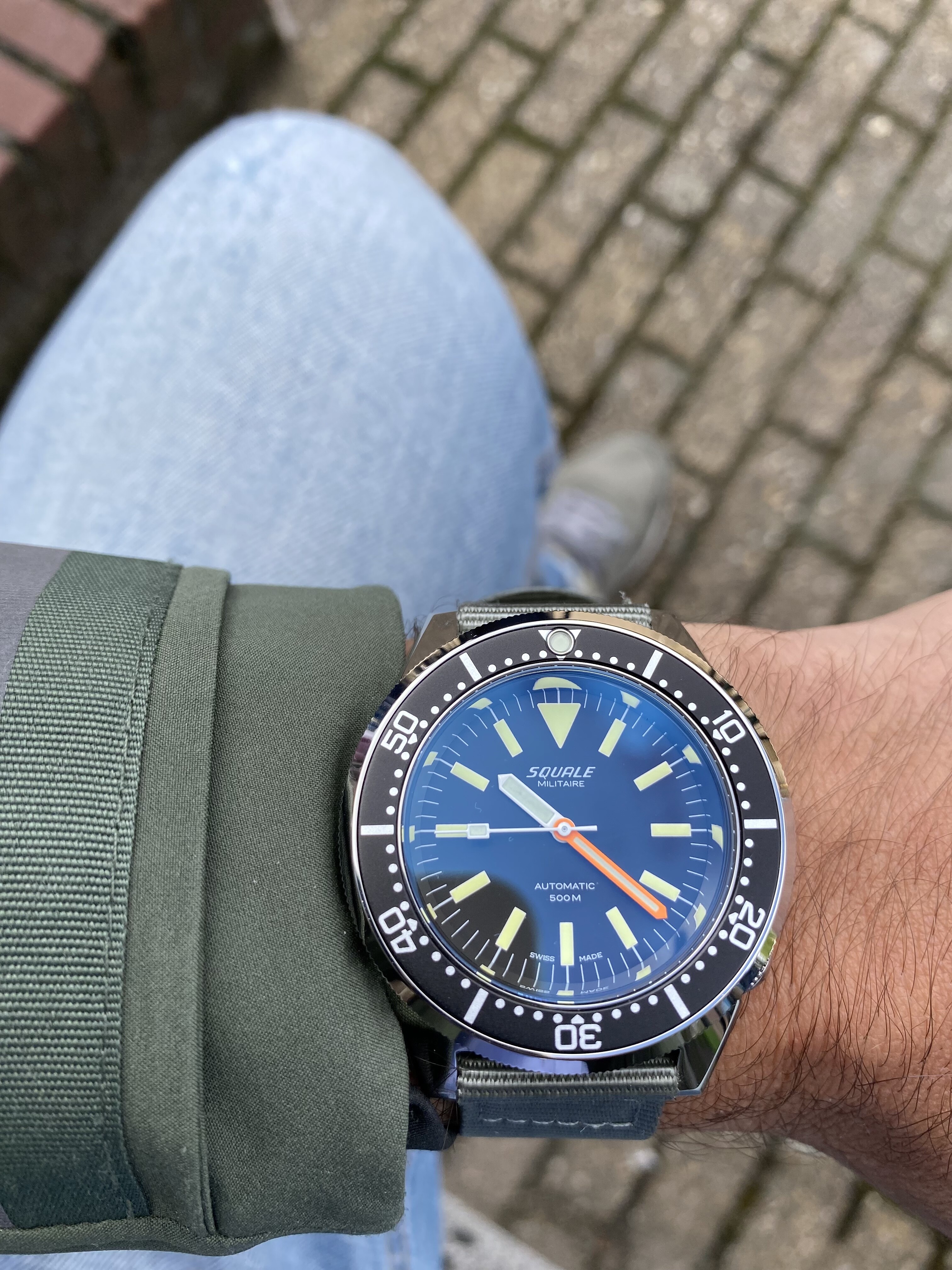 … een 1521 classic stond al in het winkelmandje, met de lollige logo’s op de wijzerplaat en de ronde uurmarkeringen, oh én met datum. Of deze ‘militaire’ die toch ook wel érg mooi is. Damn. Nou ja, ûhm van harte met je nieuwe Squale en bedankt voor de aankomende slapenloze nacht.