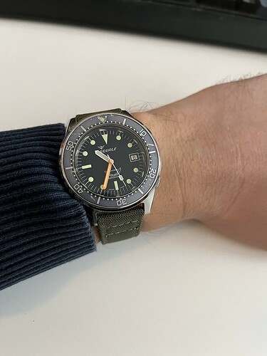 Nu op een groene canvas band, staat hem ook wel aardig vind ik, maar veeeeul te stug