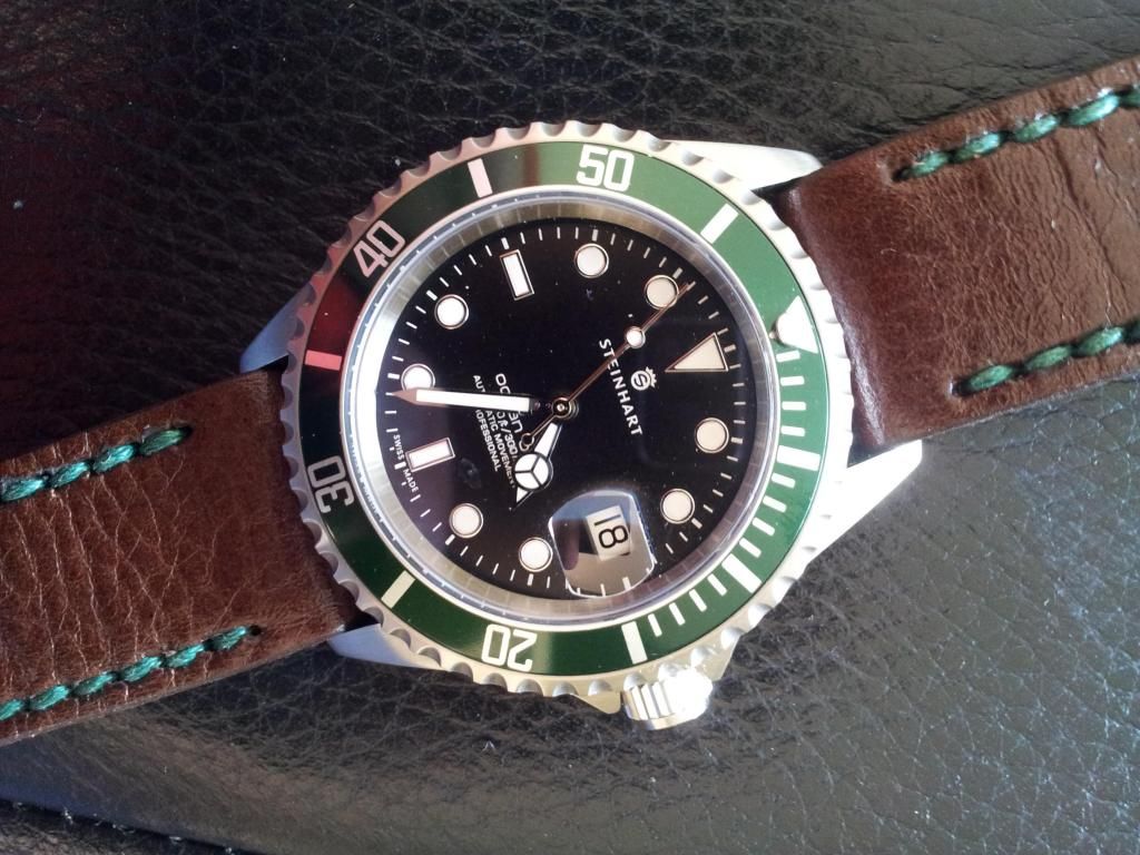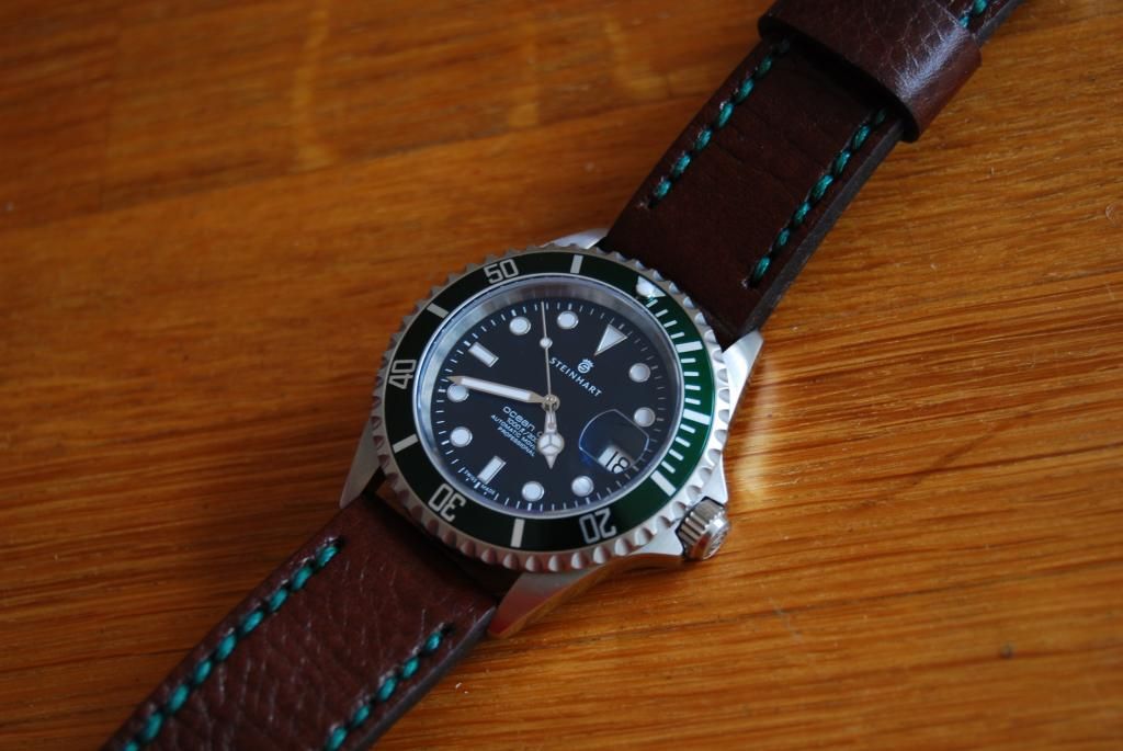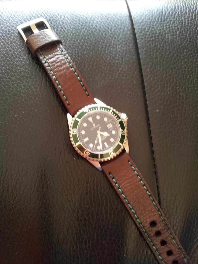Ik had aardig wat wensen voor dit bandje. Donkerbruin vintage leer, groene garen, afwijkende lengte van de band 115mm en 70mm. Met een breedte van 22mm lug naar 20mm gesp. En dikker bij de kast 4 à 5 mm, aflopend vanaf ter hoogte van de gesp naar 3mm. Eén losse keeper.